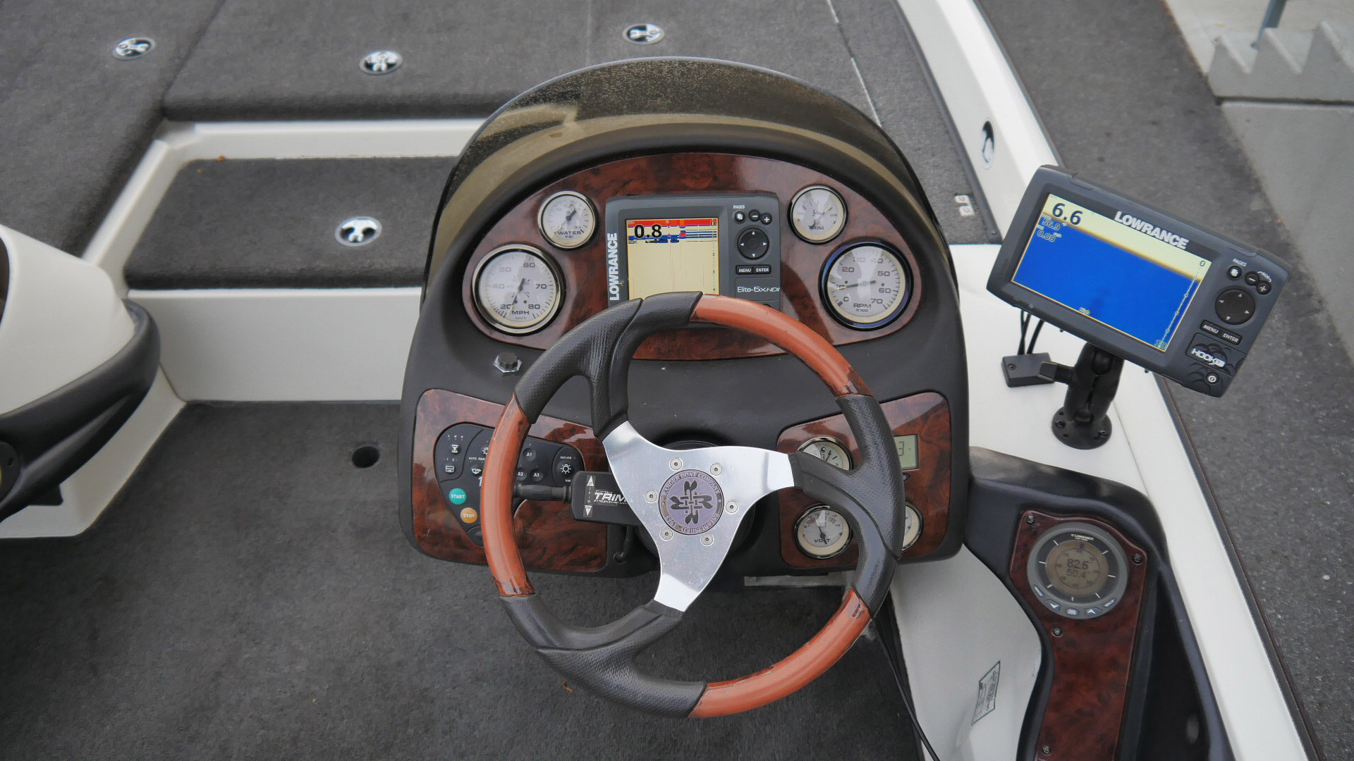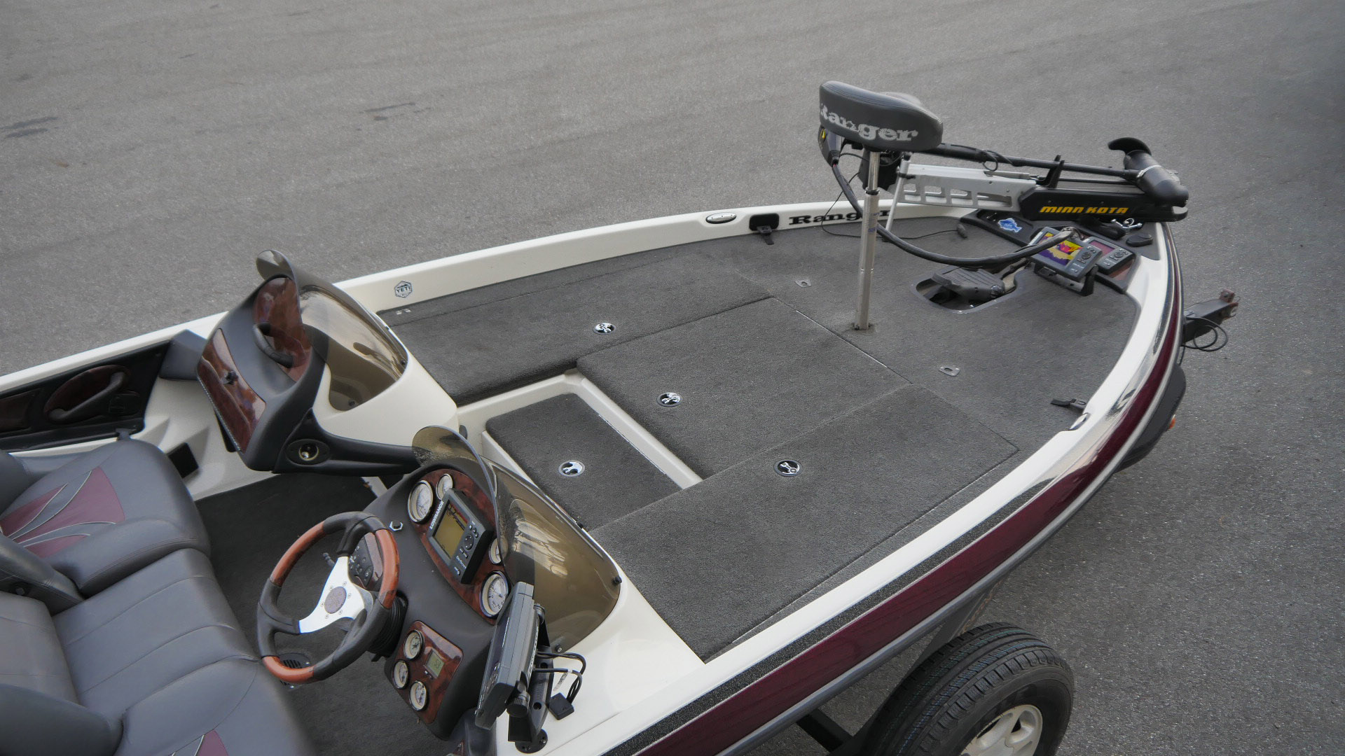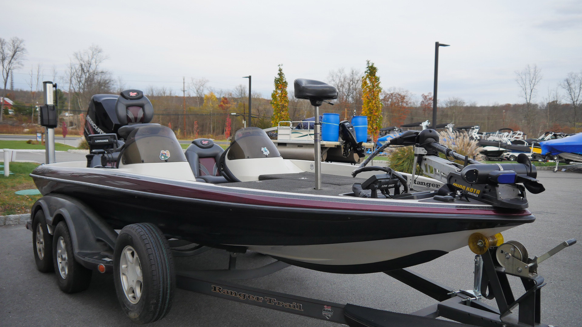 This incredibly clean 2004 Ranger Comanche 519 VX is up for sale at our dealership from the second owner. Our team has handled all service, maintenance, and indoor off-season storage for the last 7 seasons. All around the boat is in great shape, with only some minor fading of the metal flake gel coat, below the waterline. (typical for metal flake boats) The boat comes with a bow-mount Minn-Kota trolling motor and a Lowrance fish finder, as well as two units at the dashboard. There is a hot foot throttle control installed, Minn Kota Talon shallow water anchor, and Full snap-on mooring cover