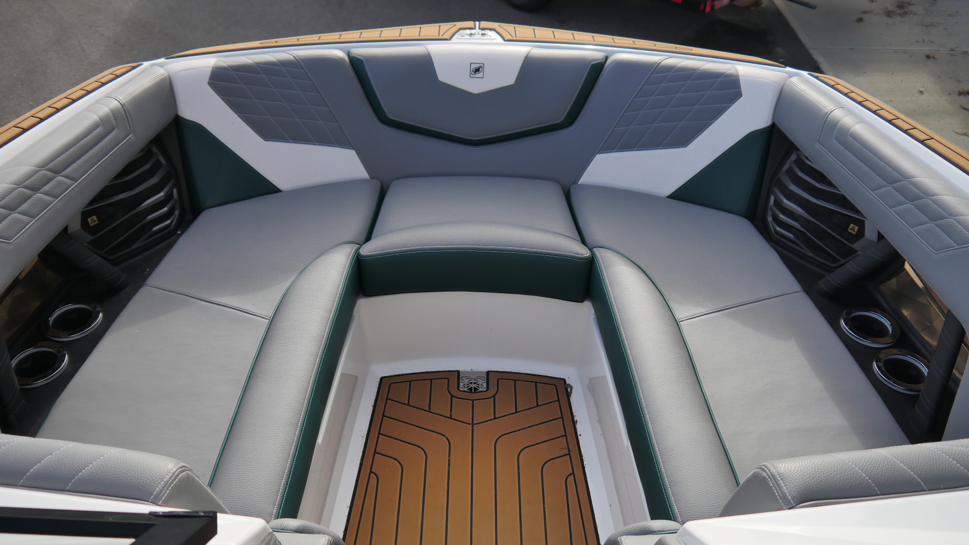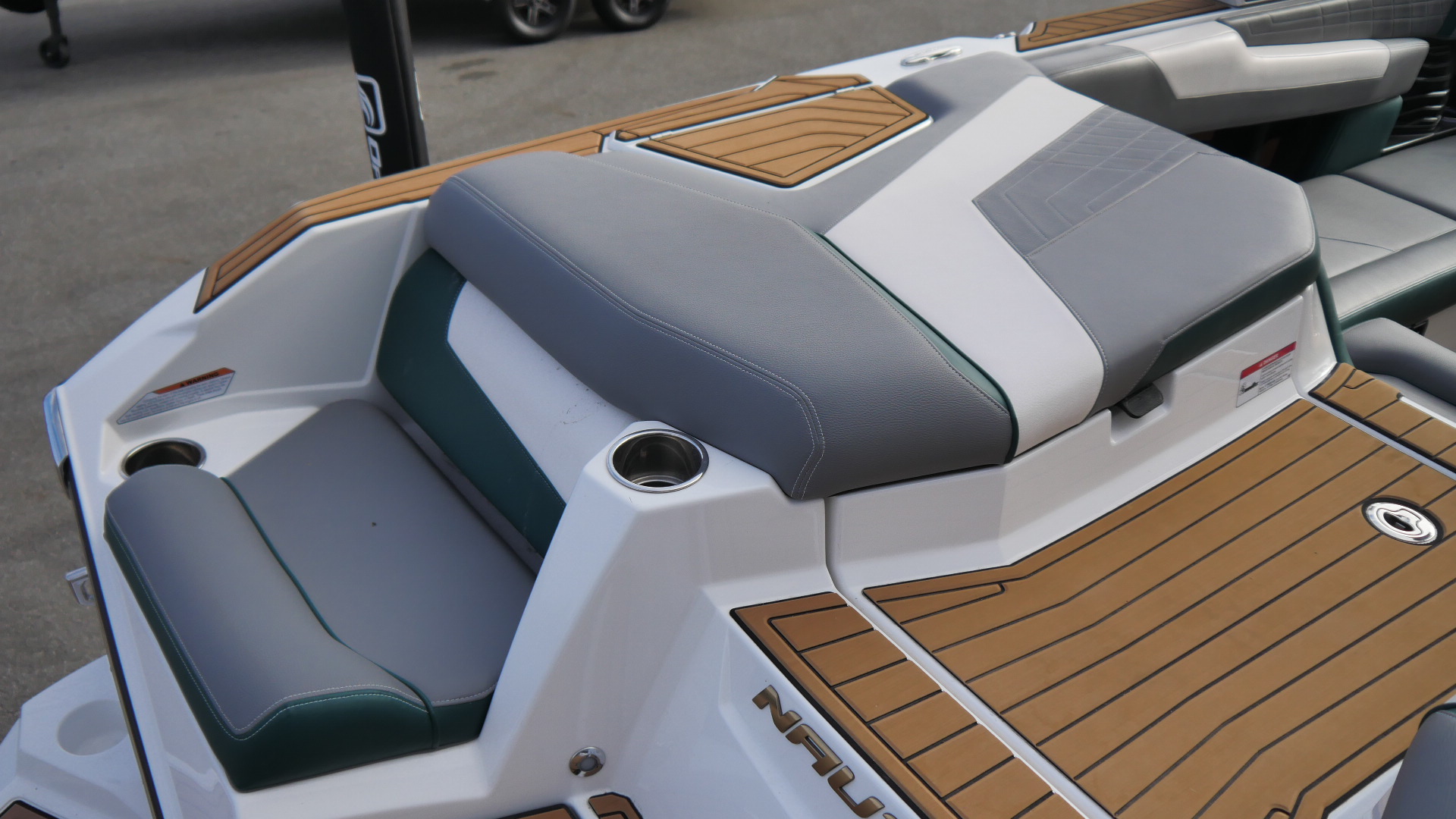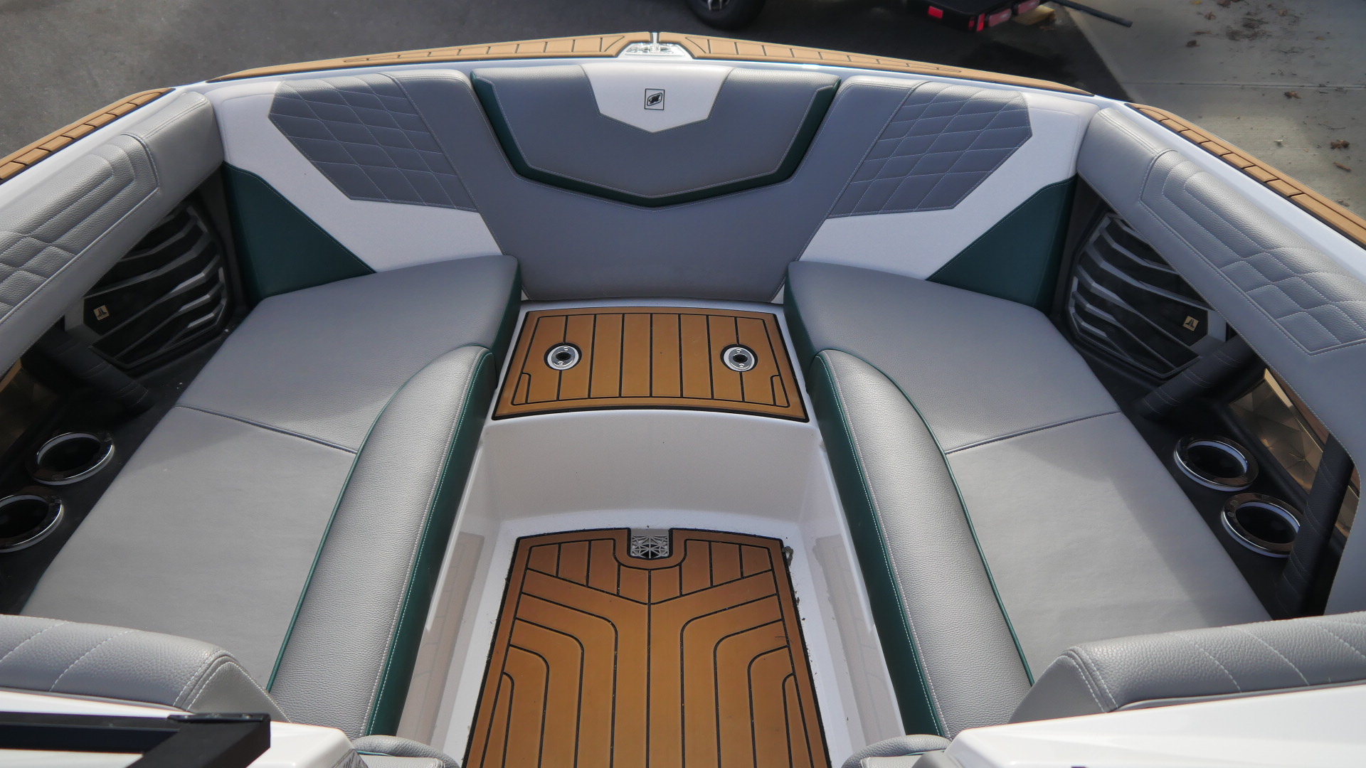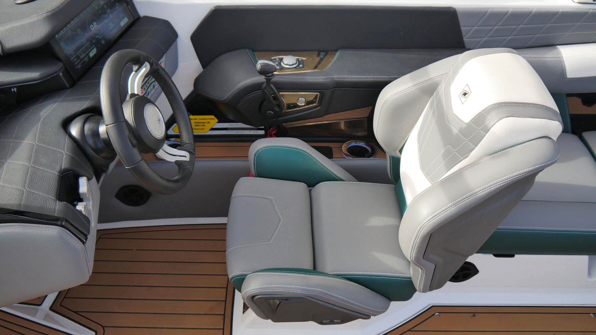 Inside, the G23 surrounds you in premium materials and comfort. The Green and Grey interior contrasts beautifully with White accents, detailed with precision stitching. The Mocha Nauteak non-skid flooring adds warmth and grip, combining style with function for a true luxury feel.
