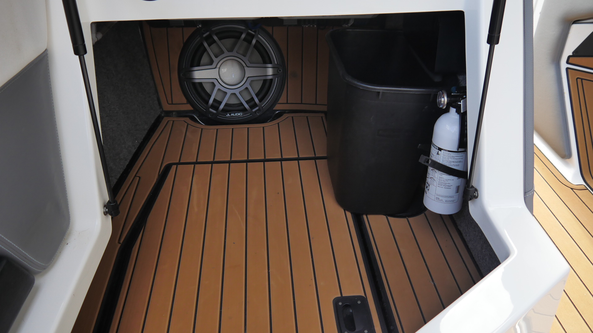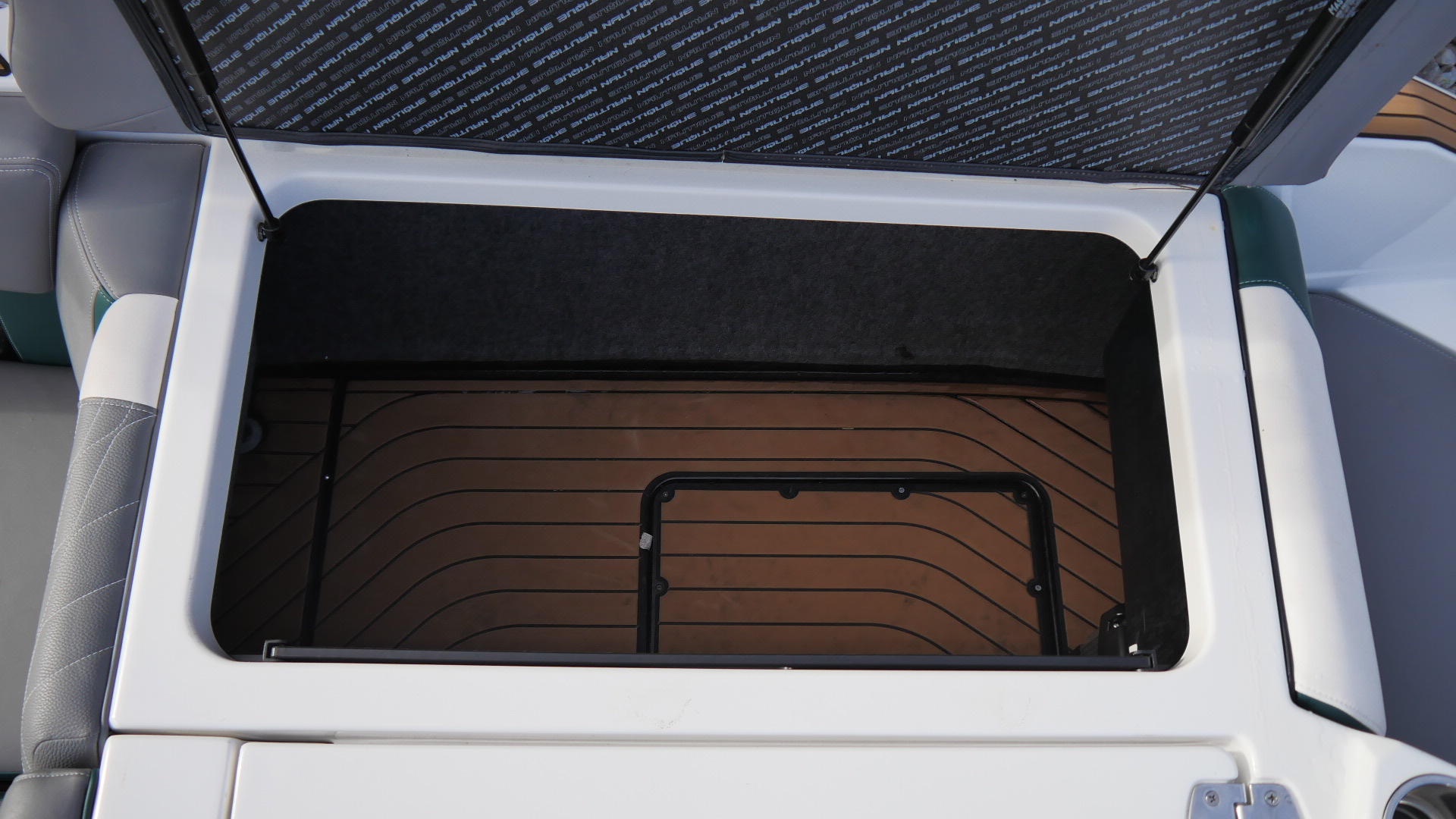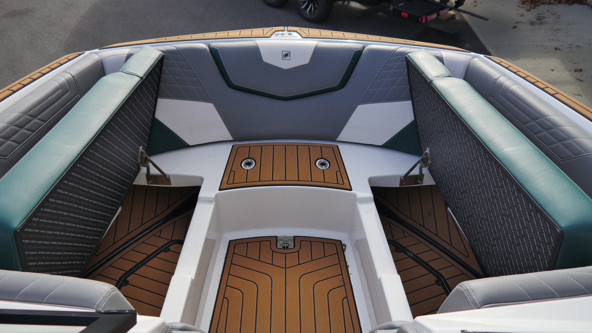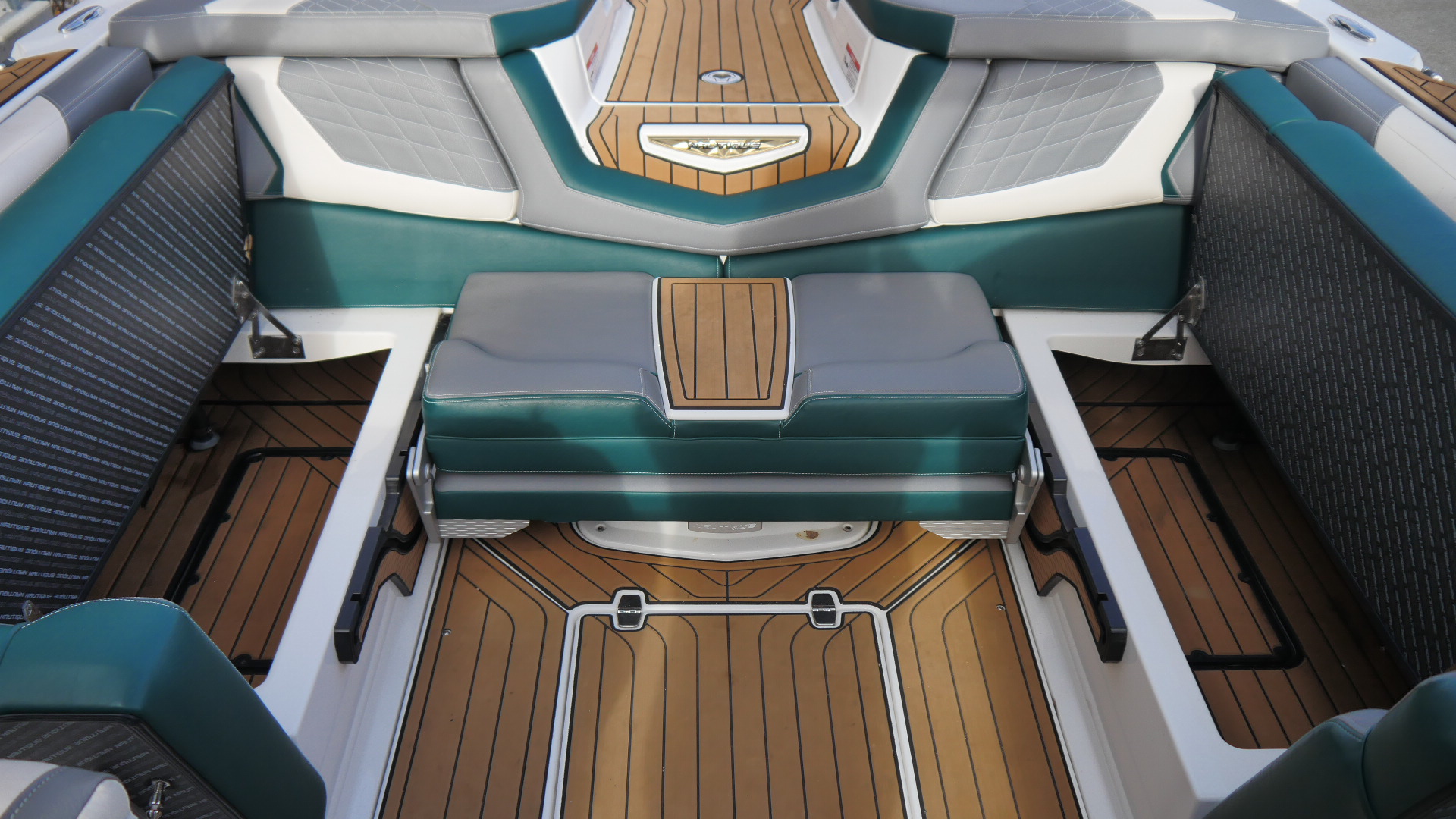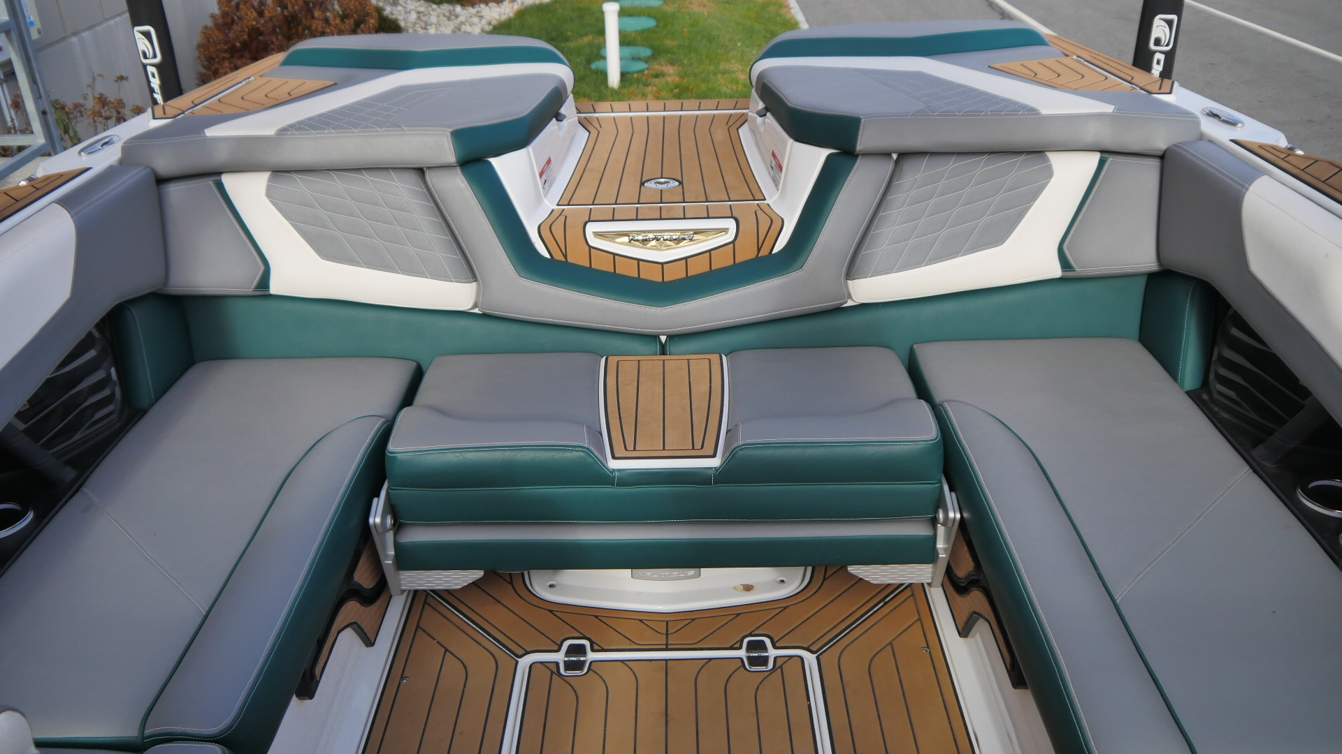 Inside, the G23 surrounds you in premium materials and comfort. The Green and Grey interior contrasts beautifully with White accents, detailed with precision stitching. The Mocha Nauteak non-skid flooring adds warmth and grip, combining style with function for a true luxury feel.