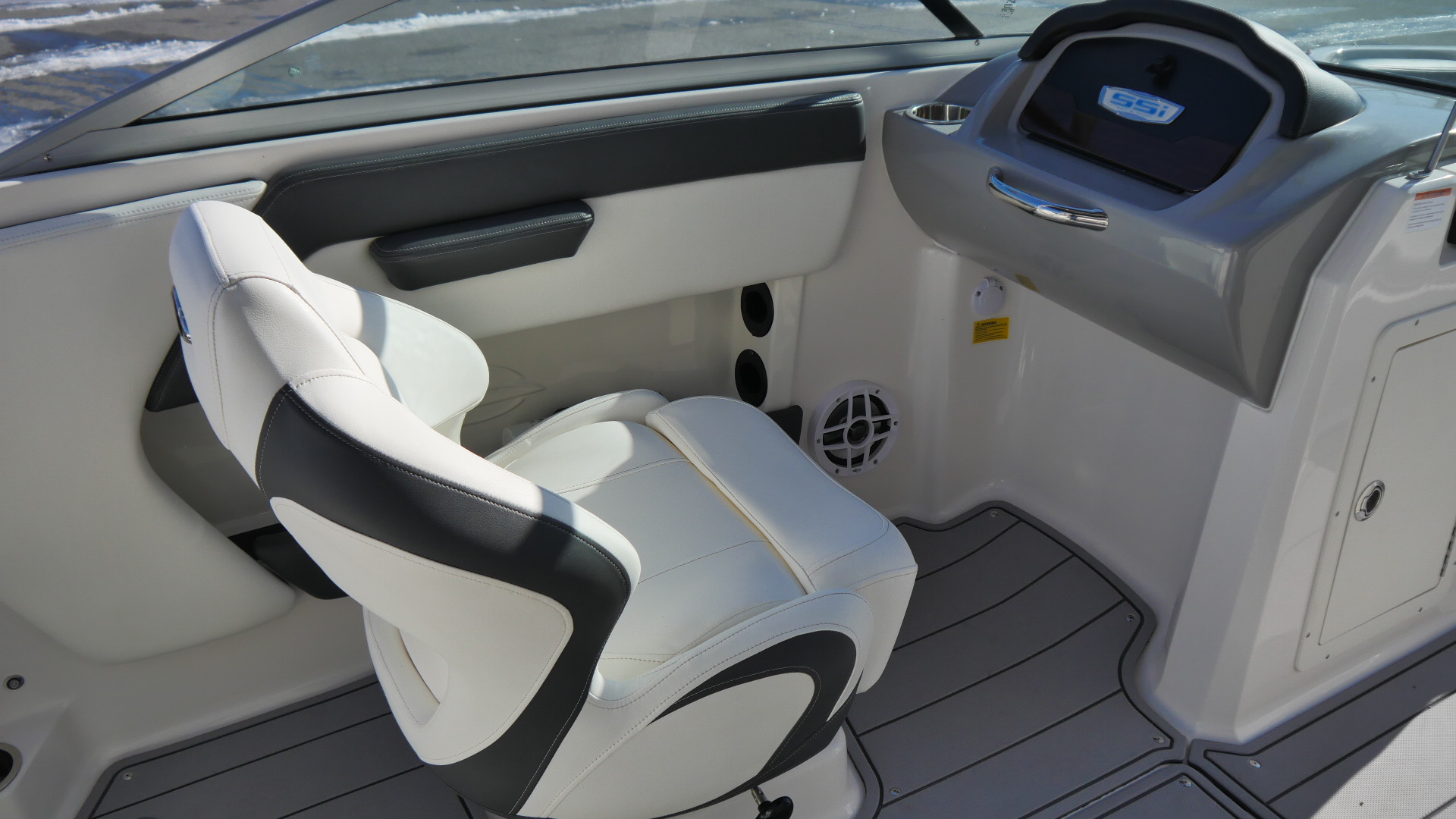 Comfortable flip-up bolster seating provides flexibility for sitting or standing while maintaining excellent visibility at the helm.