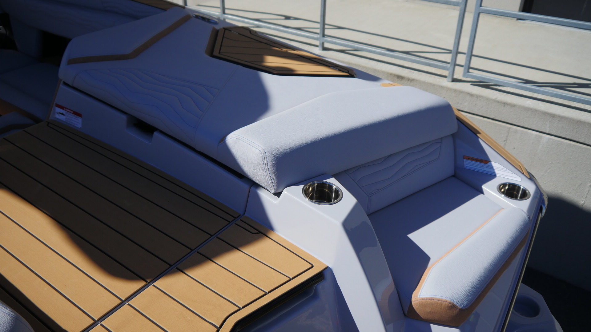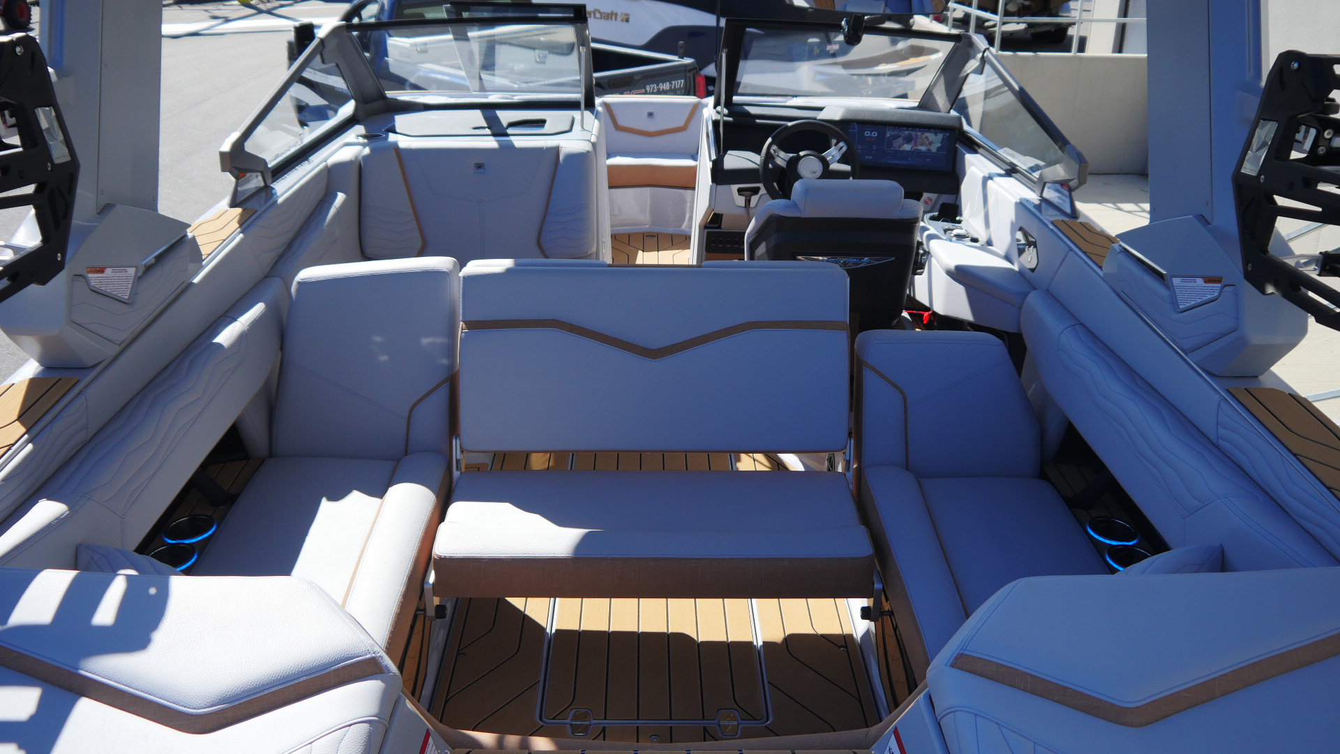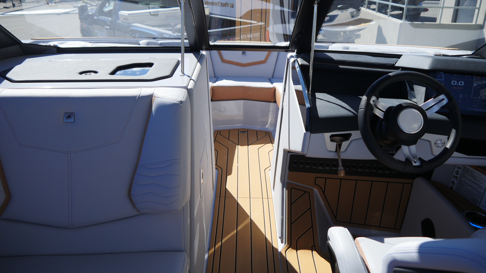 Inside, the G23 surrounds you in premium materials and comfort. A Haze Grey deck contrasts beautifully with Mojave Trueweave accents, detailed with precision stitching. The Mocha Nauteak non-skid flooring adds warmth and grip, combining style with function for a true luxury feel.