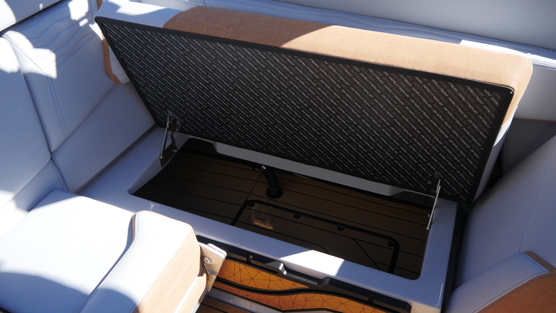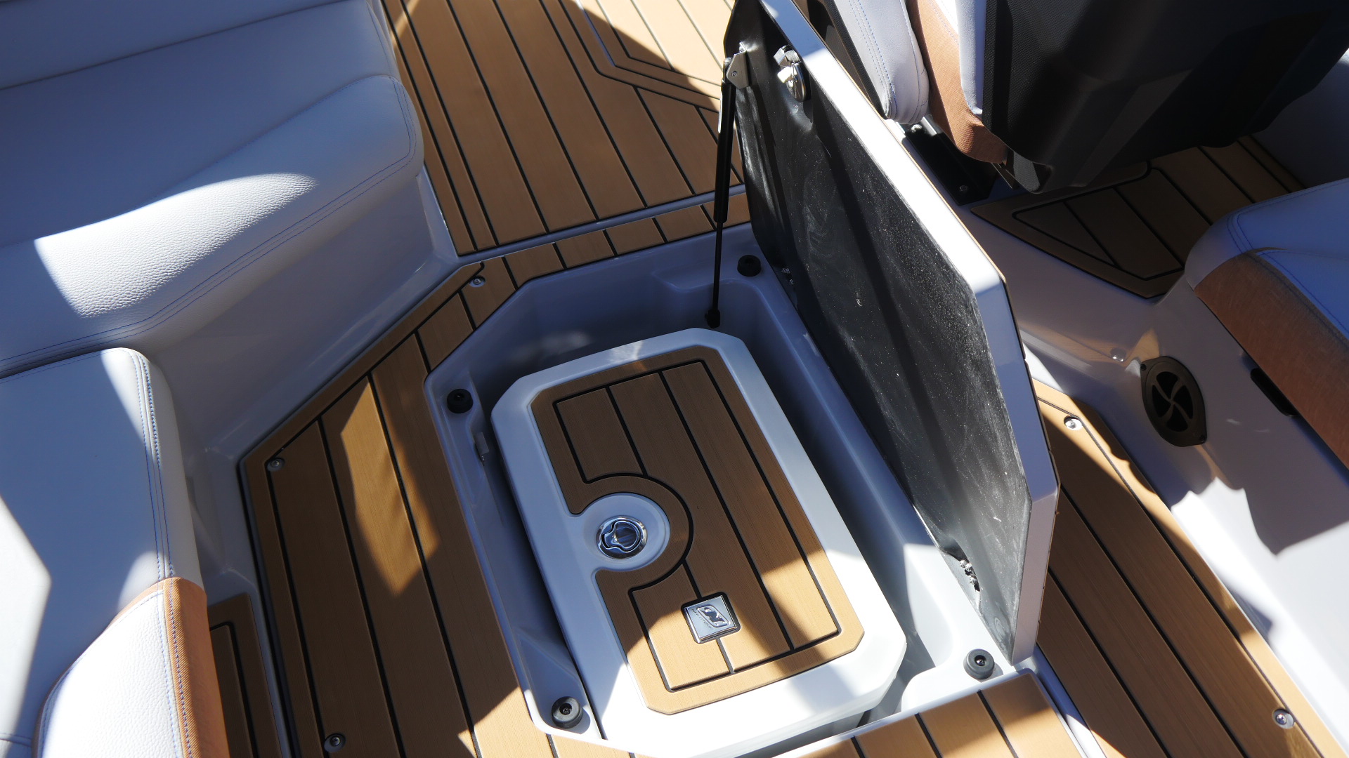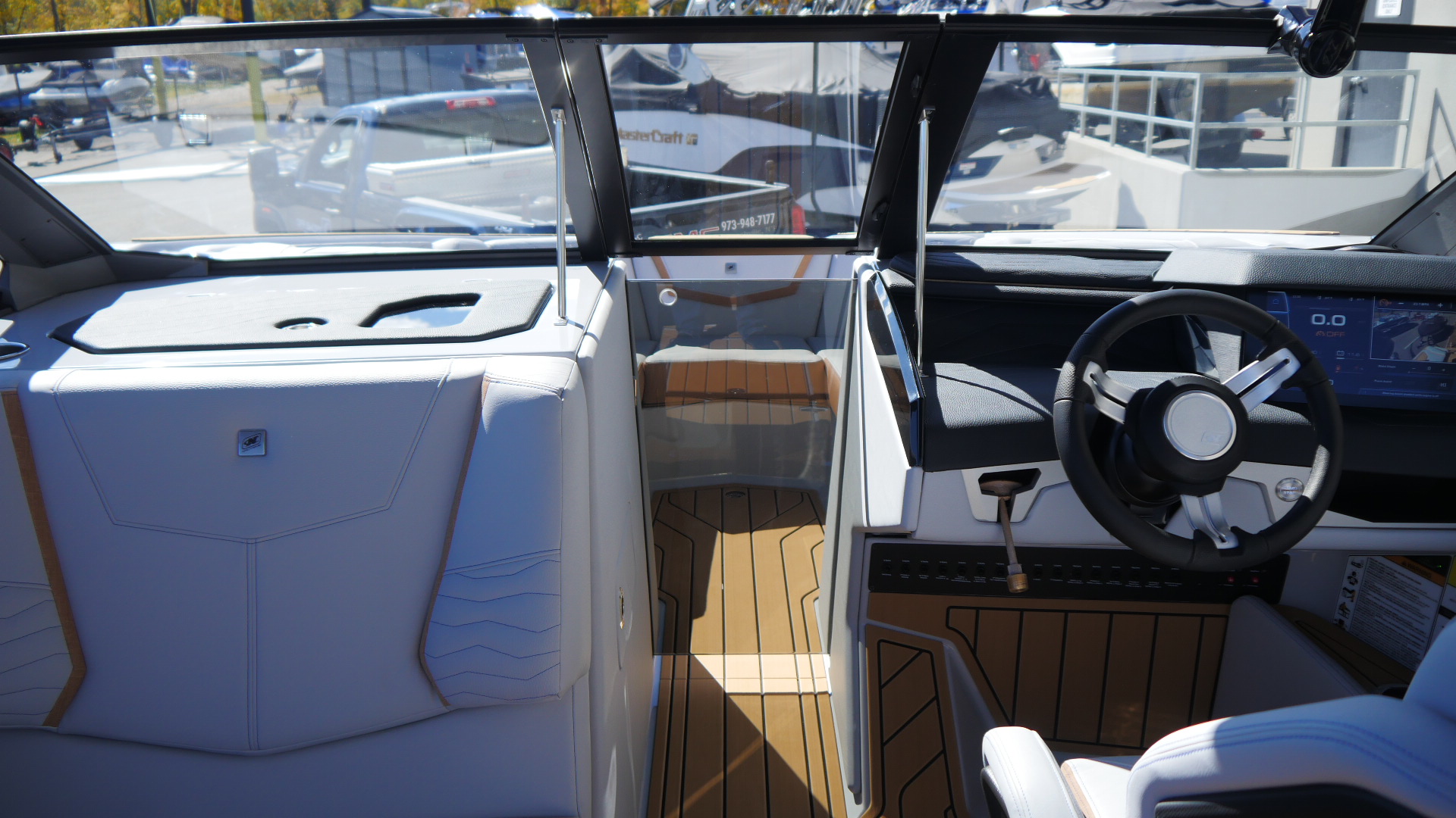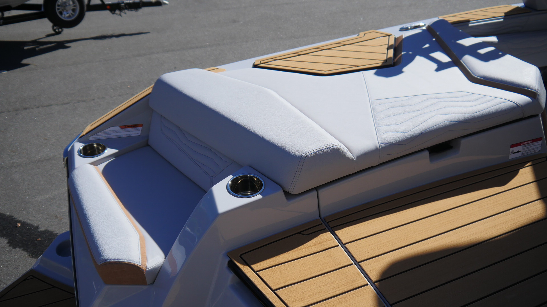 Inside, the G23 surrounds you in premium materials and comfort. A Haze Grey deck contrasts beautifully with Mojave Trueweave accents, detailed with precision stitching. The Mocha Nauteak non-skid flooring adds warmth and grip, combining style with function for a true luxury feel.