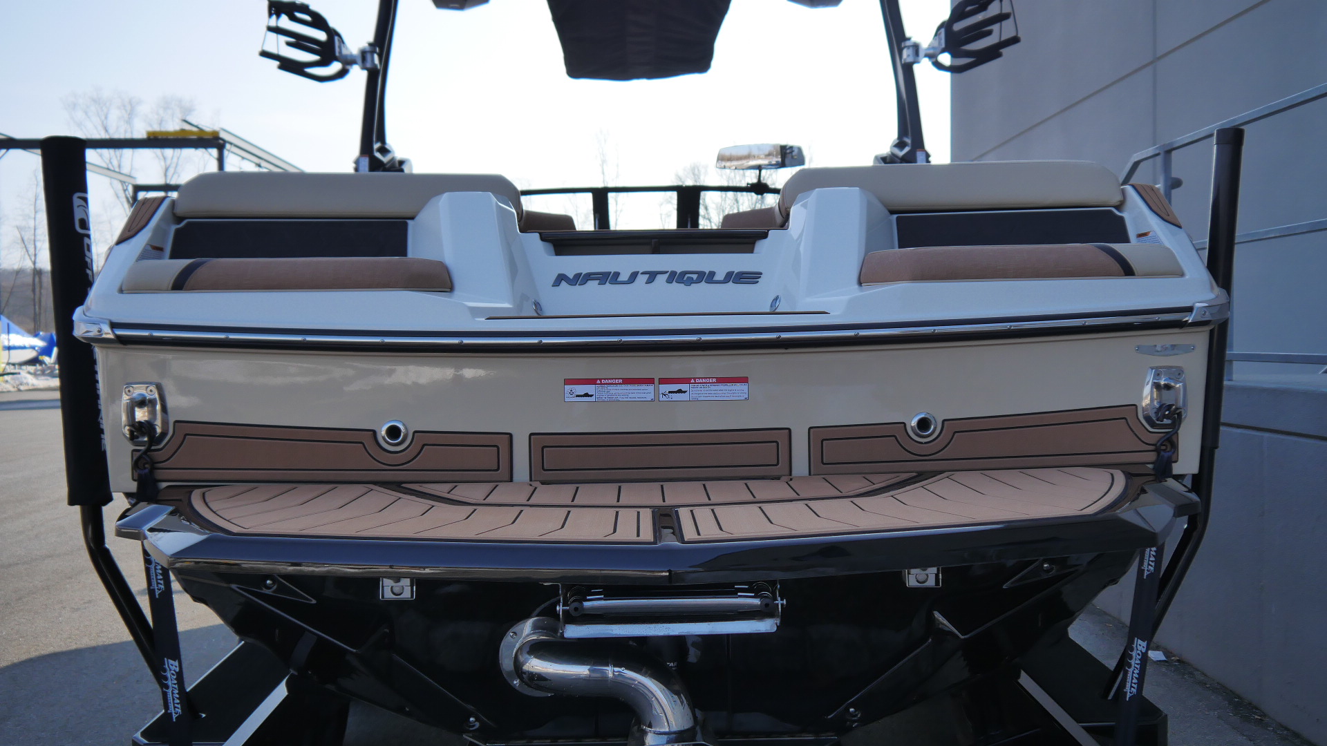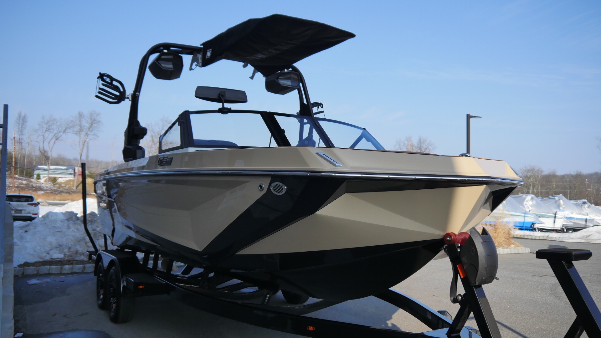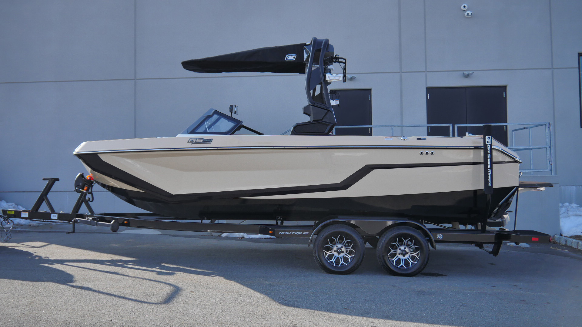 A refined and powerful exterior design featuring a Sahara Sand main stripe complemented by Jet Black Metal Flake accents and a Jet Black hull bottom. This combination exudes sophistication and performance with an unmistakable Nautique presence on the water.