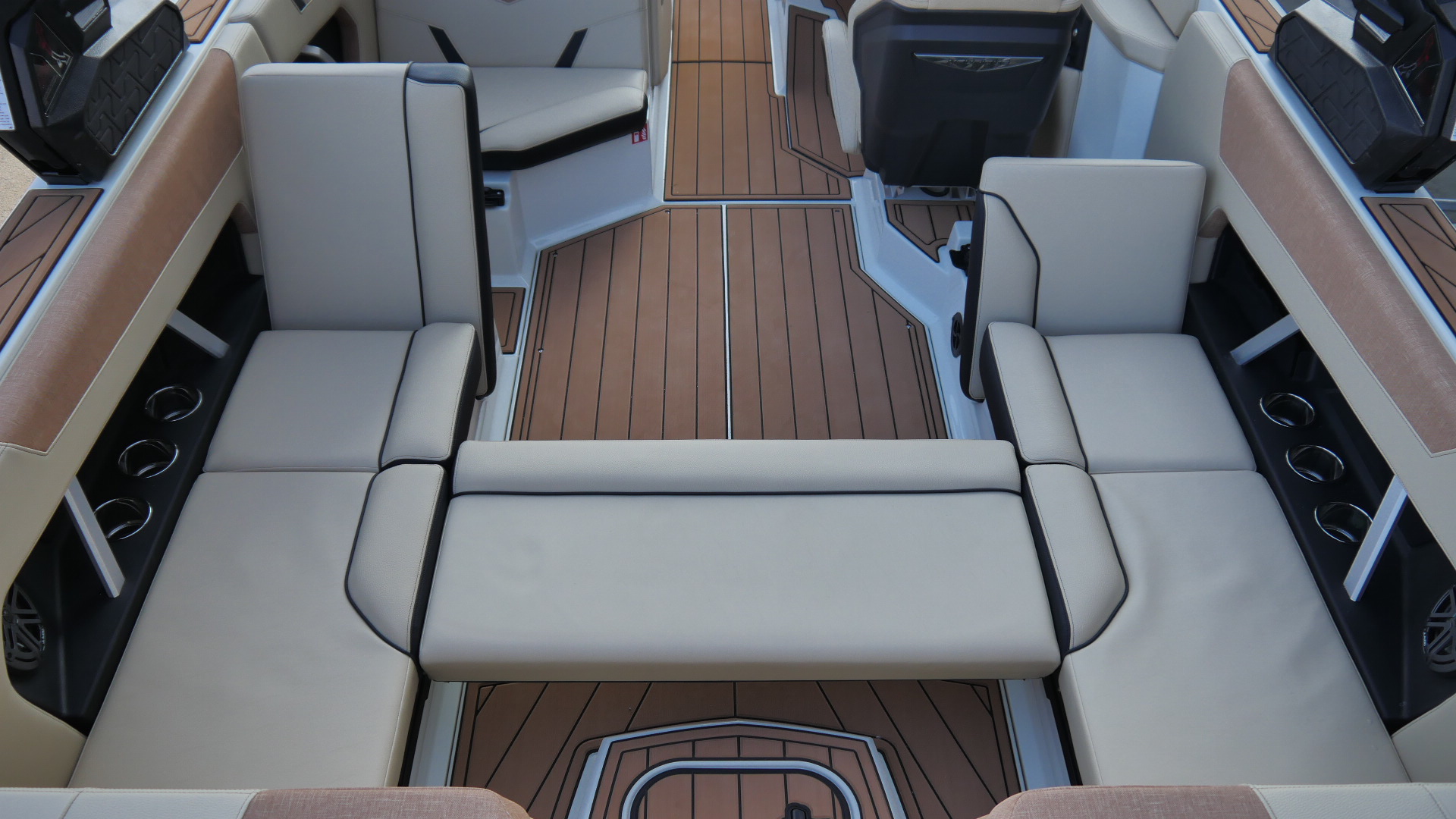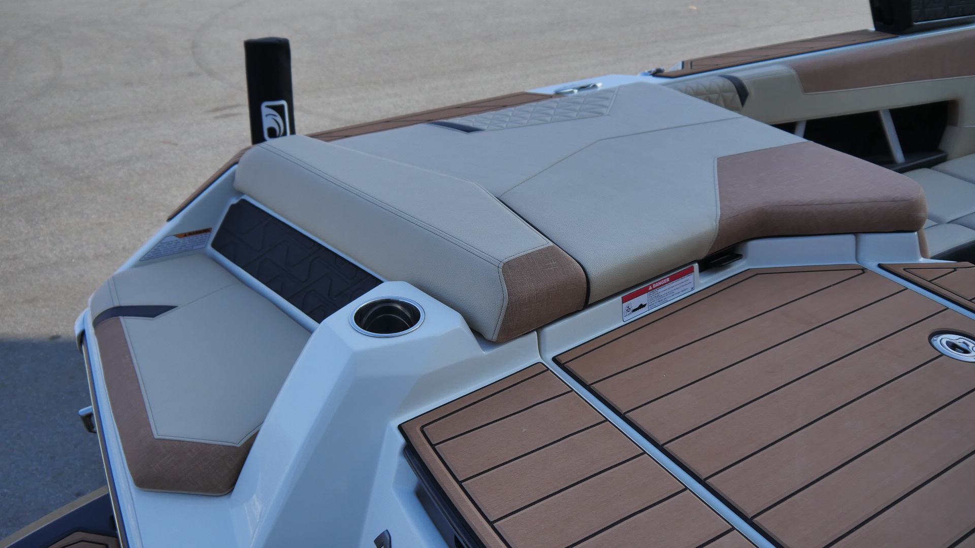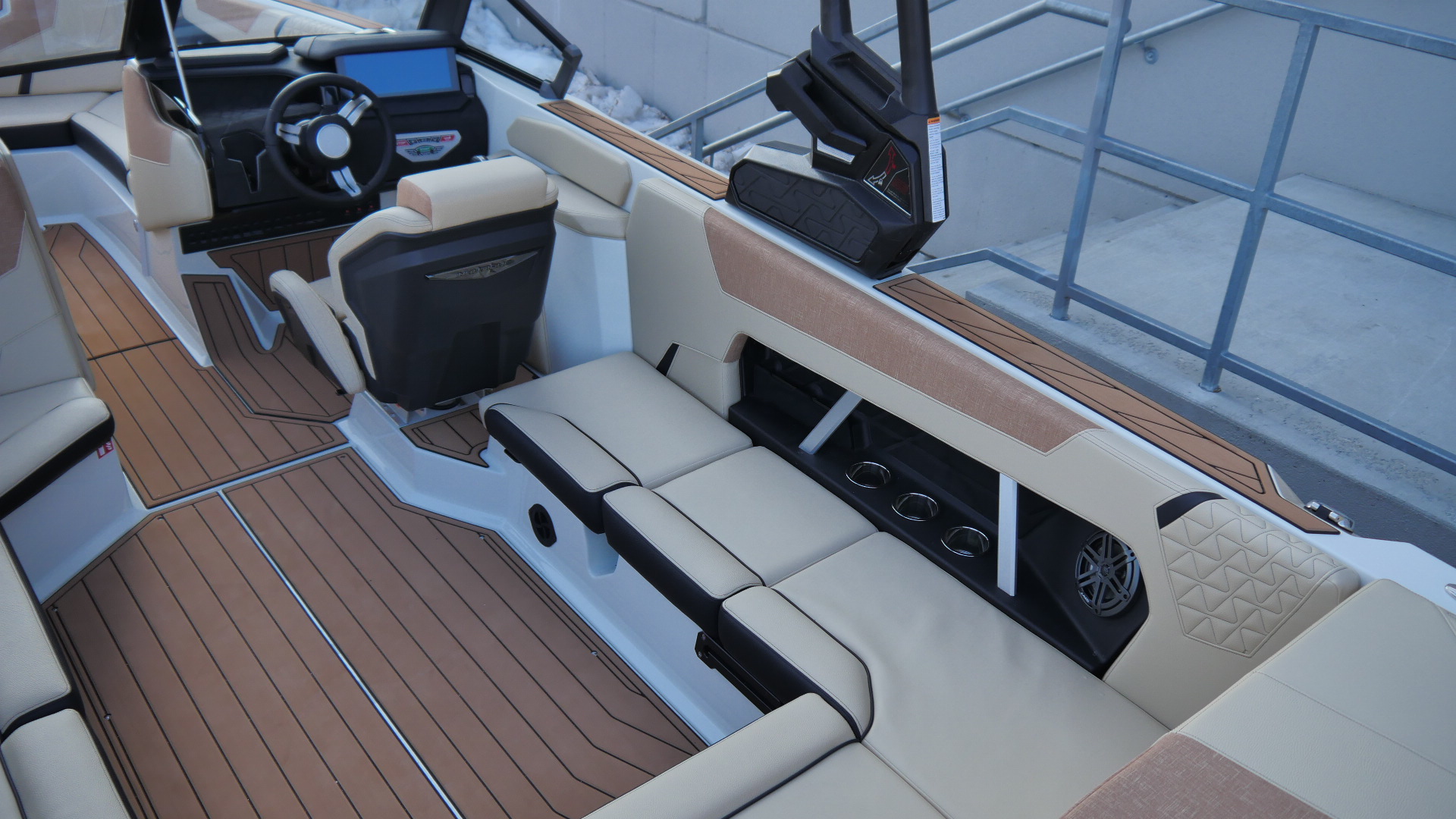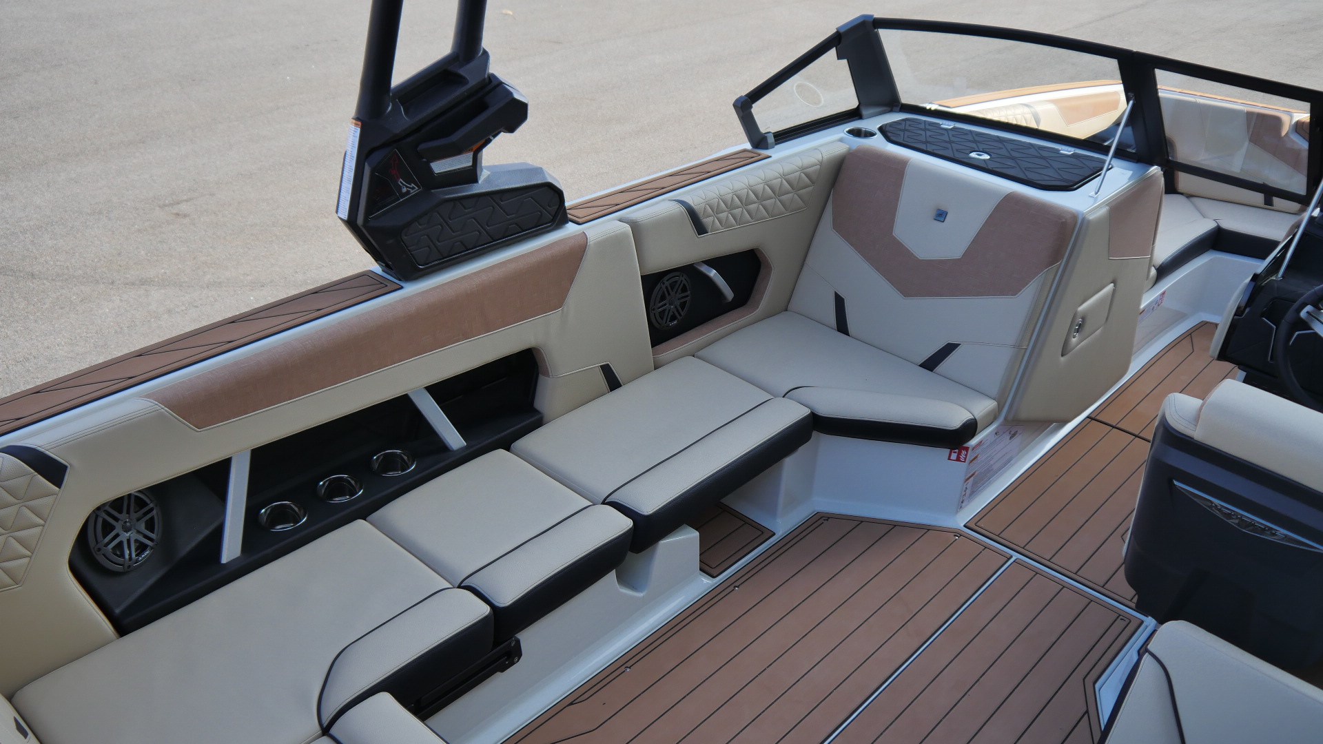 Inside, the GS22 surrounds you in premium materials and comfort. A Lunar White deck contrasts beautifully with Sahara Sand and Jet Black accents, detailed with precision Black stitching. The Mocha Nauteak non-skid flooring adds warmth and grip, combining style with function for a true luxury feel.