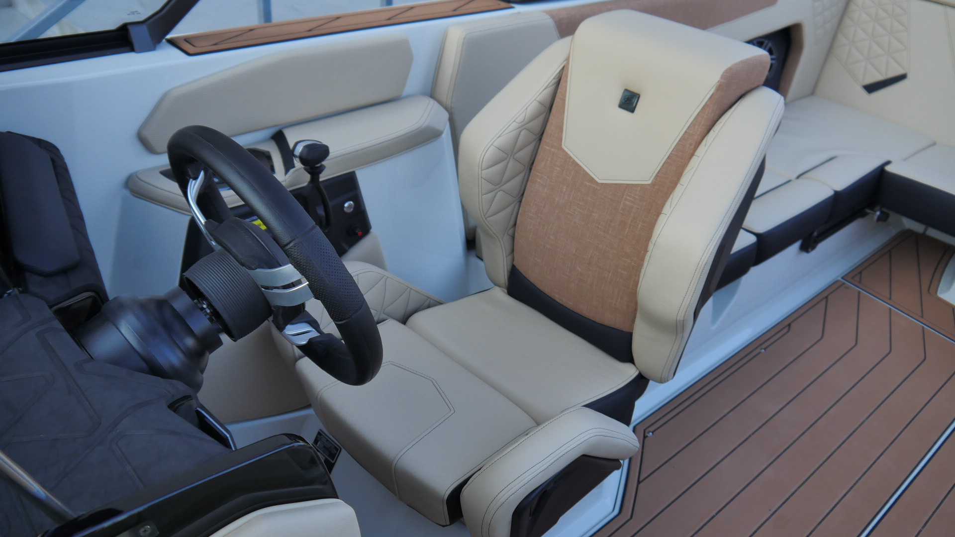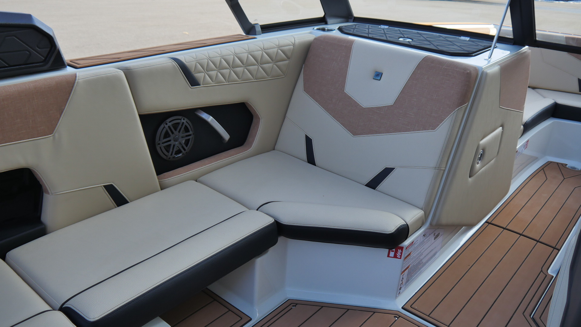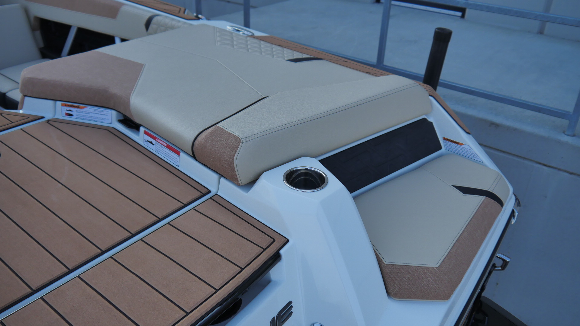 Inside, the GS22 surrounds you in premium materials and comfort. A Lunar White deck contrasts beautifully with Sahara Sand and Jet Black accents, detailed with precision Black stitching. The Mocha Nauteak non-skid flooring adds warmth and grip, combining style with function for a true luxury feel.