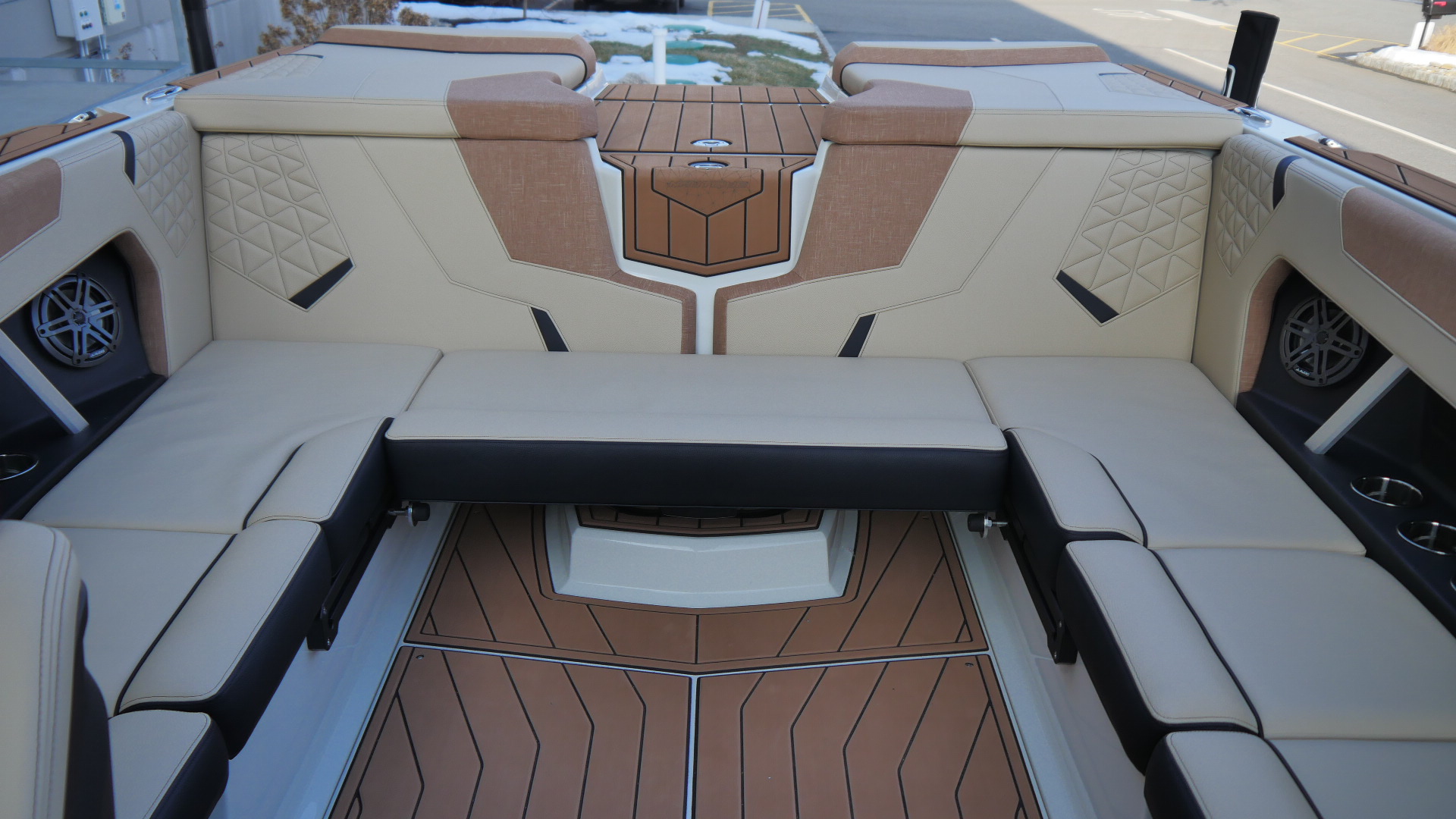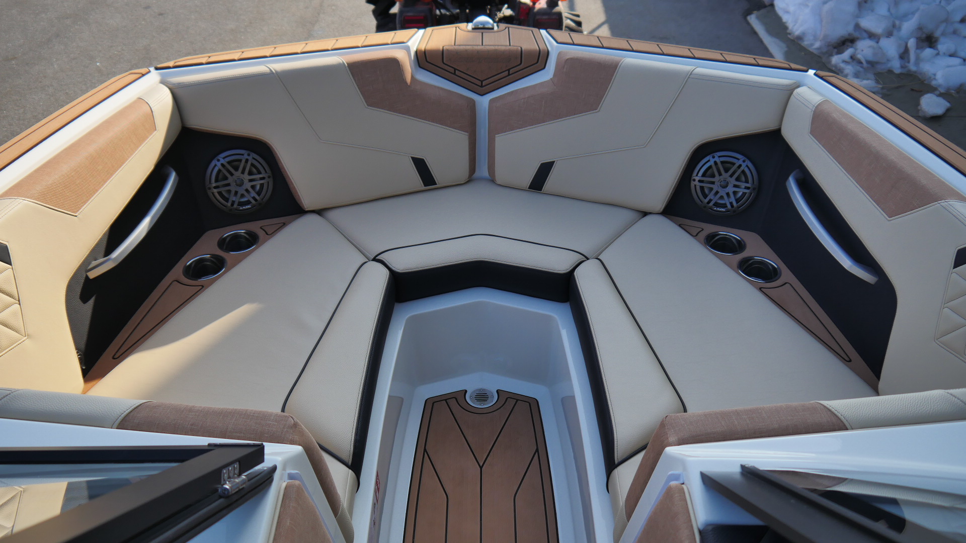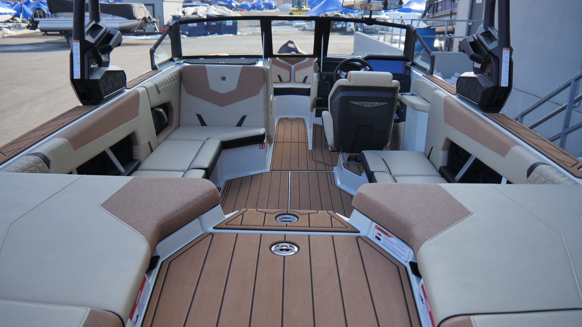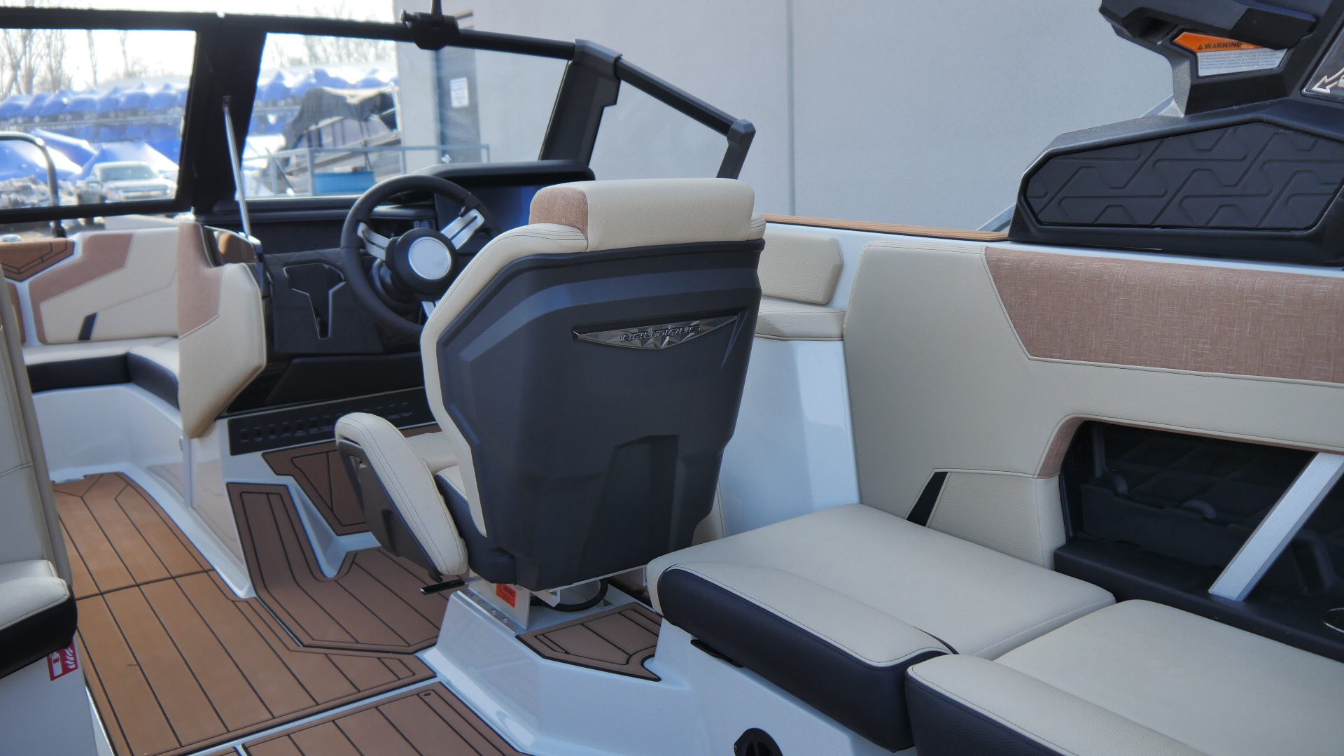 Inside, the GS22 surrounds you in premium materials and comfort. A Lunar White deck contrasts beautifully with Sahara Sand and Jet Black accents, detailed with precision Black stitching. The Mocha Nauteak non-skid flooring adds warmth and grip, combining style with function for a true luxury feel.