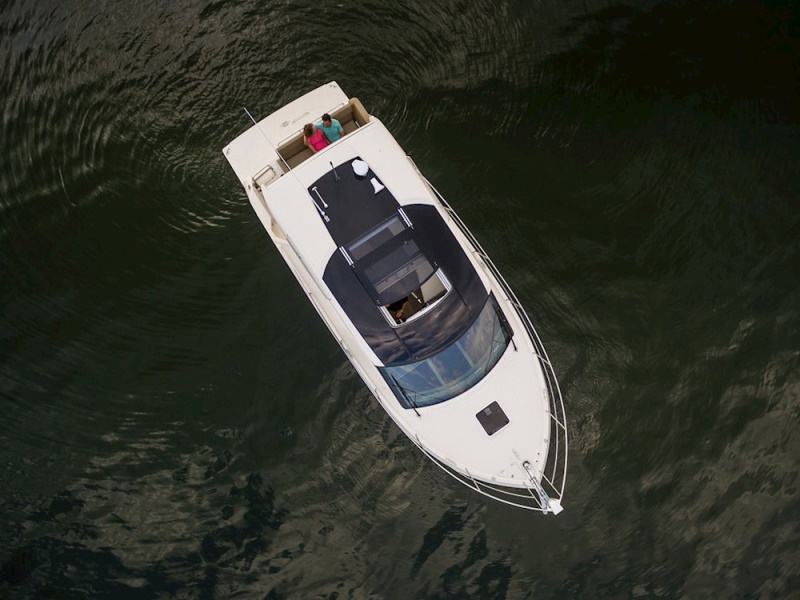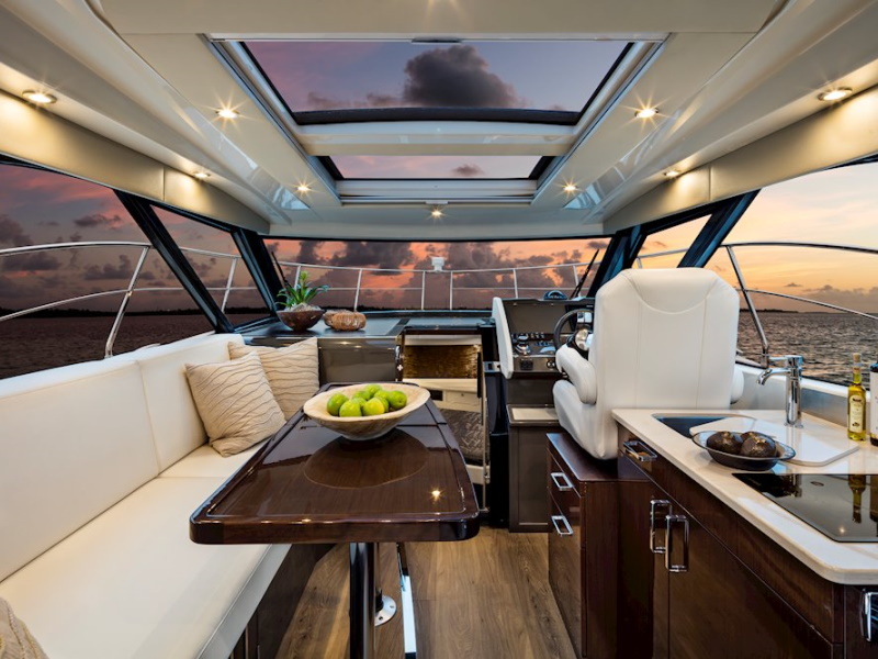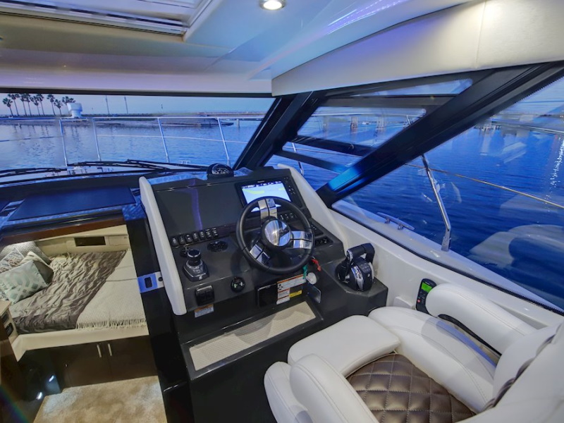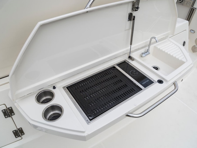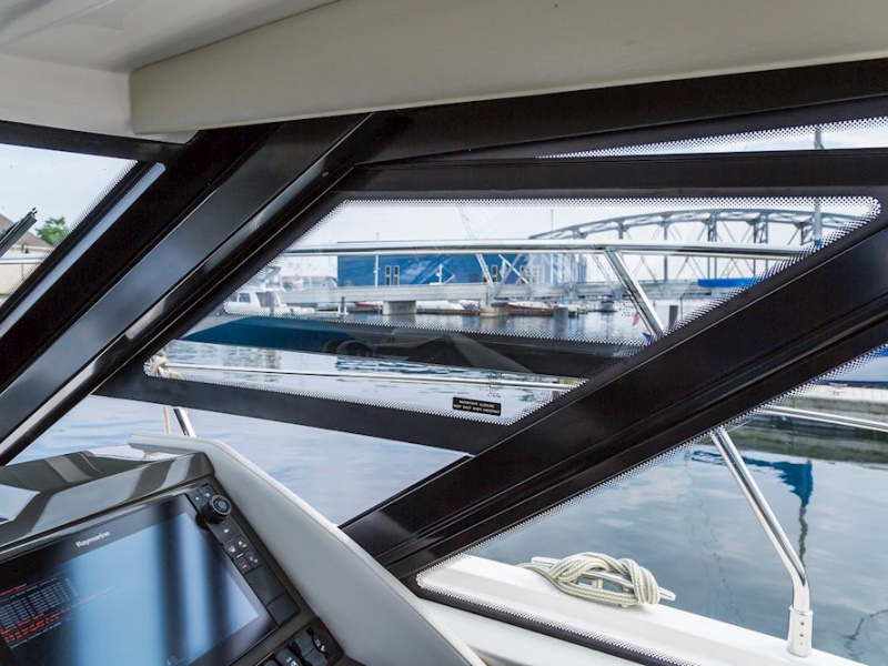 • Sliding door to cabin access, black acrylic, lockable, slides behind helm in open position.