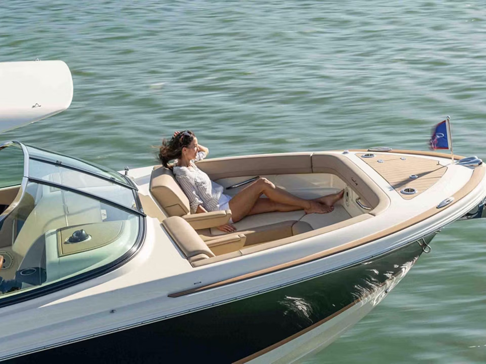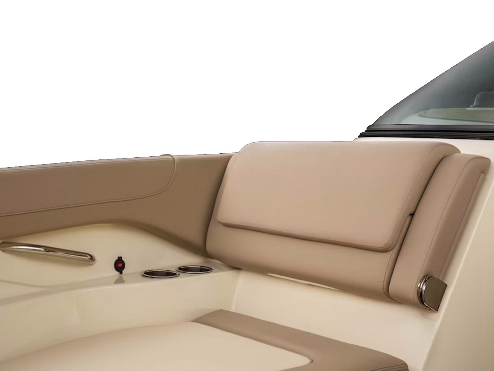 The sleek helm features a flush-mounted 12" Garmin® display and a high-gloss teak steering wheel tucked beneath a gracefully curved glass windshield. Color-matched stitching on the double-wide seat with flip-up bolster is accented by a stainless steel handrail.