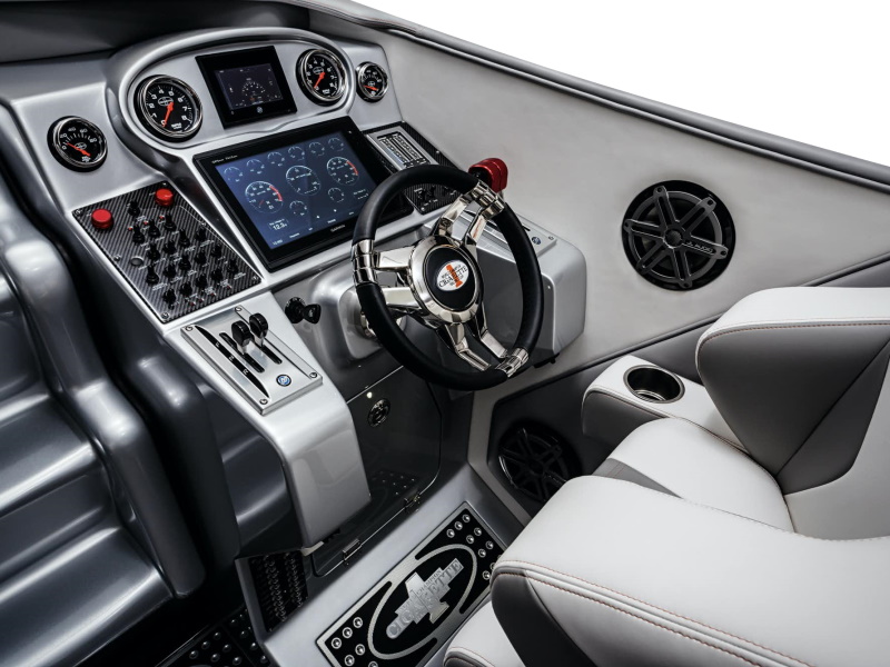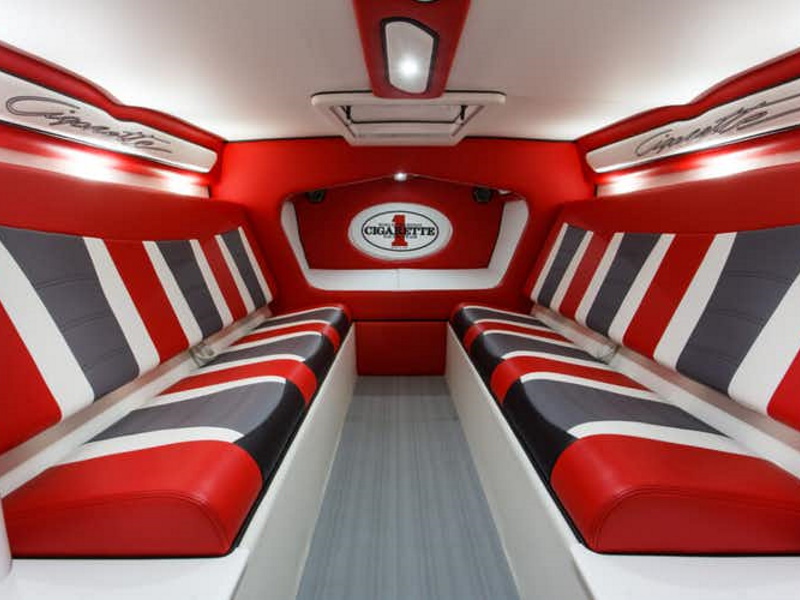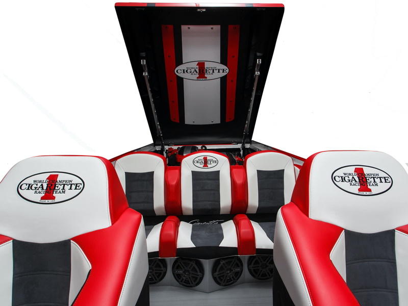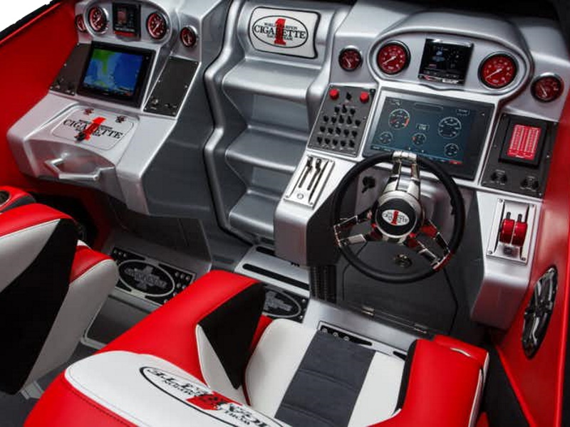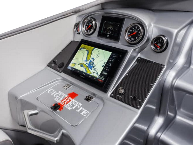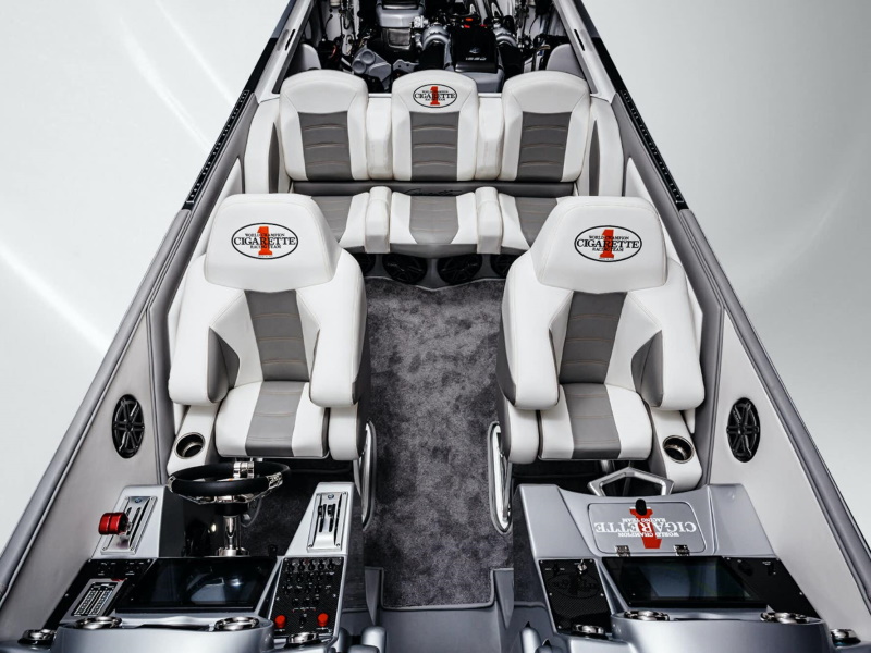 To ensure that the vessel perfectly met the expectations of its owners, Cigarette gathered its expert staff with unmatched knowledge and skills. Artisans, craftsman, professional drivers, and of course, engineers, combining decades of expertise and experience so nothing was compromised in its development. The thorough attention to detail is immediately apparent by the comfortable layout, sturdy and protective seating, and highly ergonomic helm where every switch, display and control is thoughtfully placed. Surrounded by perfection, the purpose of each becomes apparent: function initiating shape, and technical precision expressed through pure lines and efficient elegance.