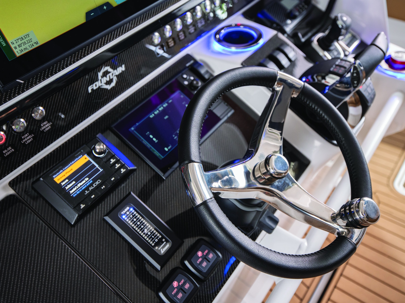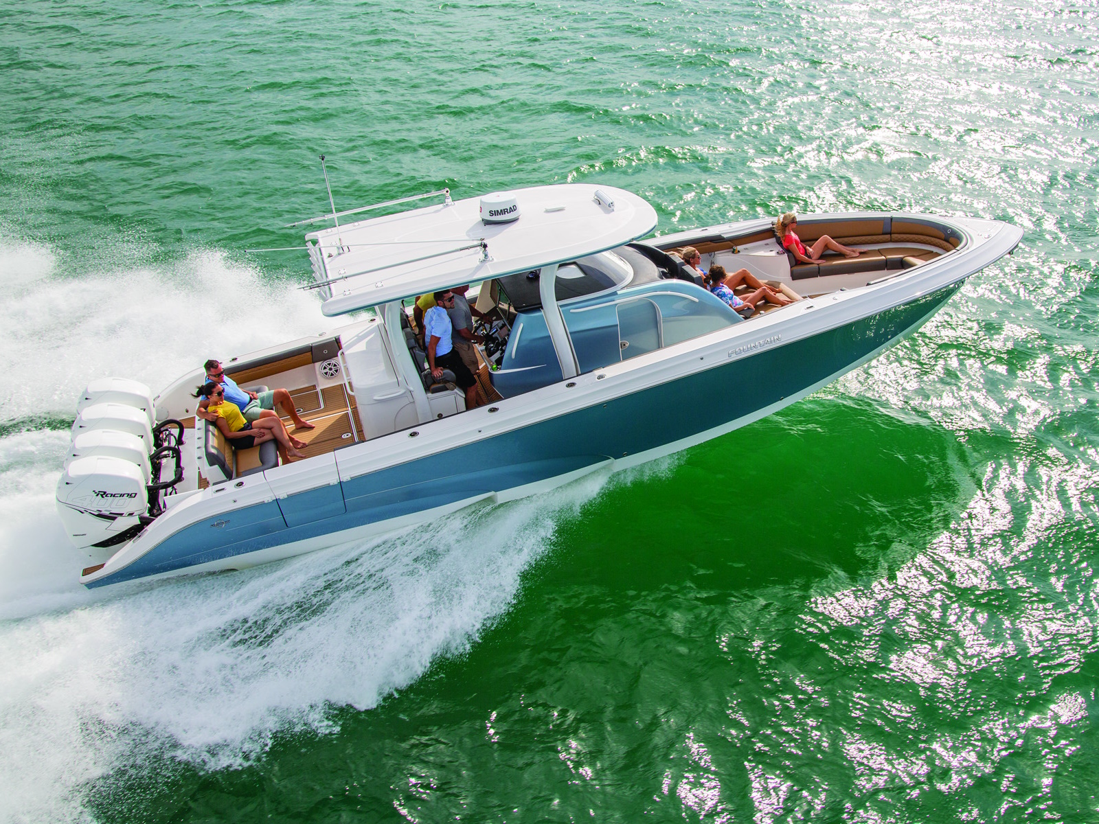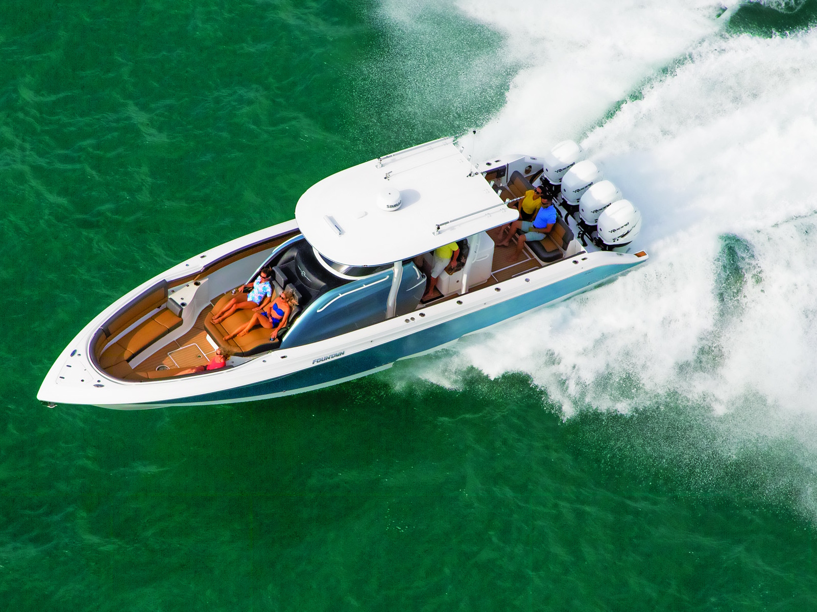 You've just arrived at the top of the line. The sensational Fountain 43NX blends luxury, performance, and style better than any center console in this size range. Fountain is synonymous with exciting top-end, controlled midrange, and a dry ride, and the 43NX more than delivers. Everywhere you look, there's seating: wraparound cushions surround the bow, a spacious chaise lounge tops any tanning salon, adjustable bolsters inspire big water confidence, and a full-width stern bench says "Welcome Aboard".