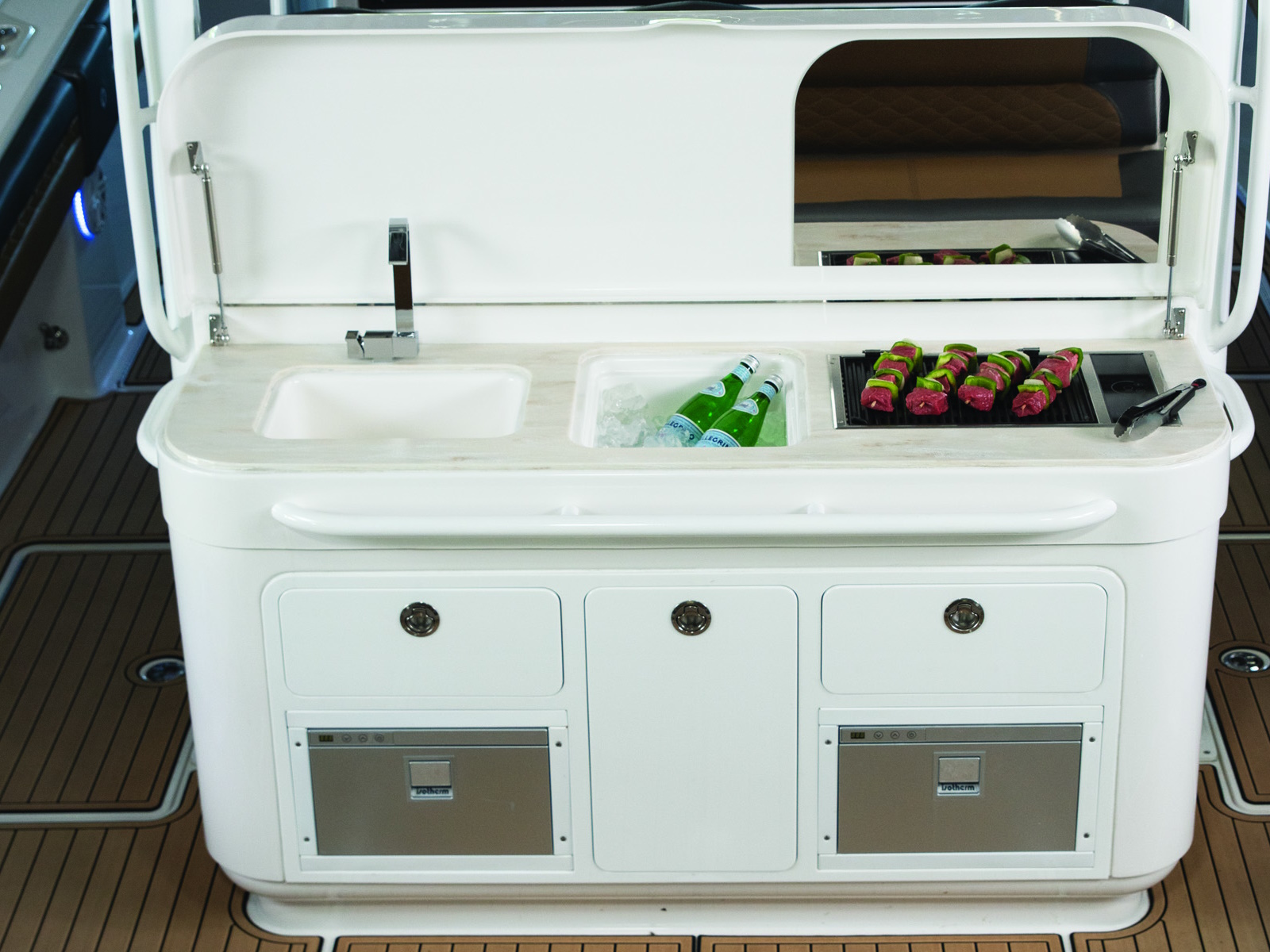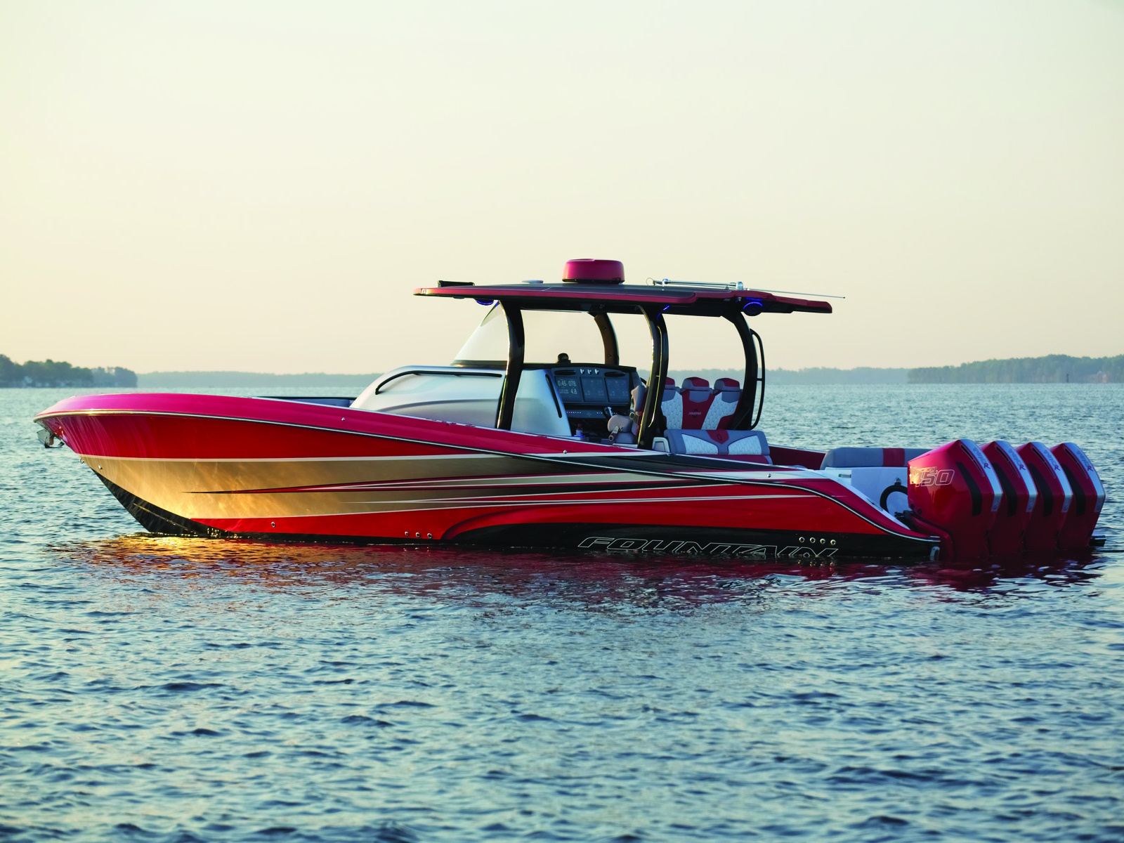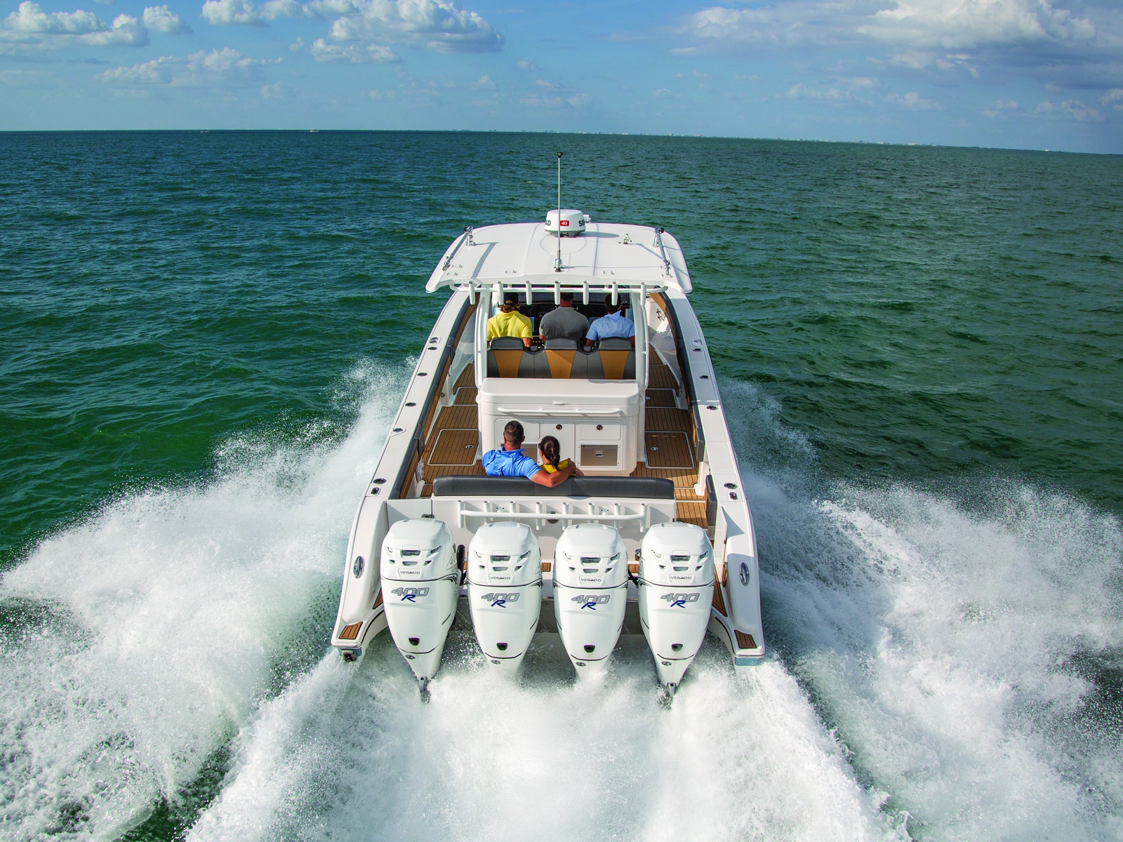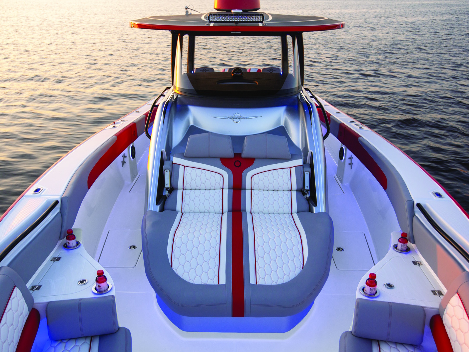 You've just arrived at the top of the line. The sensational Fountain 43NX blends luxury, performance, and style better than any center console in this size range. Fountain is synonymous with exciting top-end, controlled midrange, and a dry ride, and the 43NX more than delivers. Everywhere you look, there's seating: wraparound cushions surround the bow, a spacious chaise lounge tops any tanning salon, adjustable bolsters inspire big water confidence, and a full-width stern bench says "Welcome Aboard".