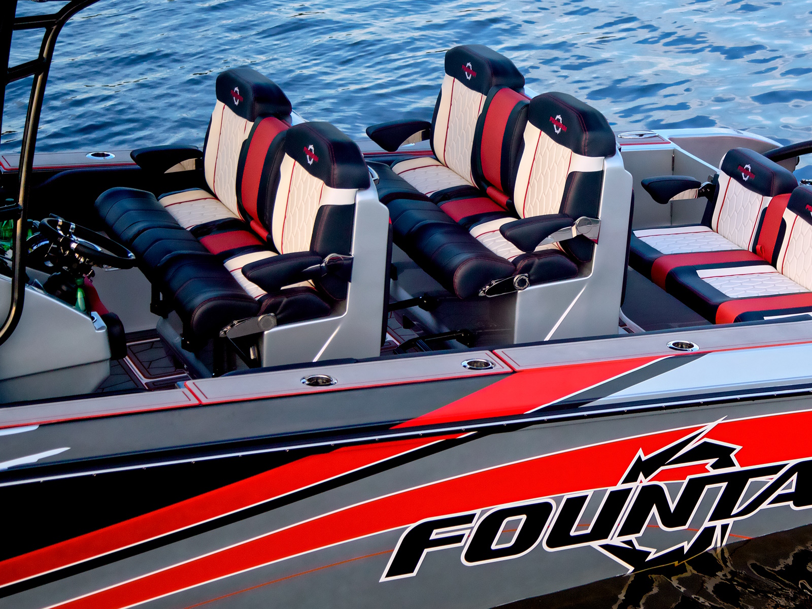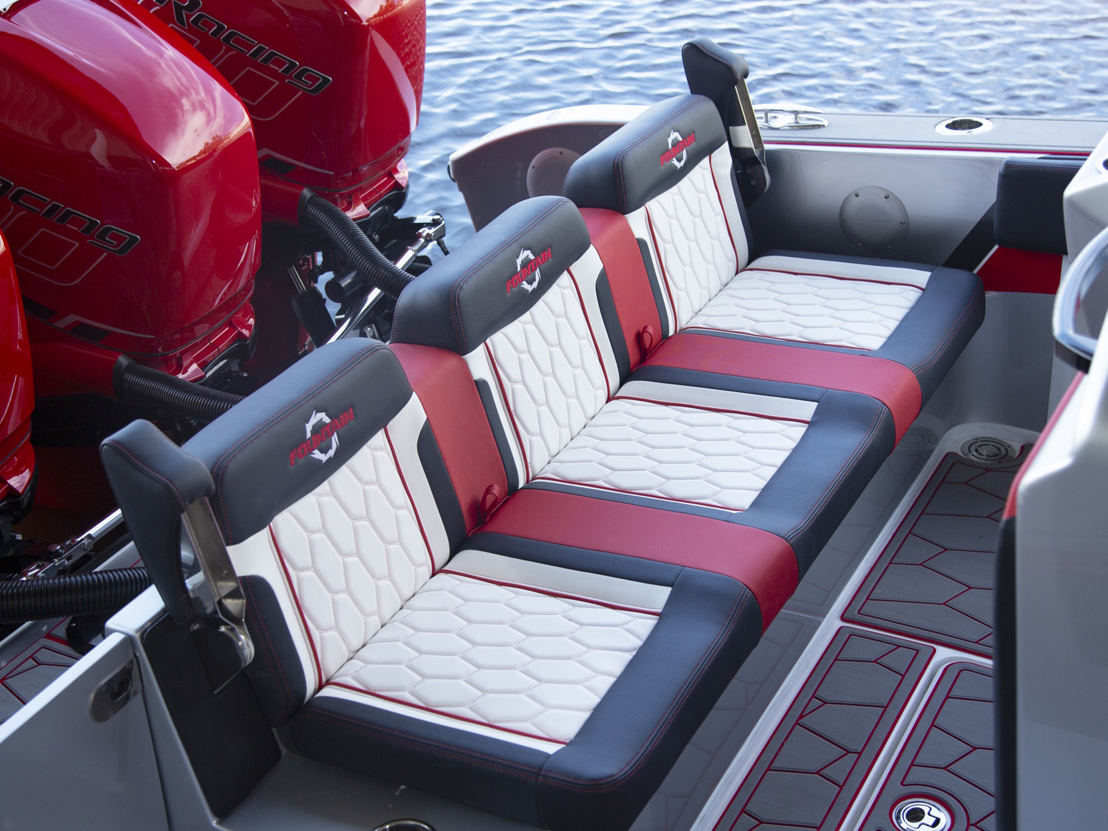 With the launch of the incredible new 38SC, the next-generation of Fountain High Performance V-Bottoms is speeding on the scene. High performance boat buyers can now enjoy the roominess of a center console, the dependability of outboards and the top-end performance that has made Fountain the fastest name in boating for more than 40 years. Don't look now but with it's 100 mph top-end potential, the 38SC certainly must be considered the fastest stock center console under 40-feet on the water today. Bold graphics inside and out scream "speed." Premium Cool Touch upholstery with color coordinated thread showcase Fountain's incredible attention to detail.