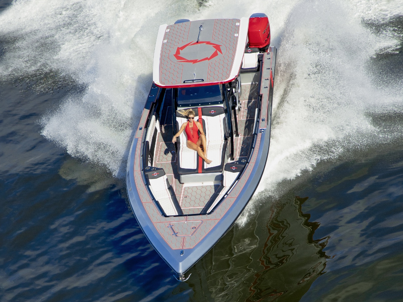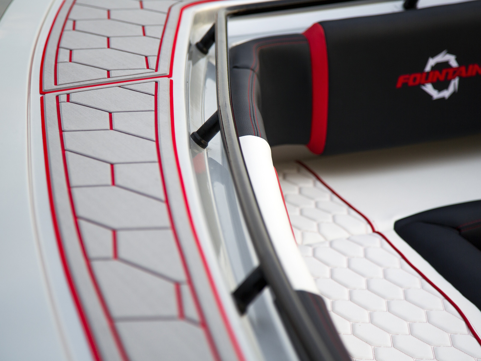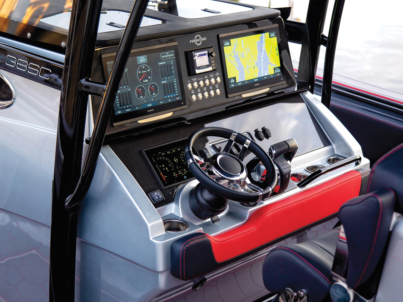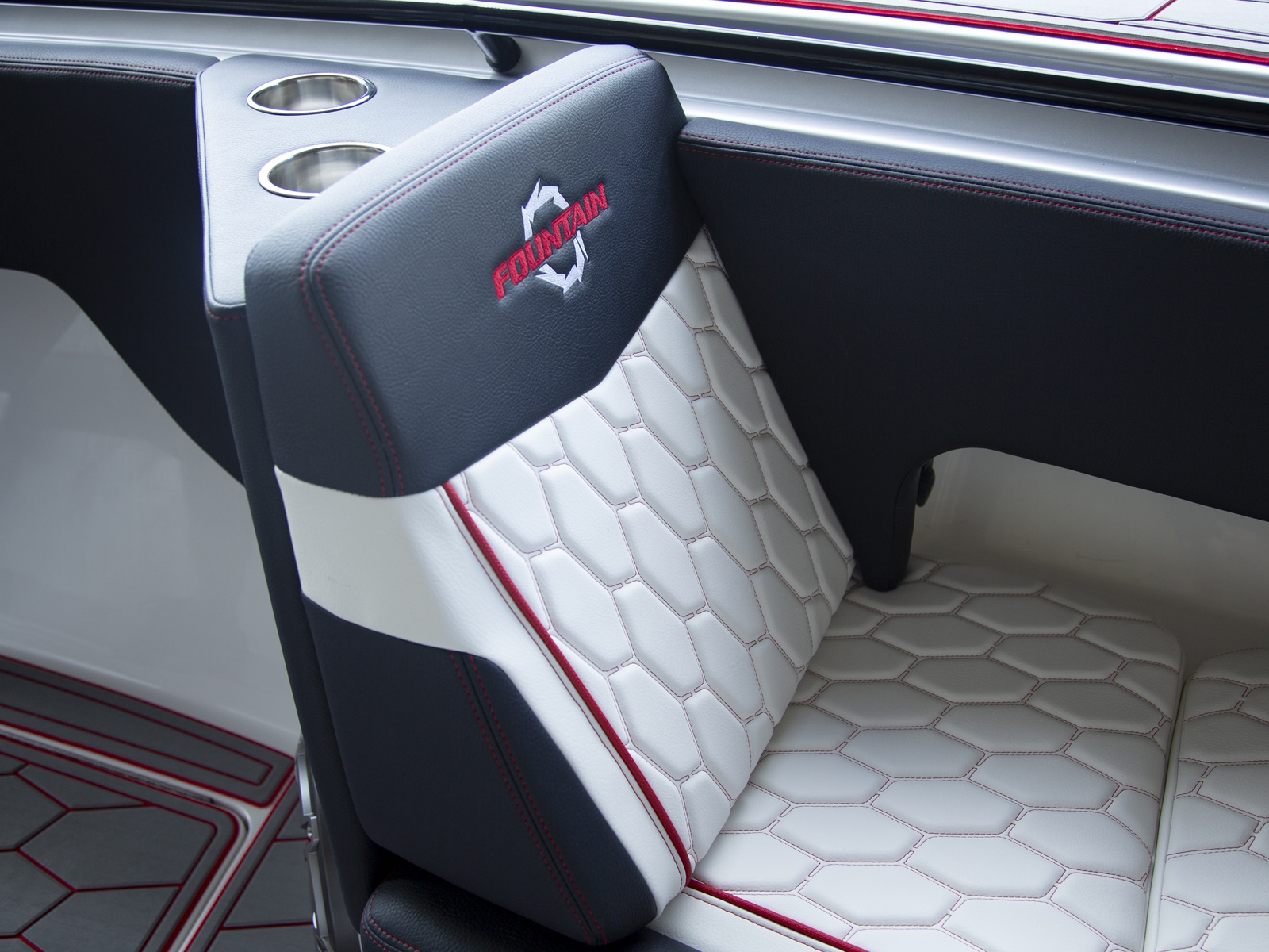 With the launch of the incredible new 38SC, the next-generation of Fountain High Performance V-Bottoms is speeding on the scene. High performance boat buyers can now enjoy the roominess of a center console, the dependability of outboards and the top-end performance that has made Fountain the fastest name in boating for more than 40 years. Don't look now but with it's 100 mph top-end potential, the 38SC certainly must be considered the fastest stock center console under 40-feet on the water today. Bold graphics inside and out scream "speed." Premium Cool Touch upholstery with color coordinated thread showcase Fountain's incredible attention to detail.