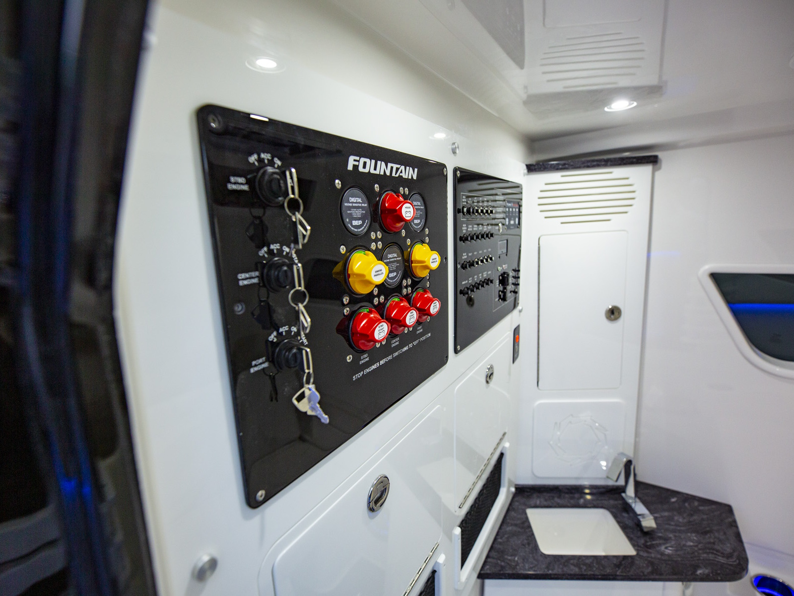 With the introduction of the phenomenal new 38SCX, we take Speed & Luxury to new heights. The boat's next-generation Hardtop extends to the gunwales, covers the optional second row bolsters and features a protective three-piece ventilated glass windshield. Exclusively Fountain, the SCX includes a host of standard upgrades including premium six-color upholstery and Marine Mat on the cockpit sole, gunwales, and T-Top. Sacrificing no creature comforts, inverter-powered air conditioning is standard in both the cockpit and cabin. An optional 5KW Panda generator provides around-the-clock comfort on steamy summer nights. The overnight cabin includes a couch that converts to a full-size sleeper. A large tinted window emits light and creates a spacious feel.