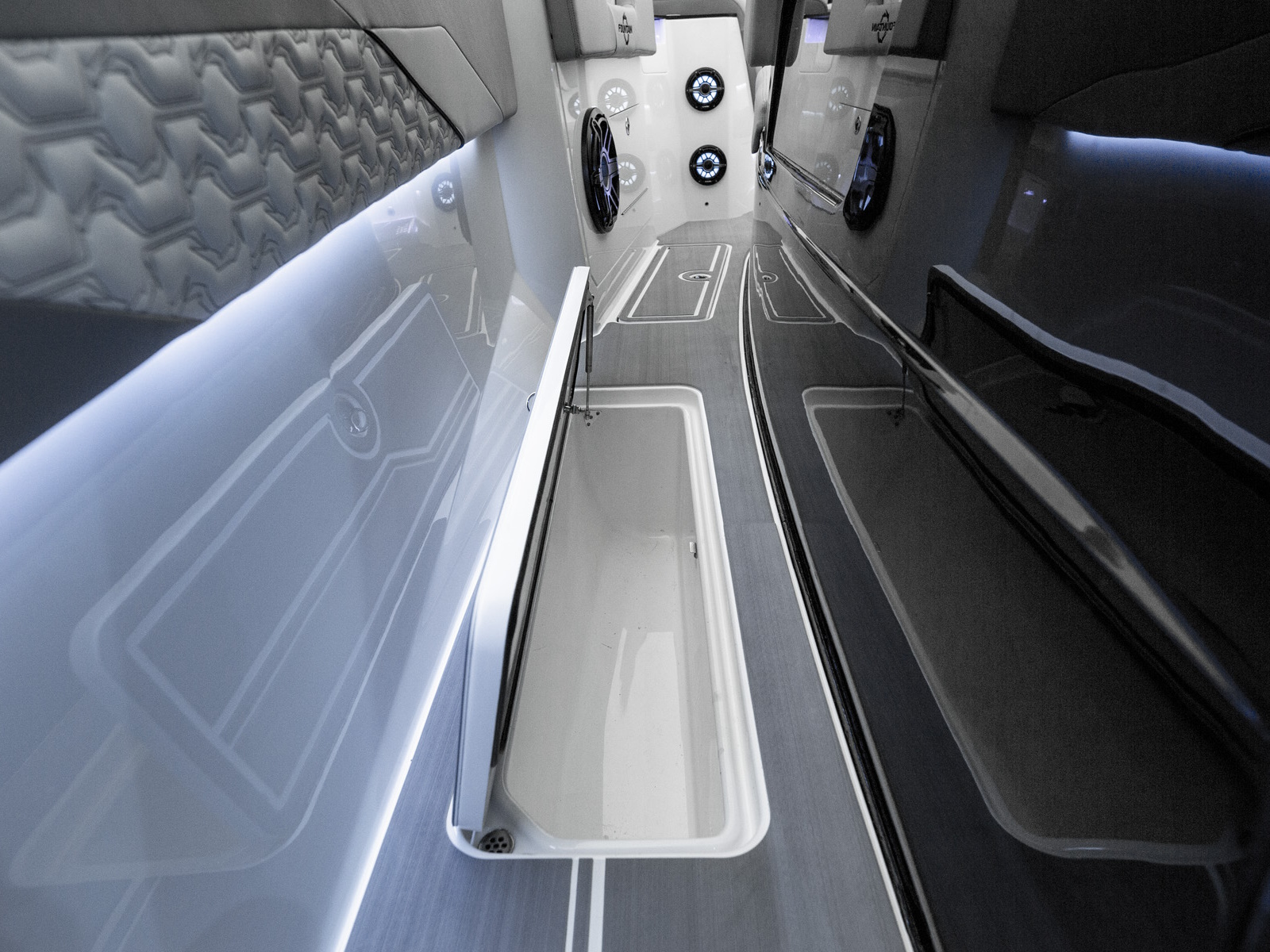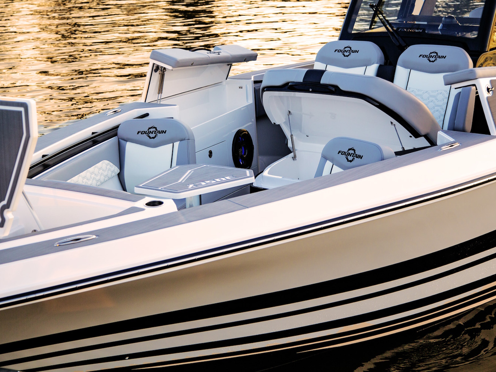 With the introduction of the phenomenal new 38SCX, we take Speed & Luxury to new heights. The boat's next-generation Hardtop extends to the gunwales, covers the optional second row bolsters and features a protective three-piece ventilated glass windshield. Exclusively Fountain, the SCX includes a host of standard upgrades including premium six-color upholstery and Marine Mat on the cockpit sole, gunwales, and T-Top. Sacrificing no creature comforts, inverter-powered air conditioning is standard in both the cockpit and cabin. An optional 5KW Panda generator provides around-the-clock comfort on steamy summer nights. The overnight cabin includes a couch that converts to a full-size sleeper. A large tinted window emits light and creates a spacious feel.
