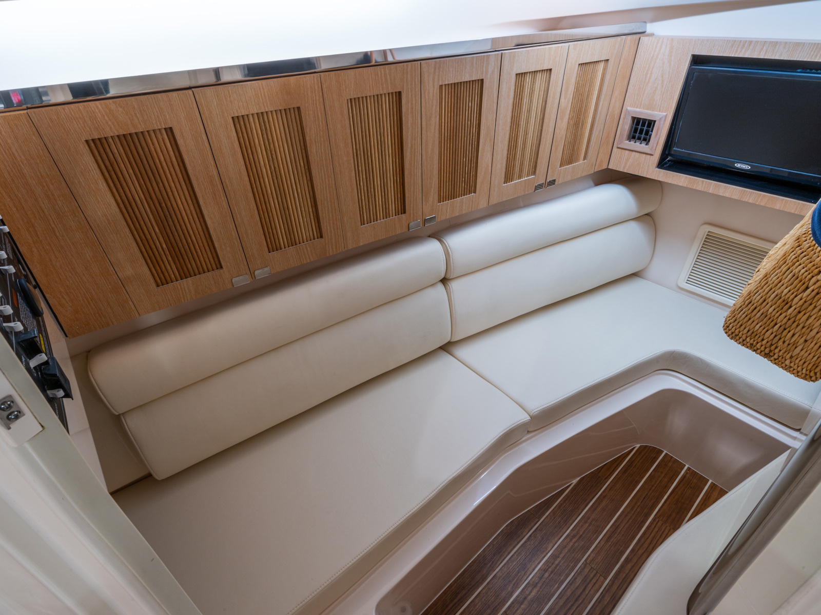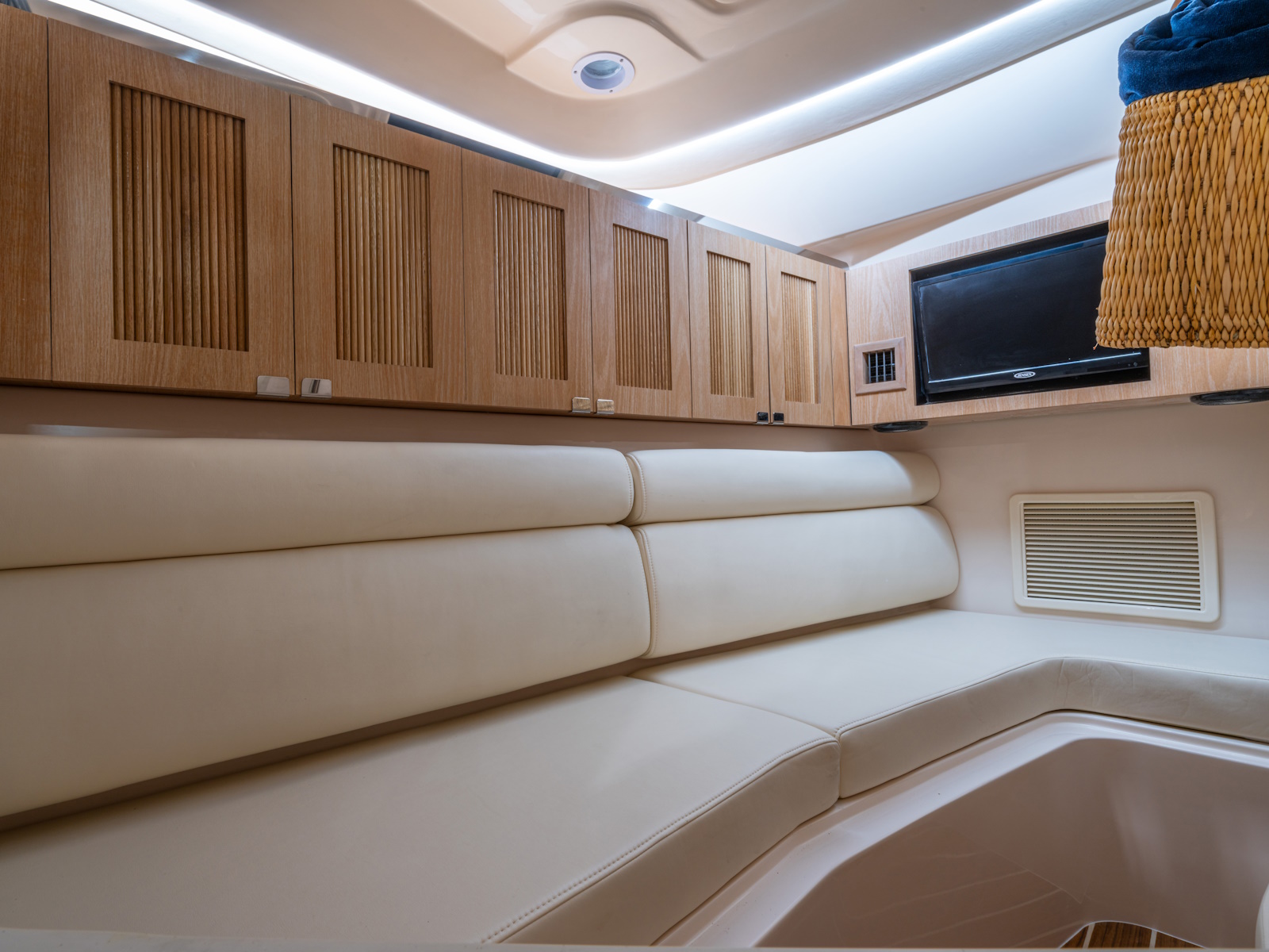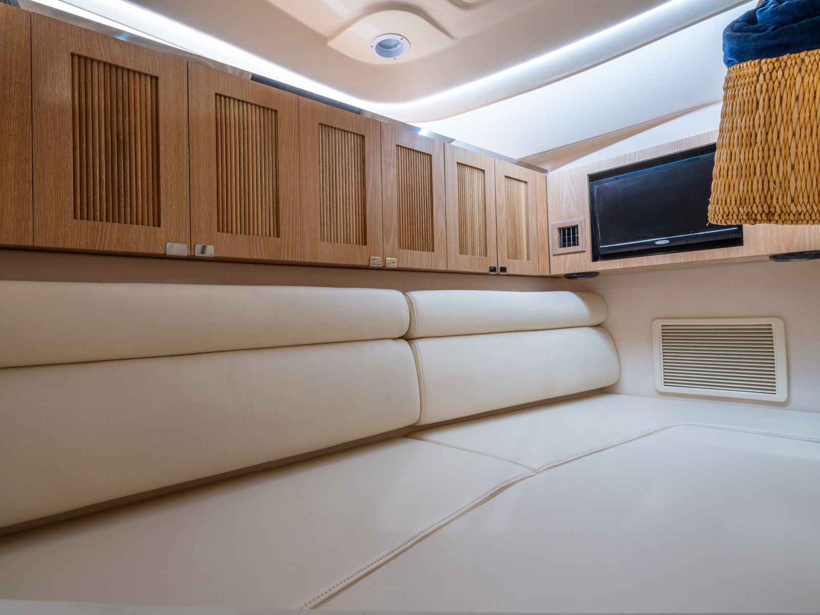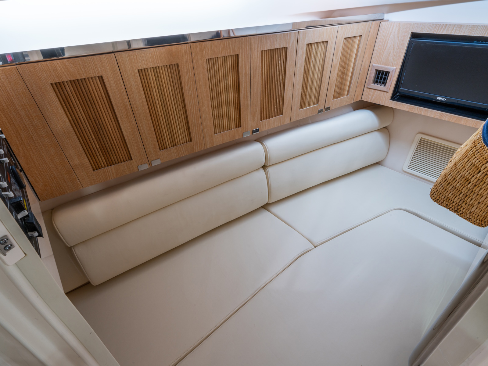 - Port console w/electromechanically operated sliding berth, bench seat, TV - 19" LED flat screen w/HDMI inlet, microwave, mirror, indirect lighting, skylight & handcrafted cabinetry with fluted inlay