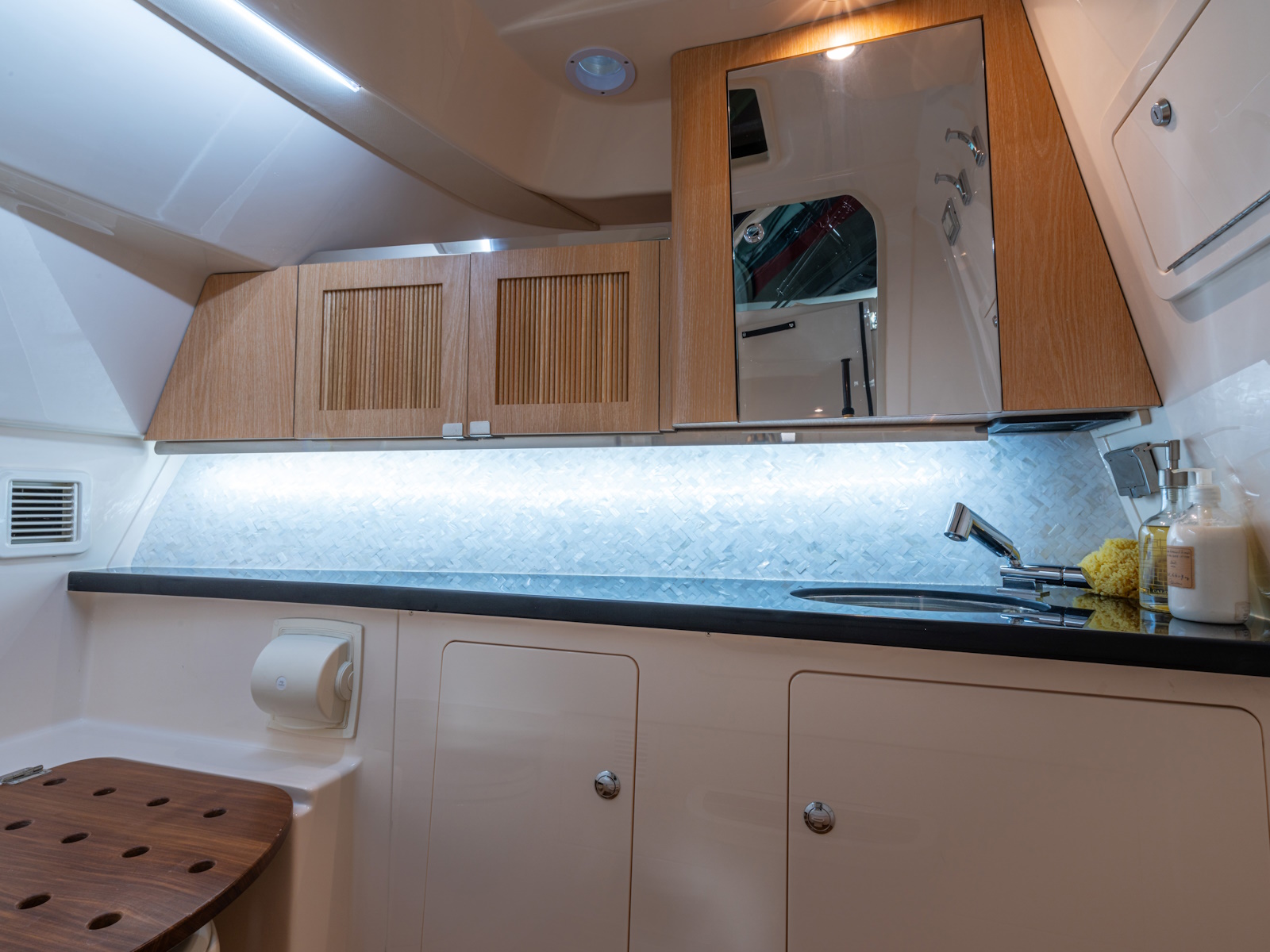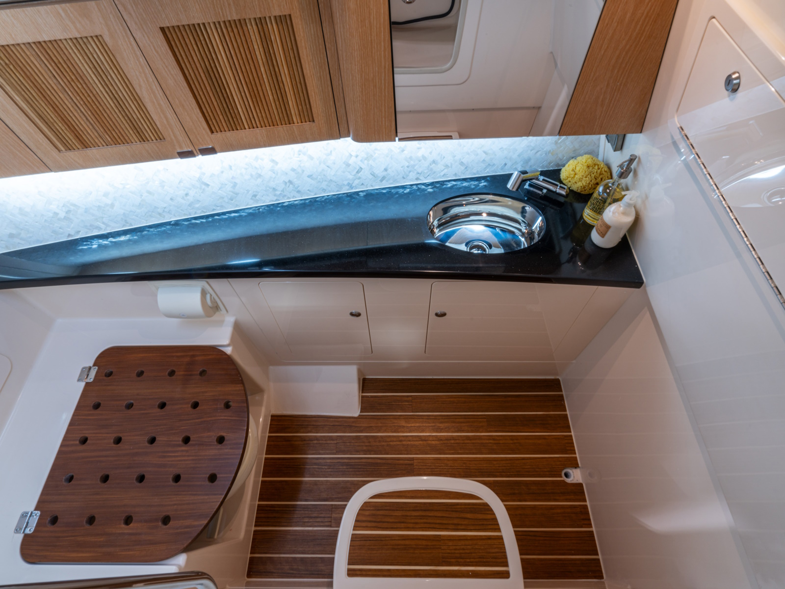 - Starboard console w/shower, sink, indirect & vanity lighting, skylight, handcrafted cabinetry with fluted inlay, fold down seat & VacuFlush® head w/freshwater supply, 10-gallon (38 l) holding tank, overboard discharge & deck pump out