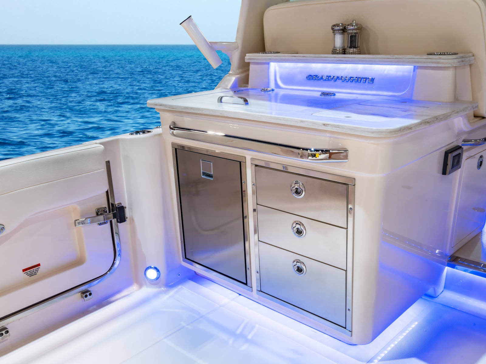 - Wet bar w/refrigerator, sink, storage drawers, 1300W grill, trash bin, drink holders (2) & indirect courtesy lighting (blue)