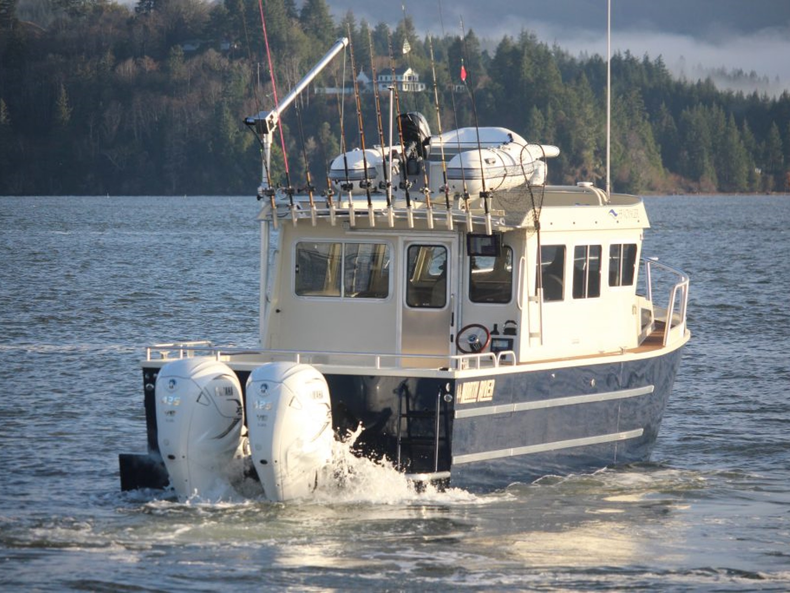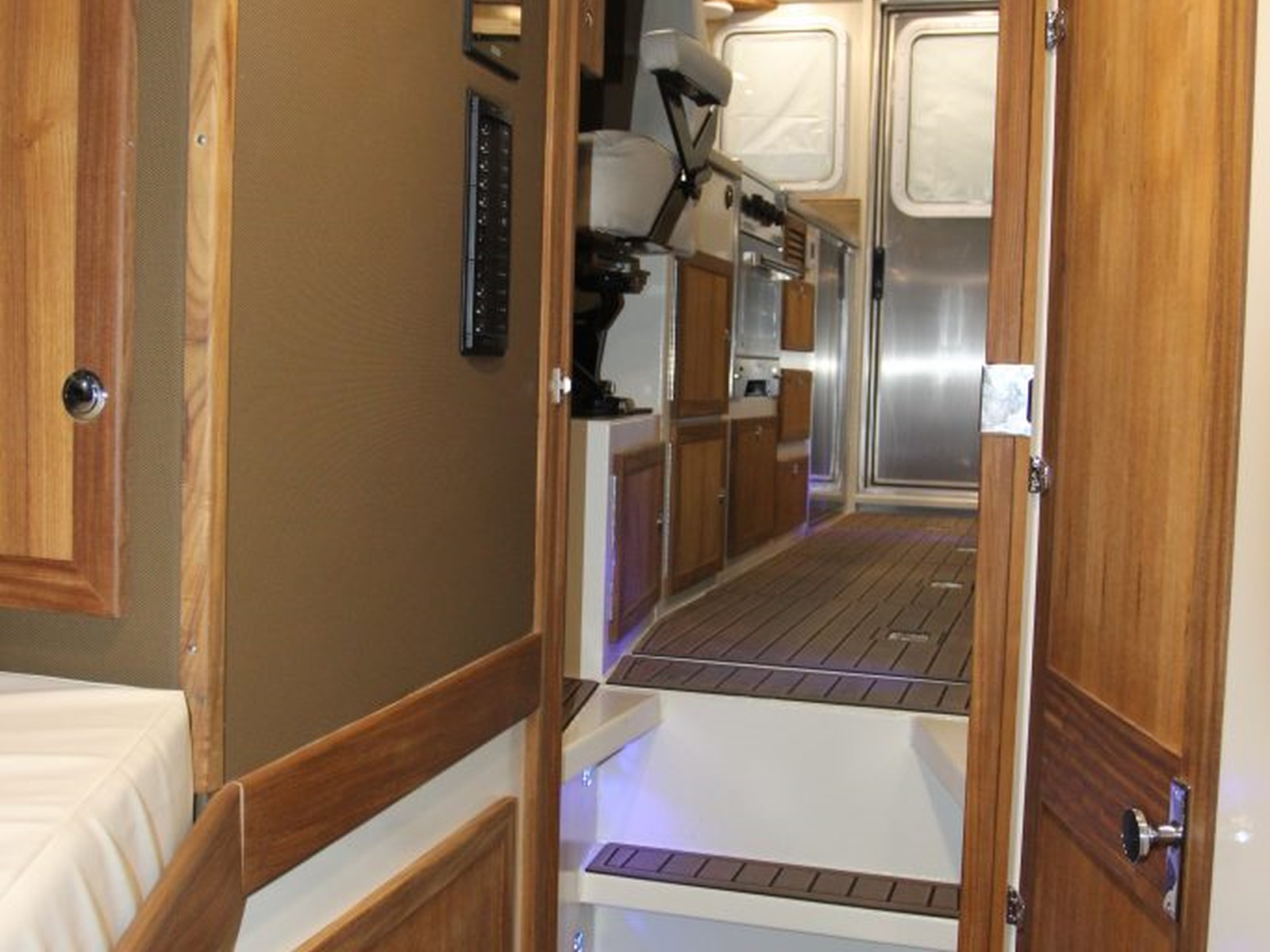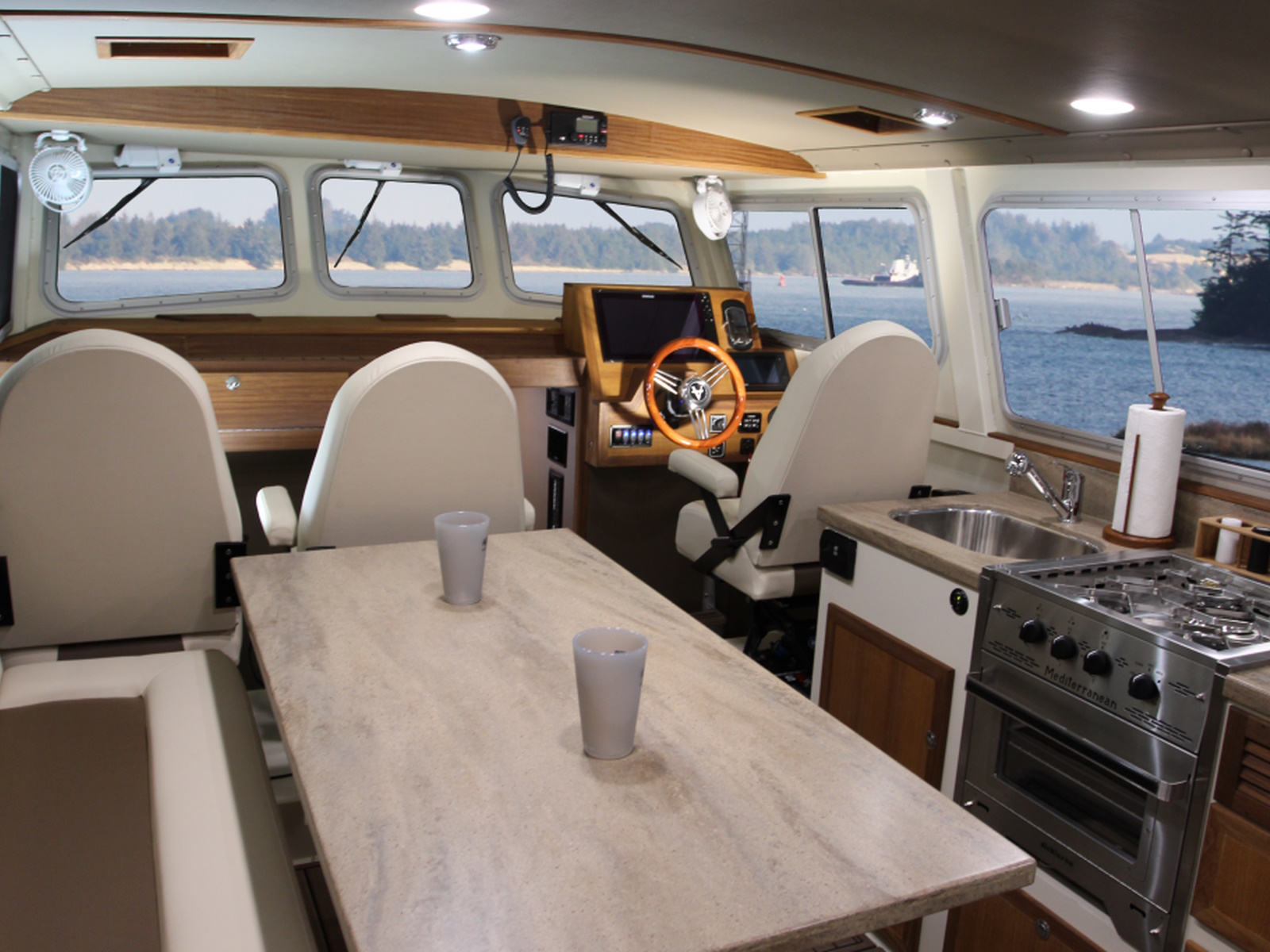 - 13′ Pilothouse with Alaskan bulkhead, offset isle way, DSG series sliding door and cabin windows