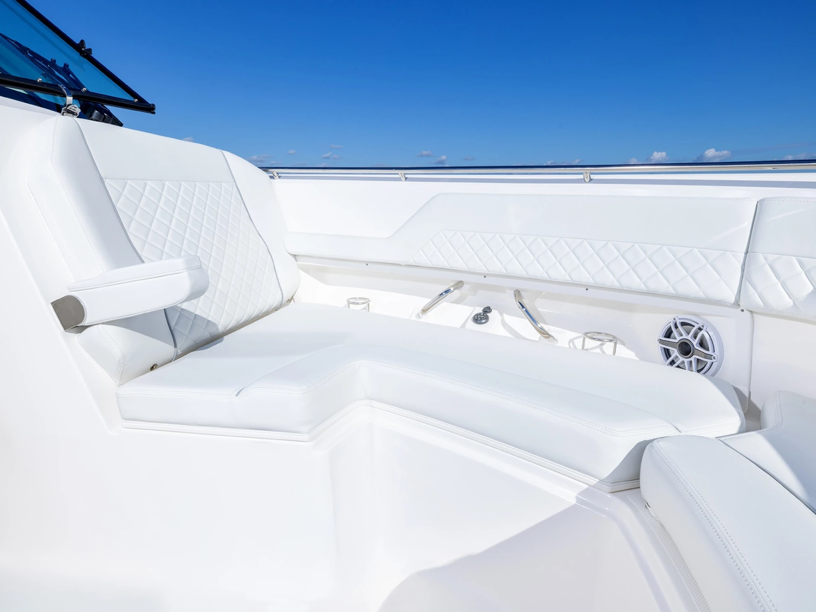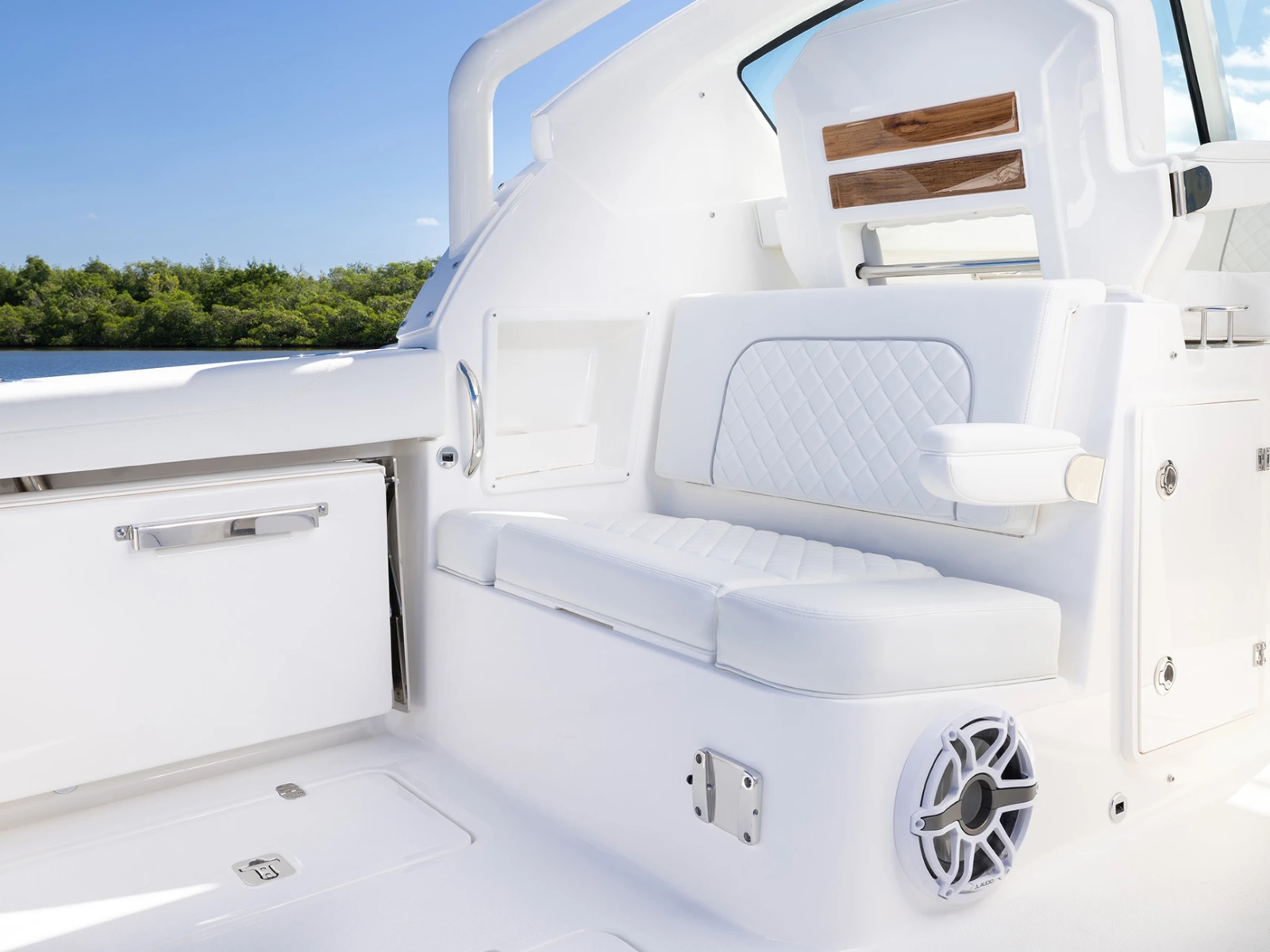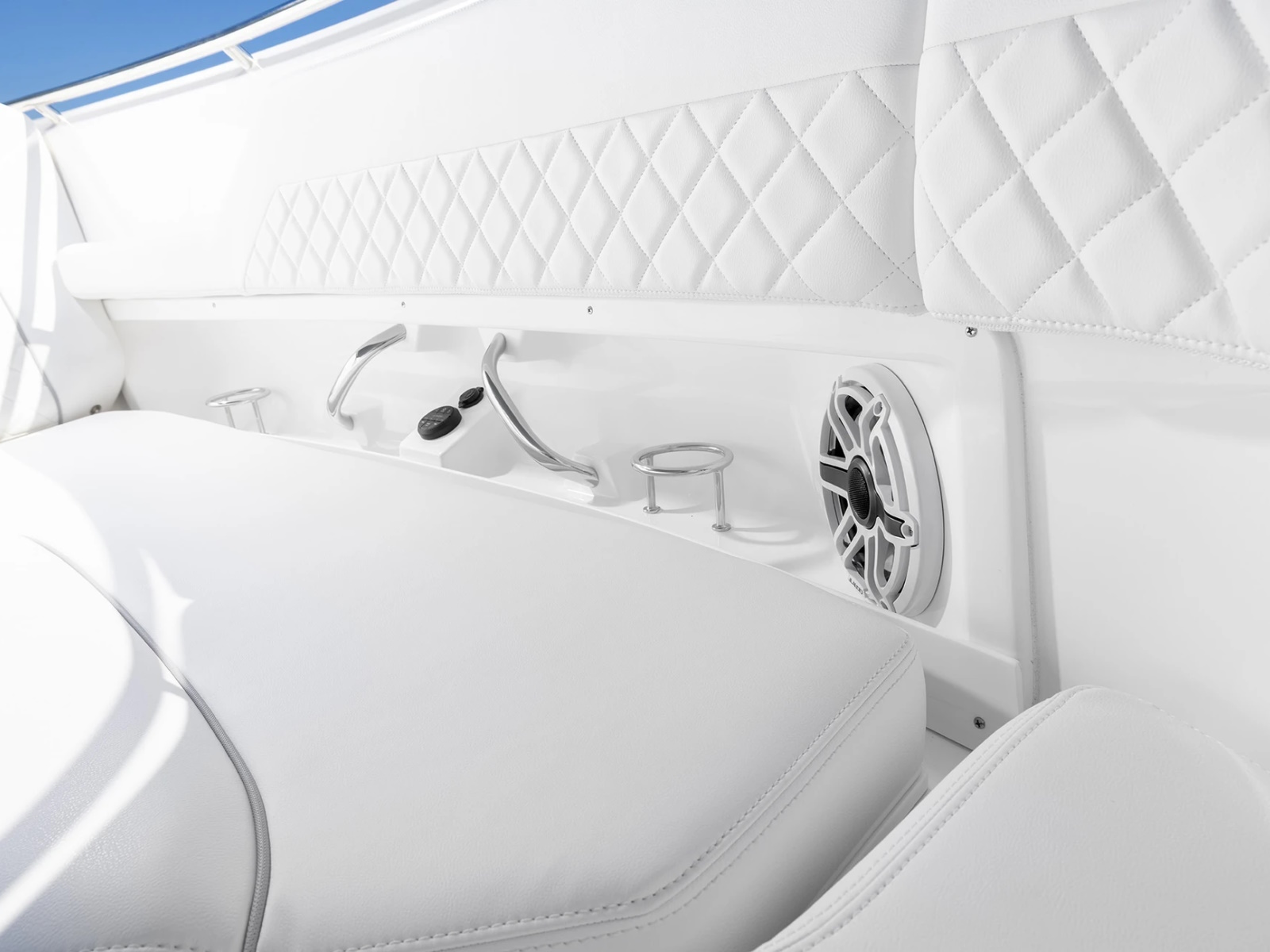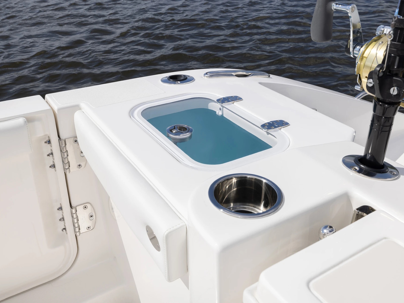 - Port and Starboard Forward Coaming Boxes with Four (4) Drink Holder, Storage Keeper, 12V and USB (A & C) Outlets, Mid-Level Lighting, Stereo Remote and (2) Speakers