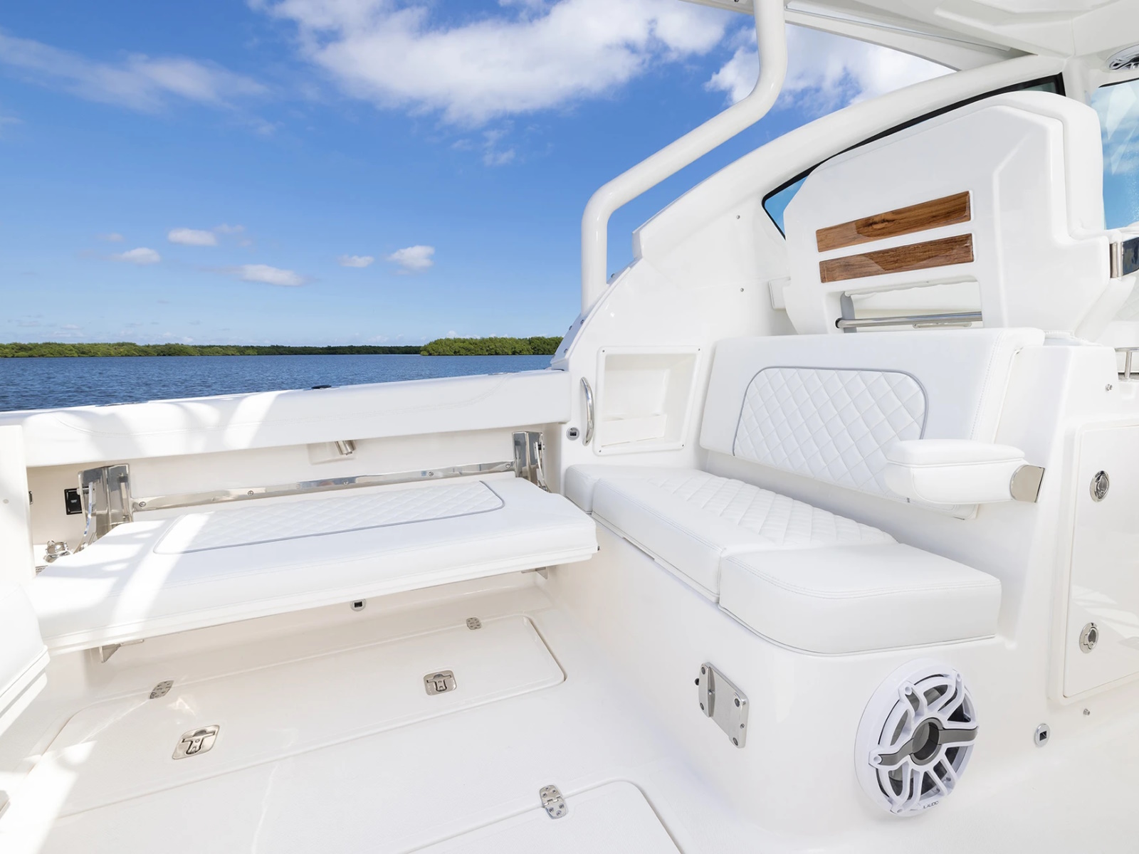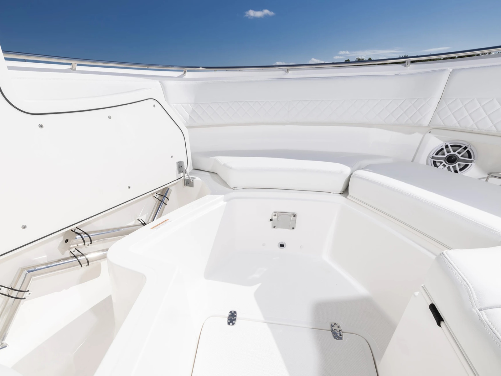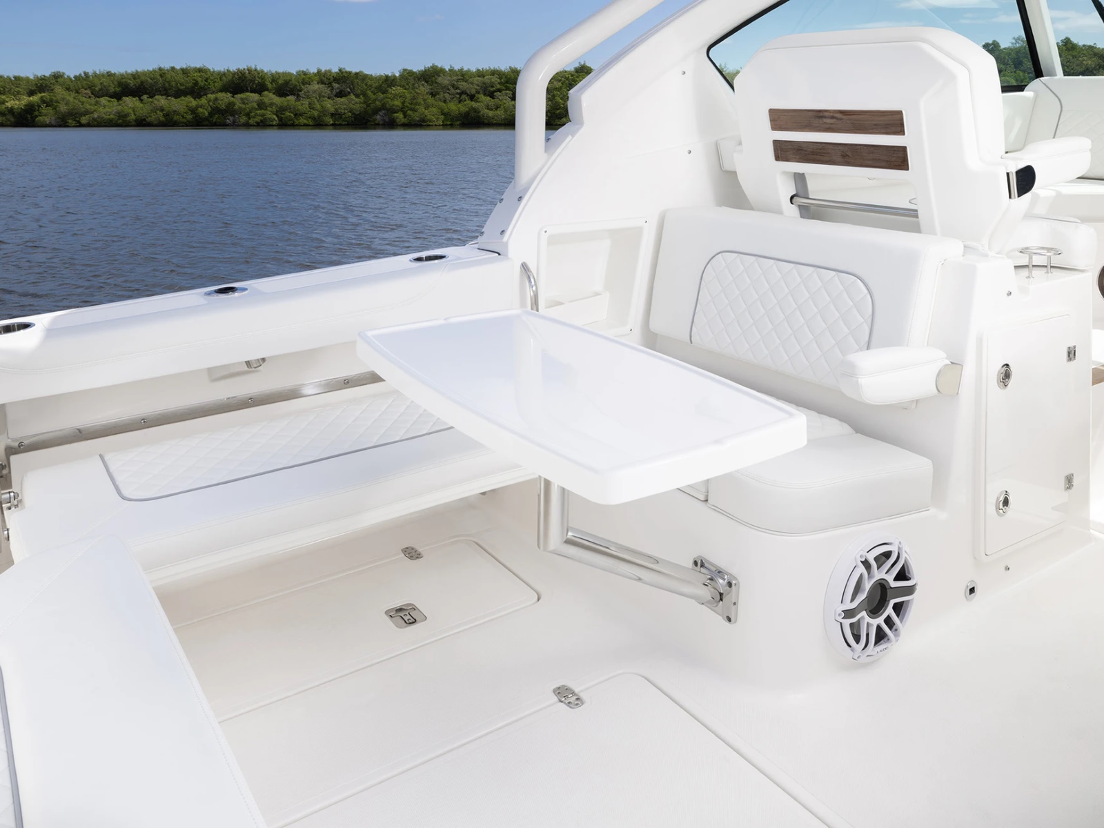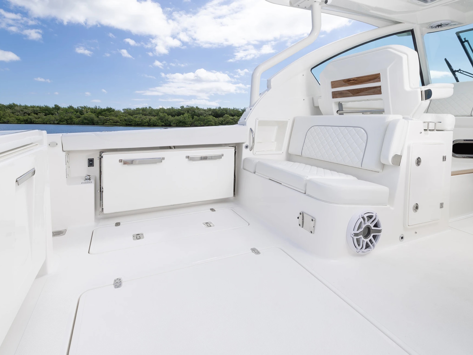 - Port and Starboard Forward Coaming Boxes with Four (4) Drink Holder, Storage Keeper, 12V and USB (A & C) Outlets, Mid-Level Lighting, Stereo Remote and (2) Speakers