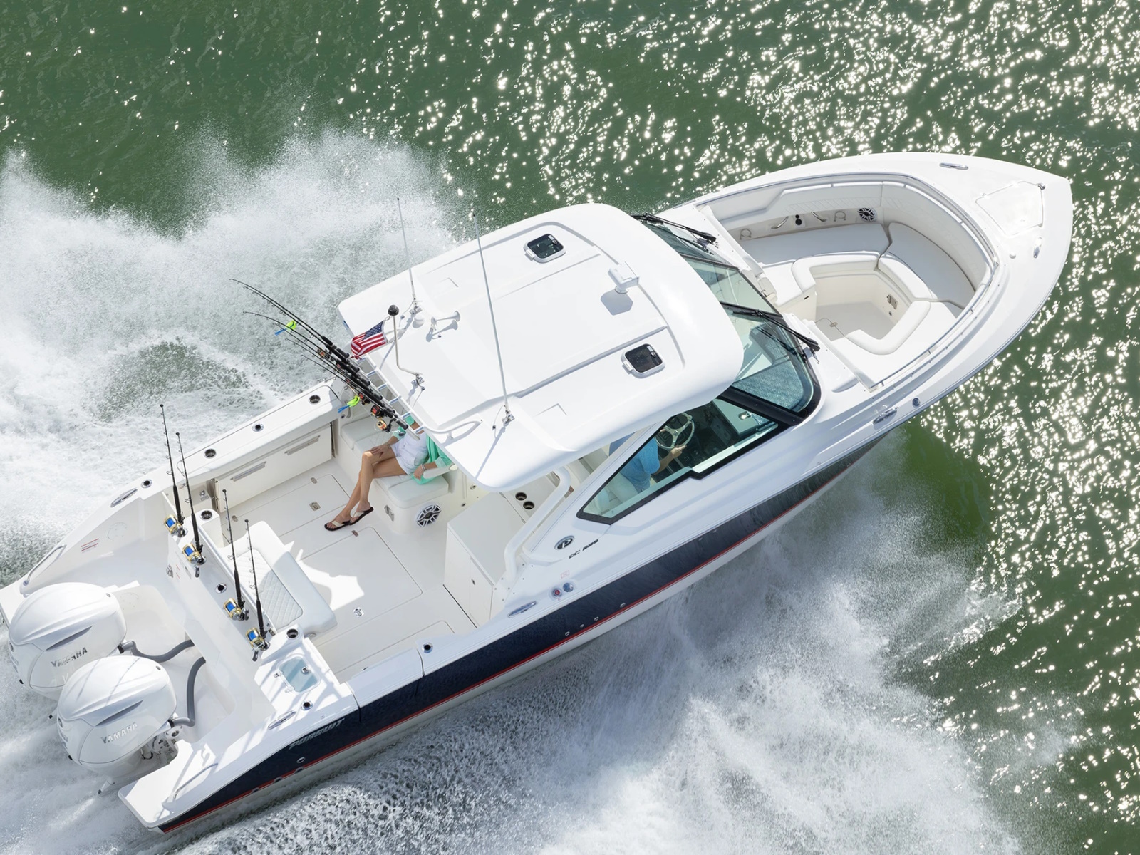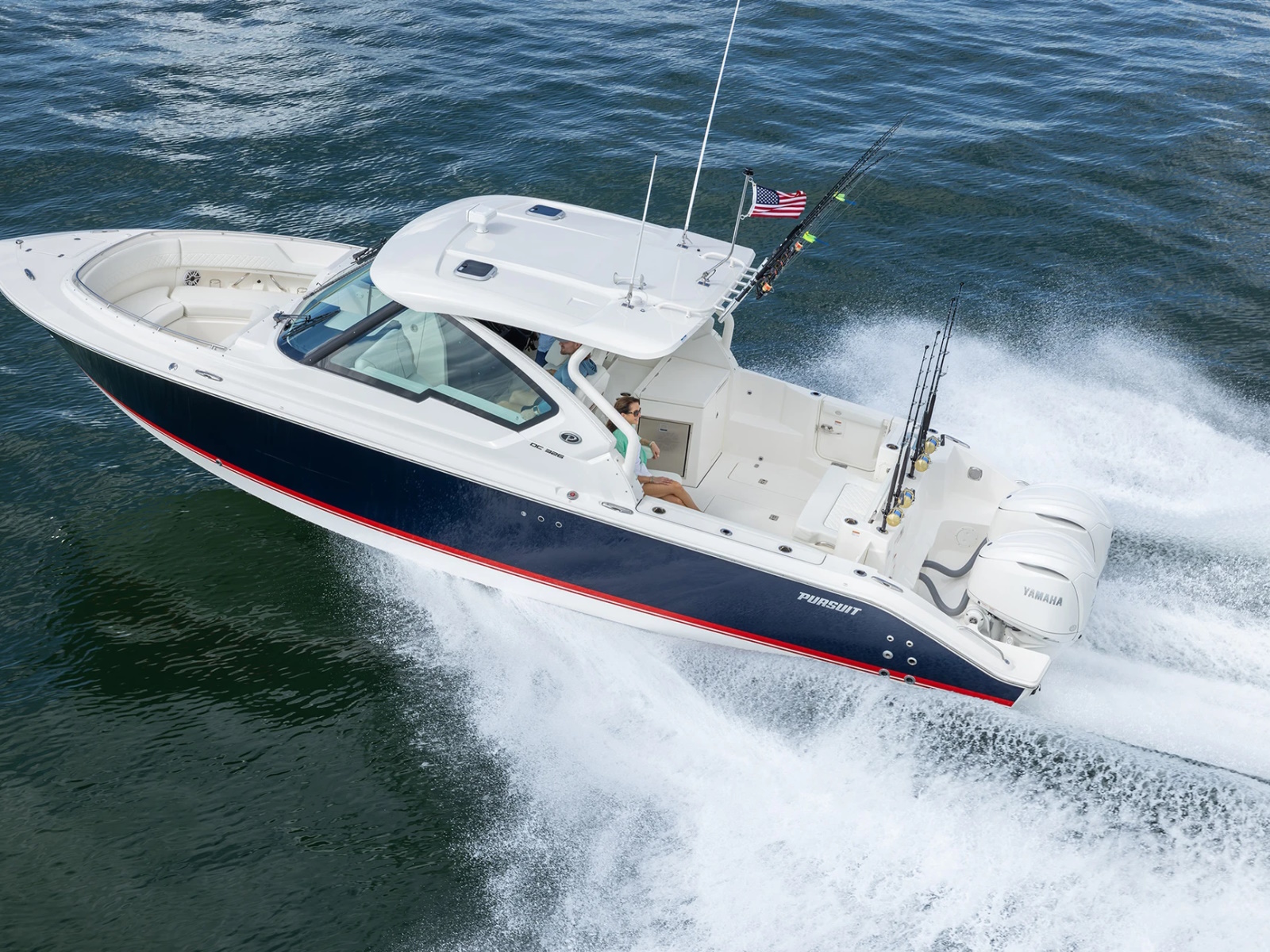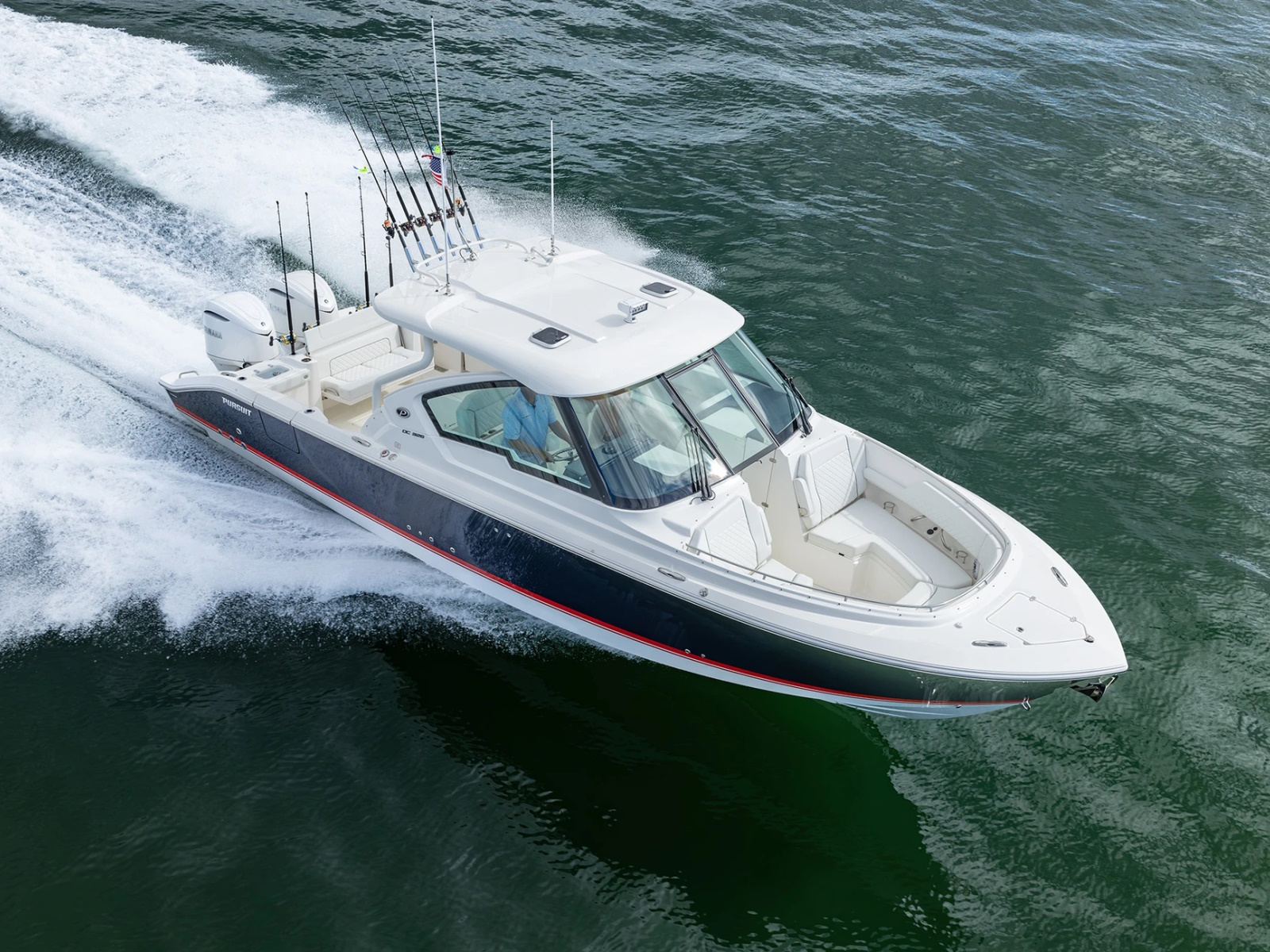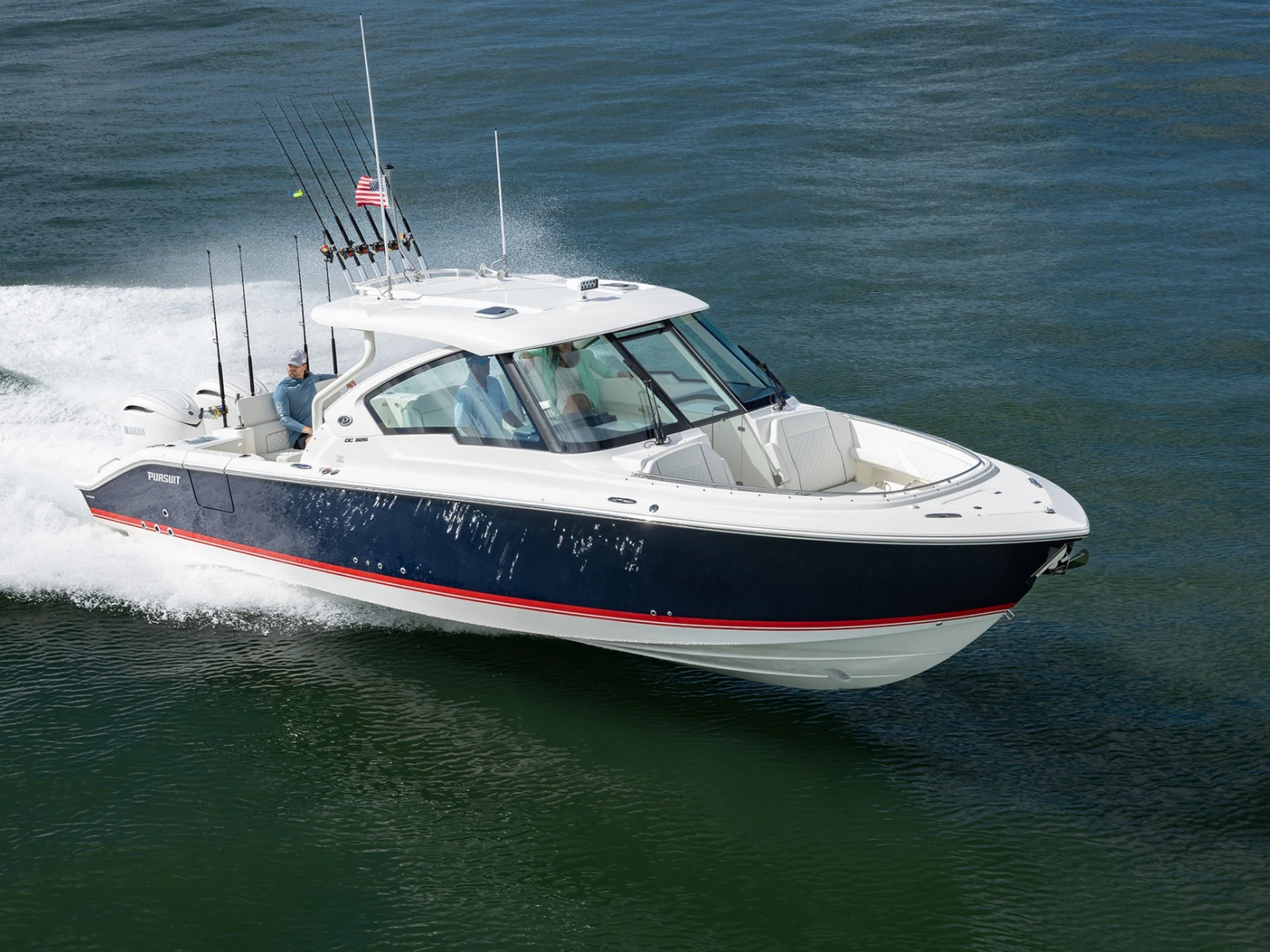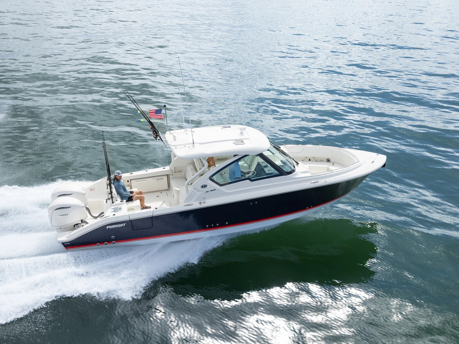 The DC 326 features a fully integrated fiberglass hardtop with tempered glass windshield, thoughtfully designed storage and starboard hull side door - all with the distinctive aesthetic of Pursuit’s Dual Console Boat series.
