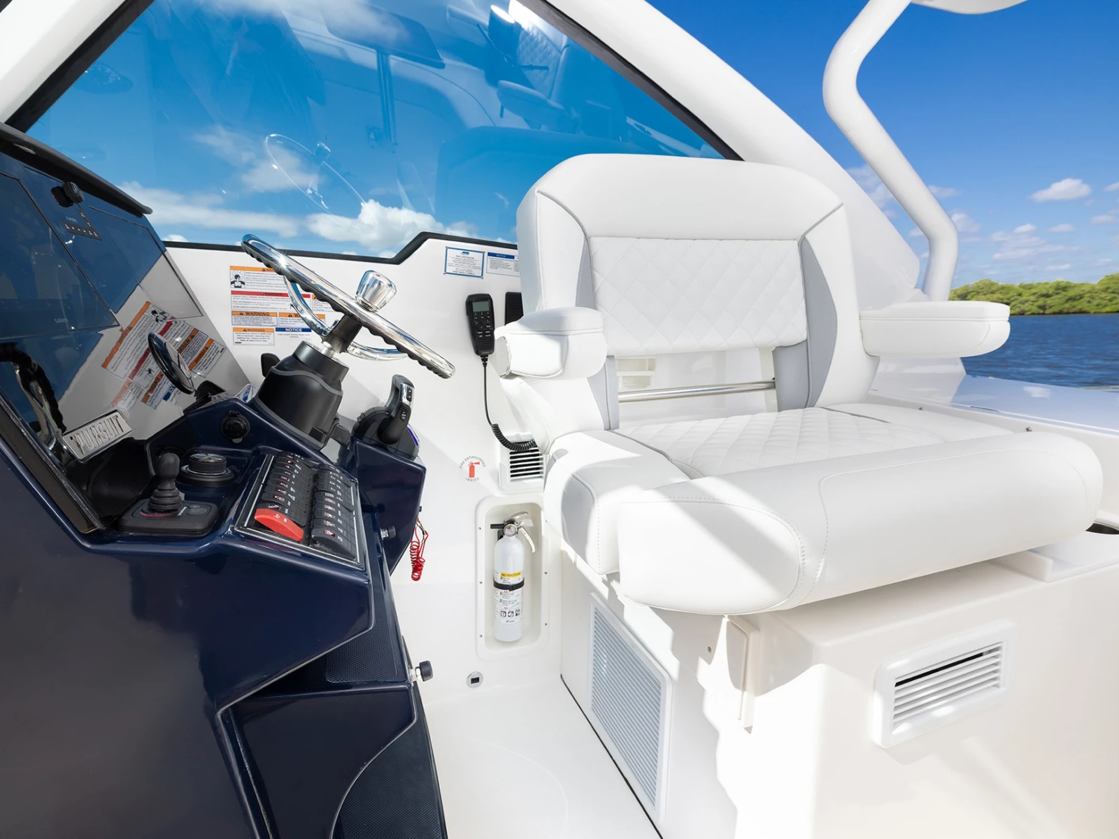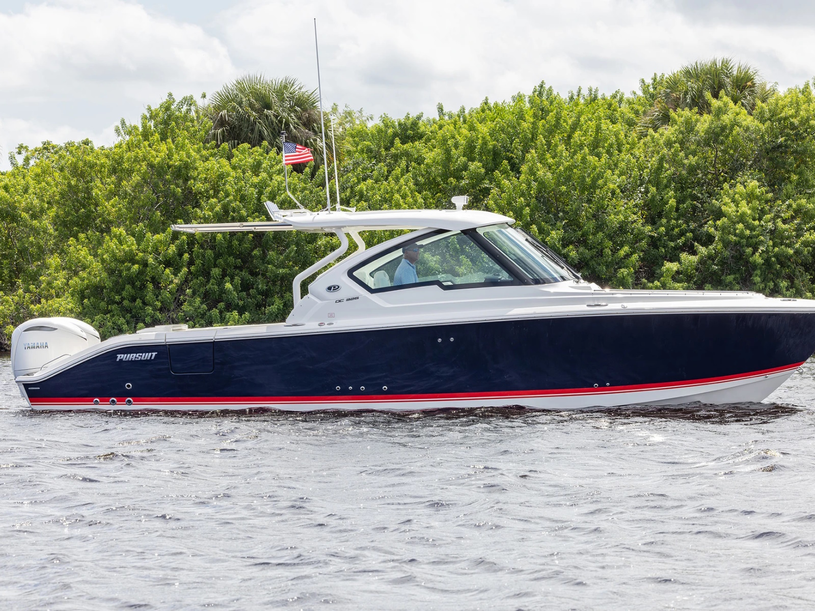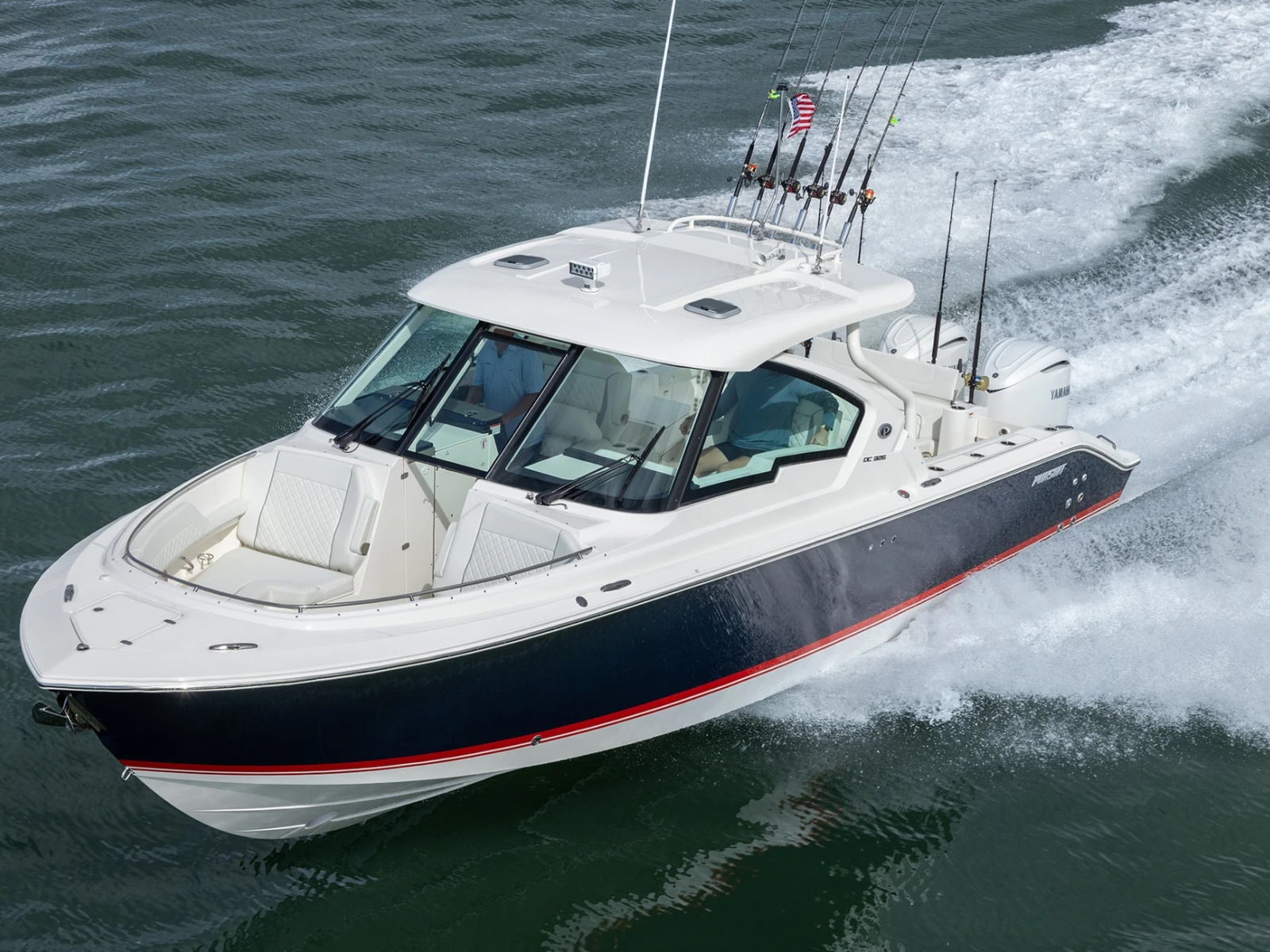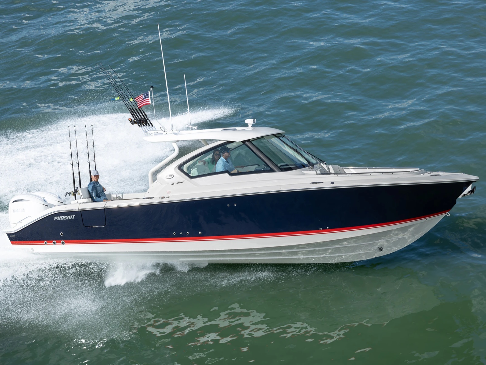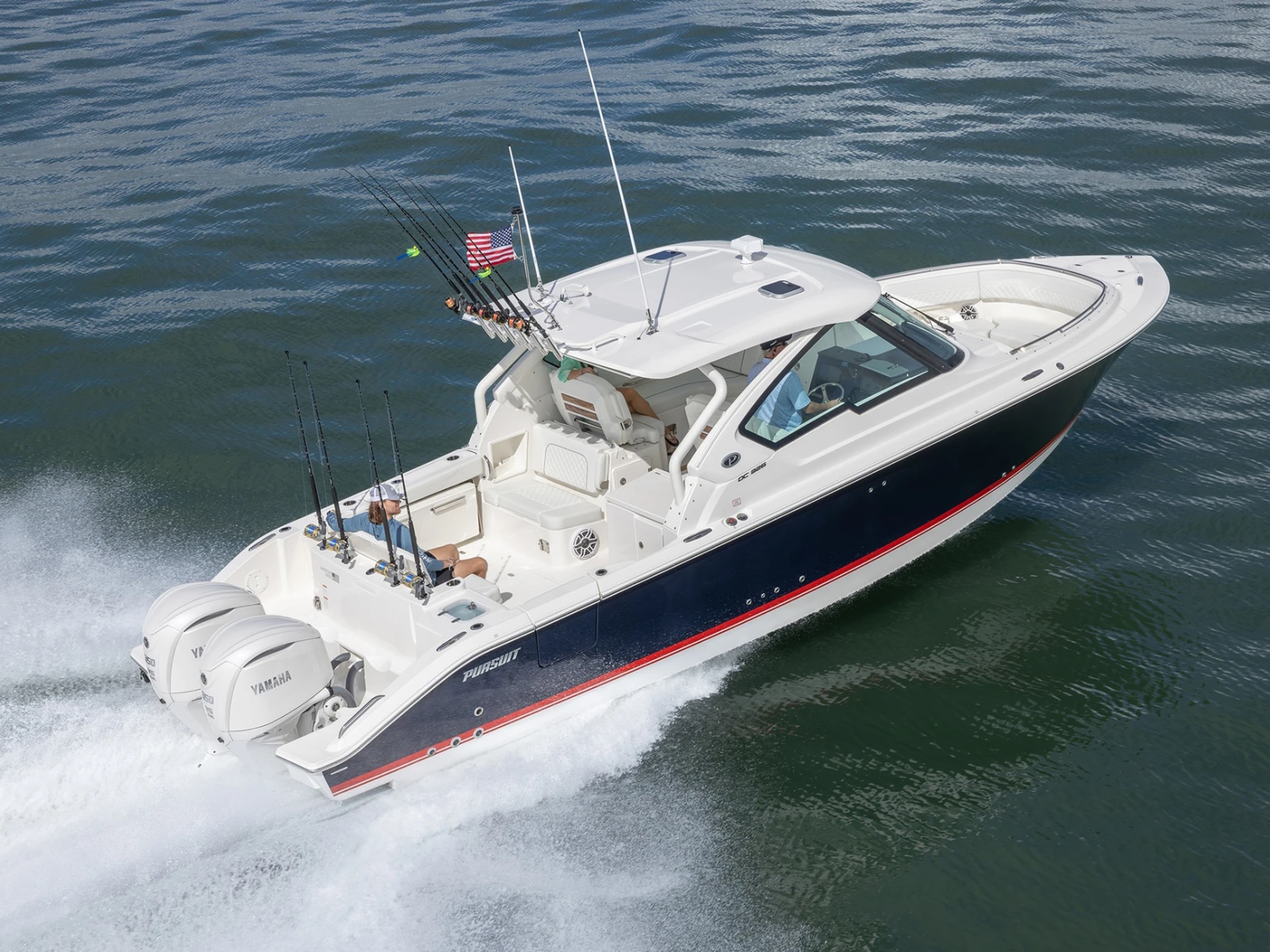 The DC 326 features a fully integrated fiberglass hardtop with tempered glass windshield, thoughtfully designed storage and starboard hull side door - all with the distinctive aesthetic of Pursuit’s Dual Console Boat series.