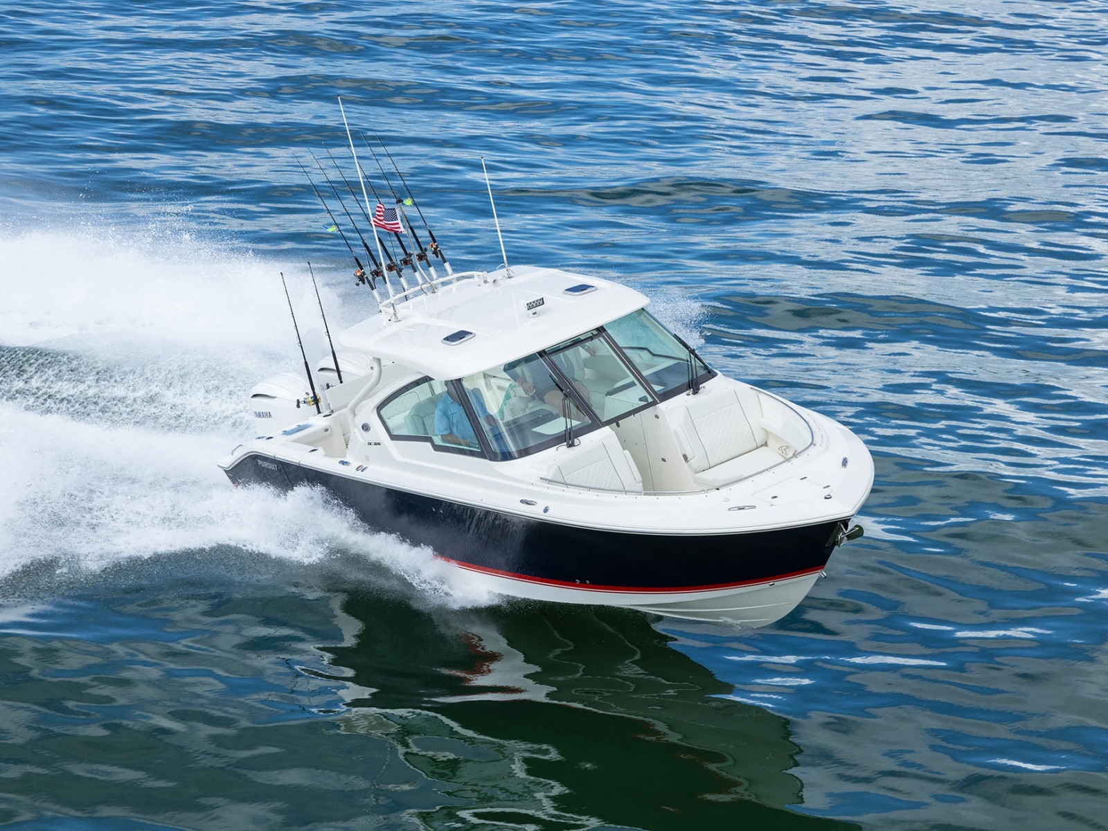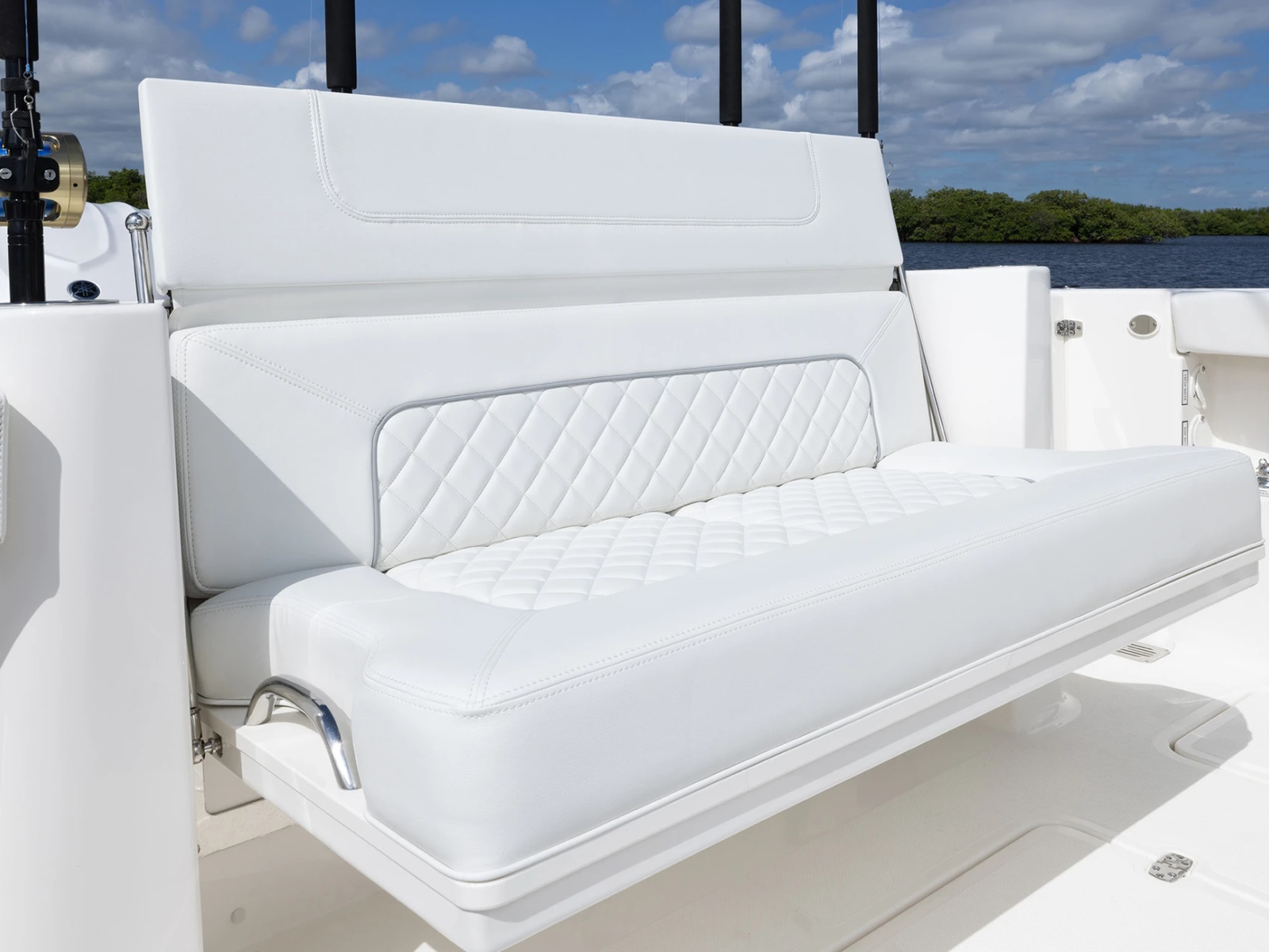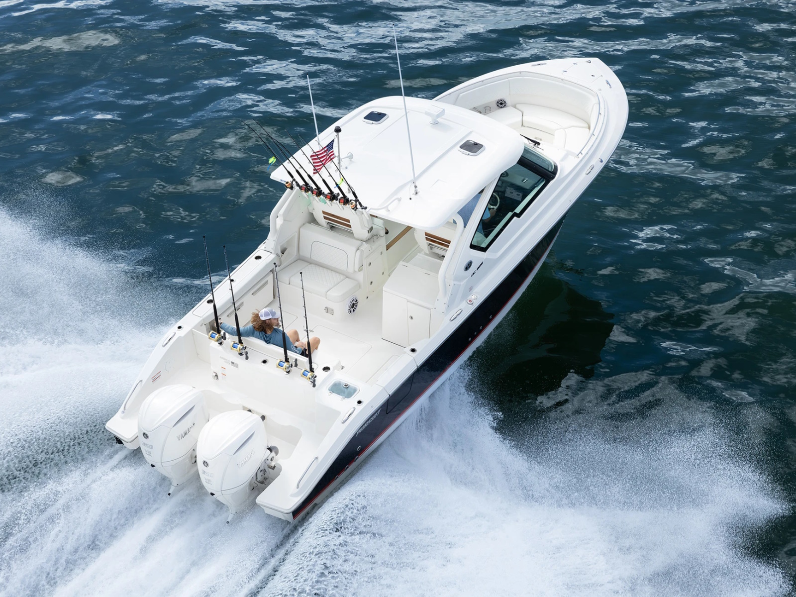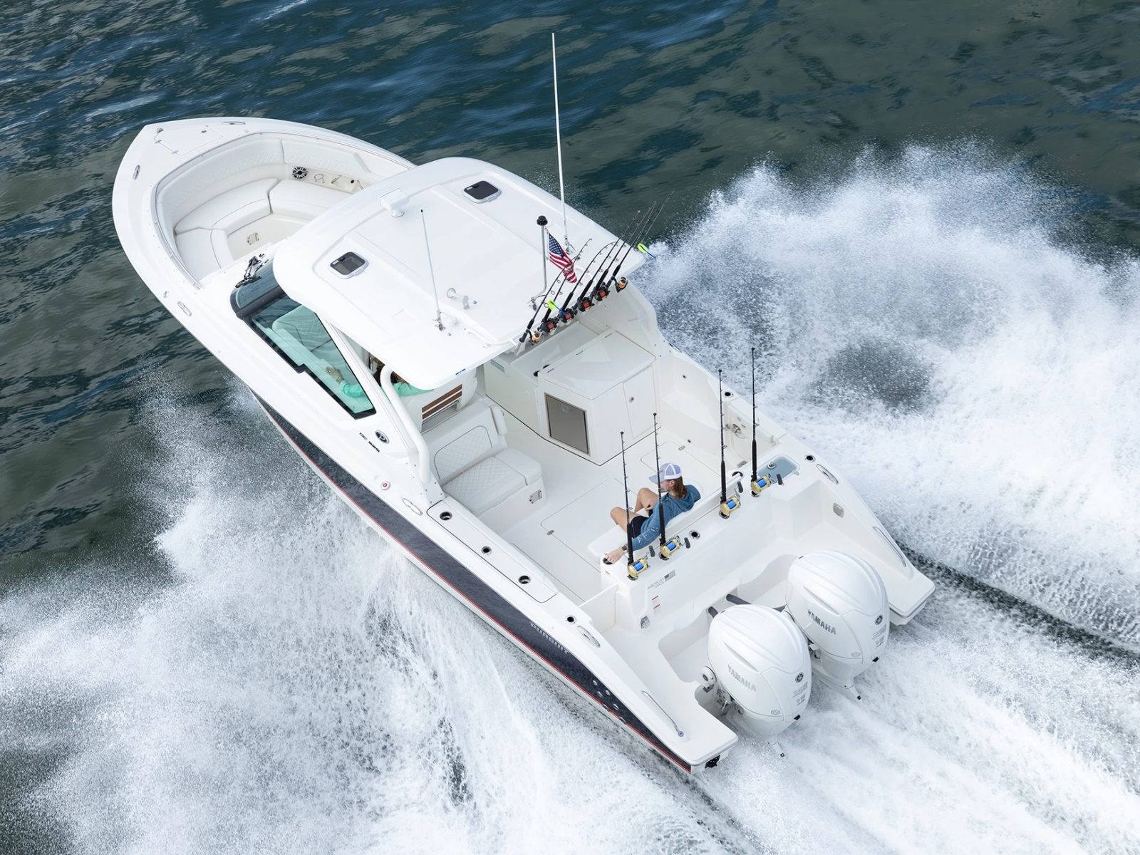 A port side wrap-around lounge, rotating helm seat, forward bow and foldaway cockpit seating offer plenty of room for friends, family and crew while rod holders, recirculating livewell and dedicated tackle storage are ready to fish.