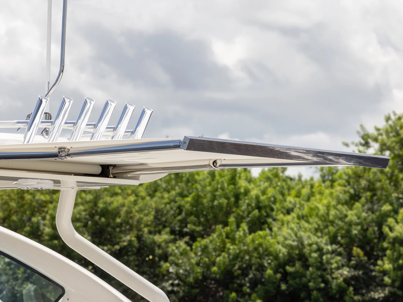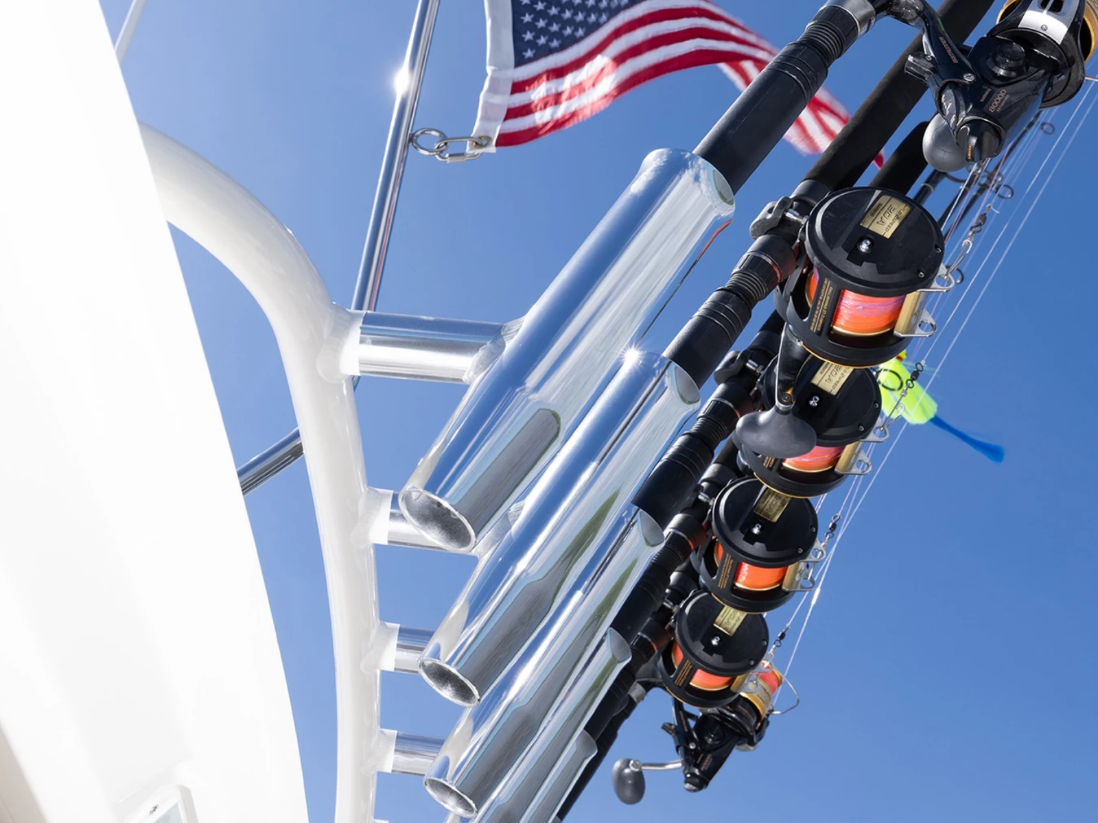 Hardtop Mounted Rod Holders (6)Outriggers – Gemlux Deluxe Stainless Steel Bases with 18' Collapsible Carbon Fiber Poles, Gemlux Premium Double Rigging Kits with Gemlox Halyard Locks and Line Caddys.