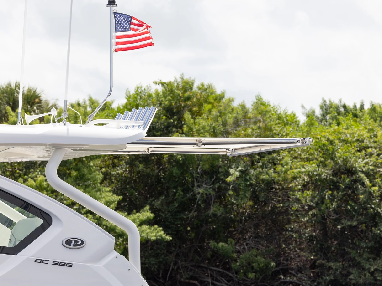 Custom Retractable Makefast Sunshade with One Touch OperationBow Mediterranean Style Sunshade, (Stowable) with Custom Embroidered Storage BagSunbrella® Canvas Color: Black, Tweed, Cadet Gray or NavyUpgraded Standard Side Canvas - Stamoid® with Polycarbonate Windows (White)Drop Curtain - Sunbrella® (Required with AC Package)Drop Curtain - Stamoid® (White) (3 Piece with 60 mil Strataglass)Aft Curtain - Sunbrella®Aft Curtain - Stamoid® (White)Instrument Cover - Sunbrella®Engine Covers - Sunbrella® (2)Bow Tonneau Cover - Stamoid® (White).