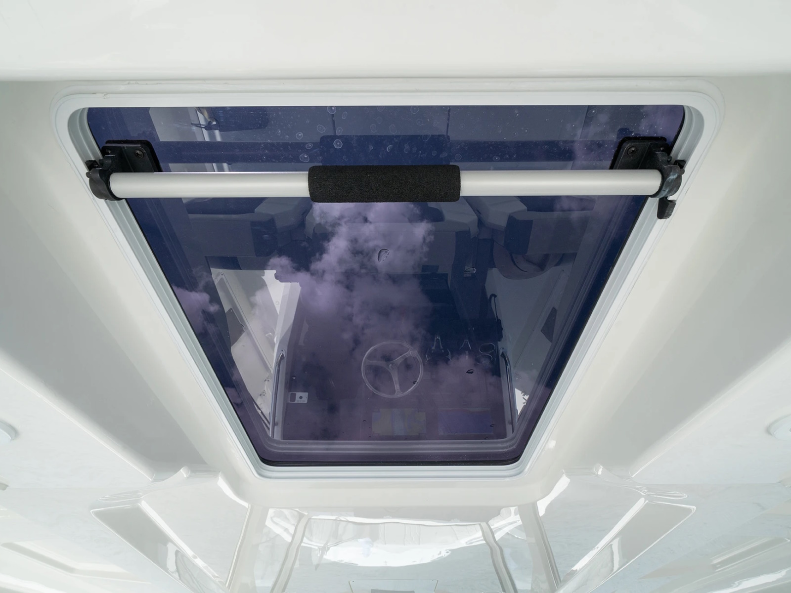 • Molded Fiberglass Full Beam Hardtop with Custom Sliding Access/Ventilation Hatch, Integral Grab Rails, Overhead Electronics Mounting Surface and Dedicated Locations for Outriggers and Electronics