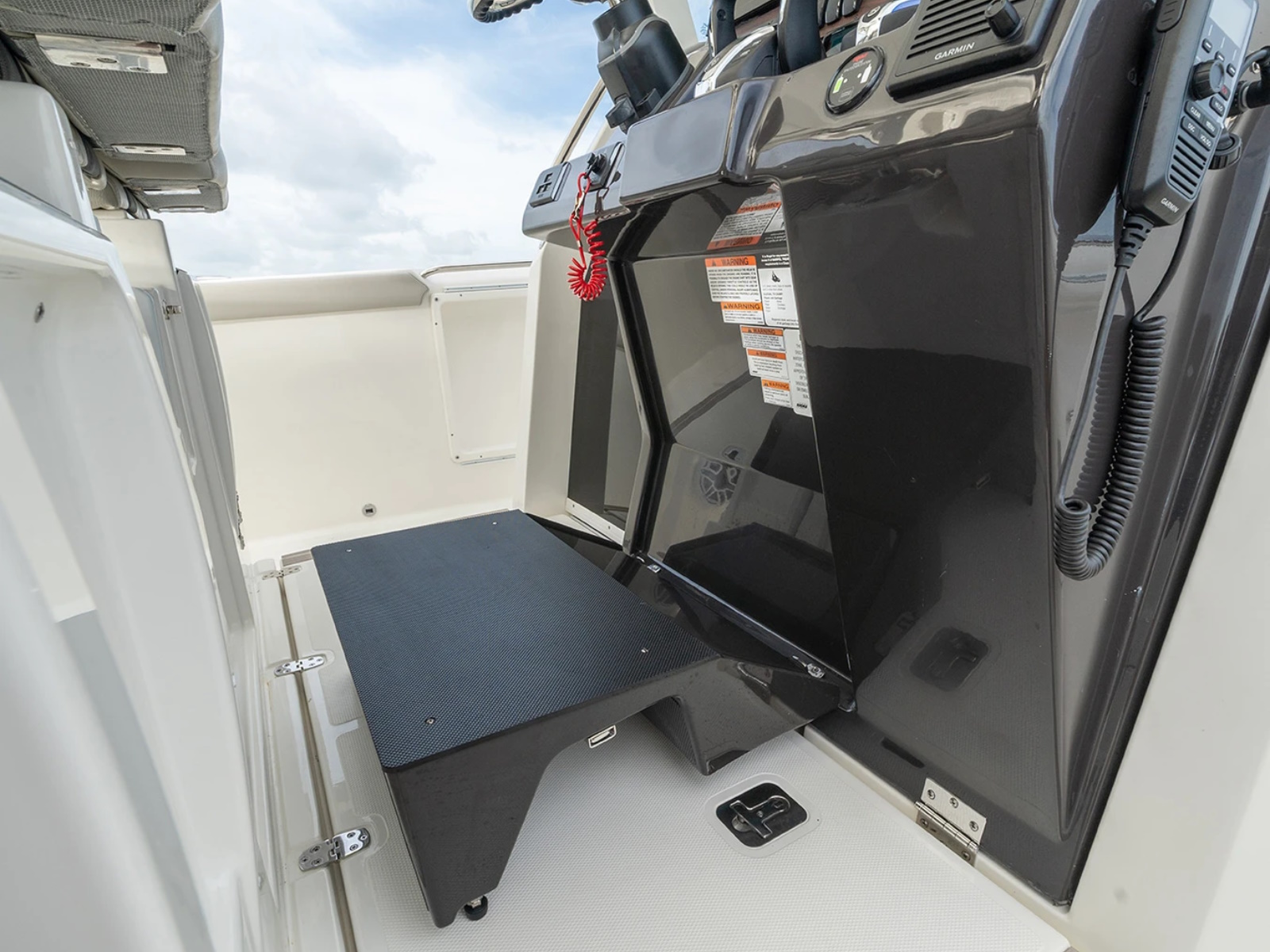 • Molded Fiberglass Aft Tilting Helm with Instrumentation Visor, Wood Accent Trim, Electronics Mounting Surface (Accommodates Dual 16” Displays), and Fold Out Fiberglass Footrest/Platform