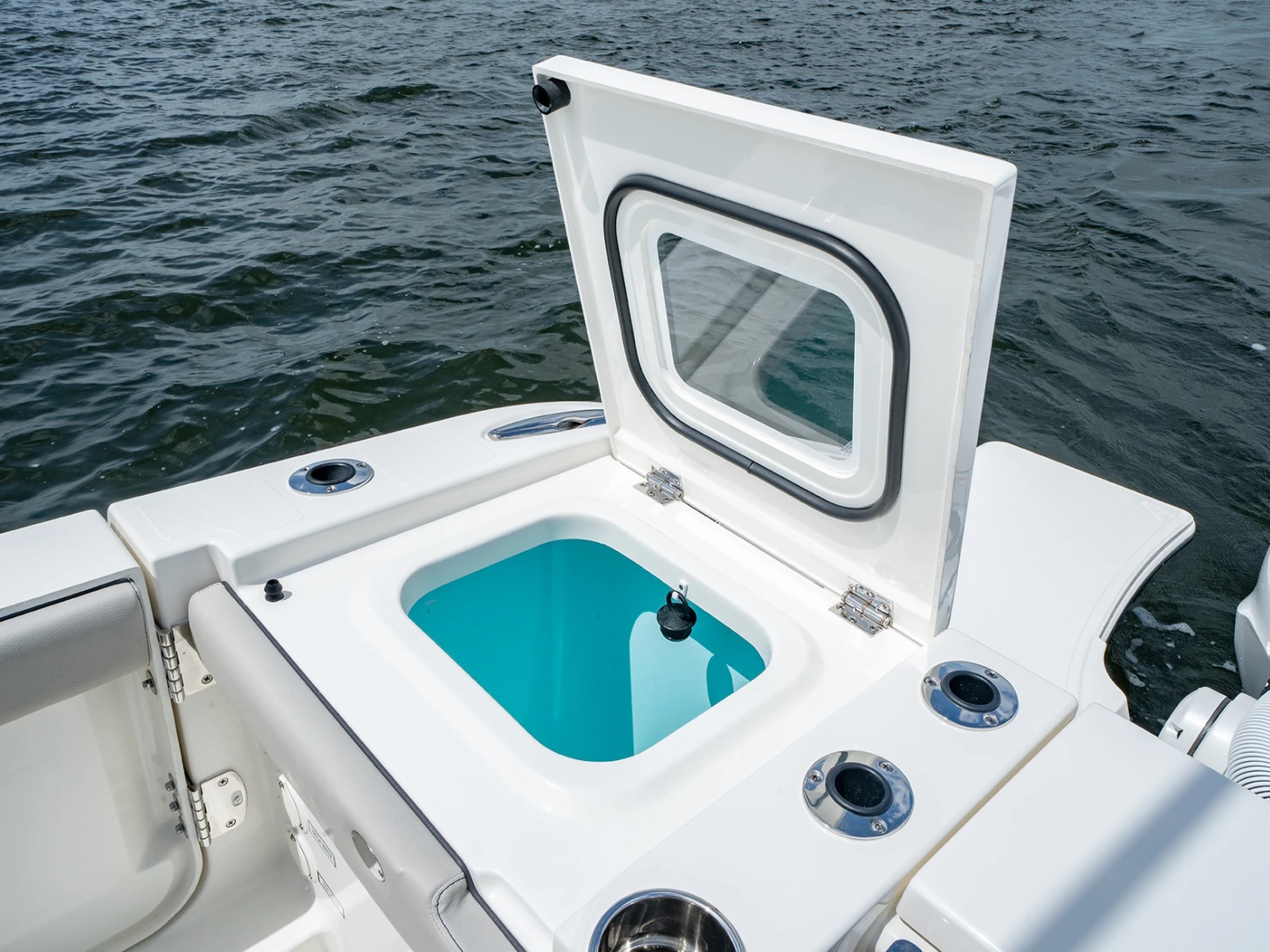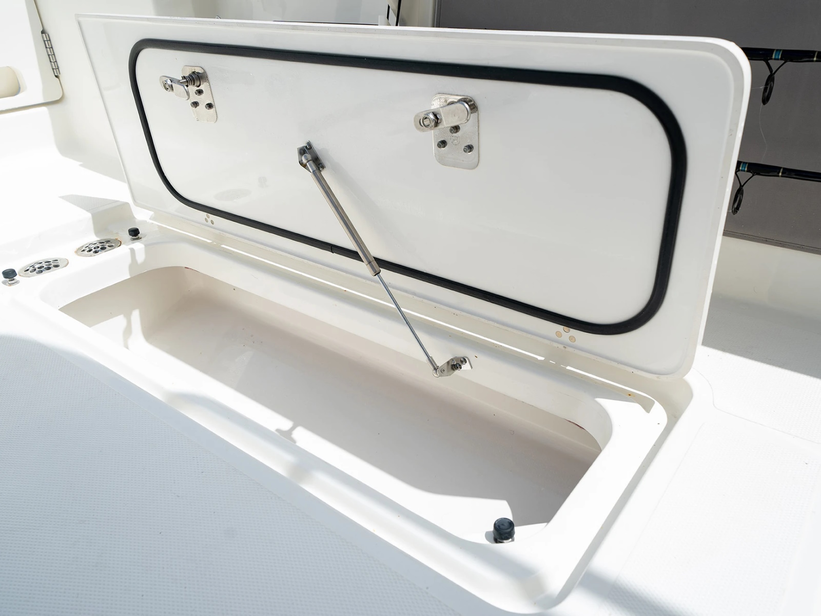 • Fish Boxes, In-Floor (port & starboard, 27 gallons each) with Molded Foam Insulation and Independent Diaphragm Discharge Pumps
