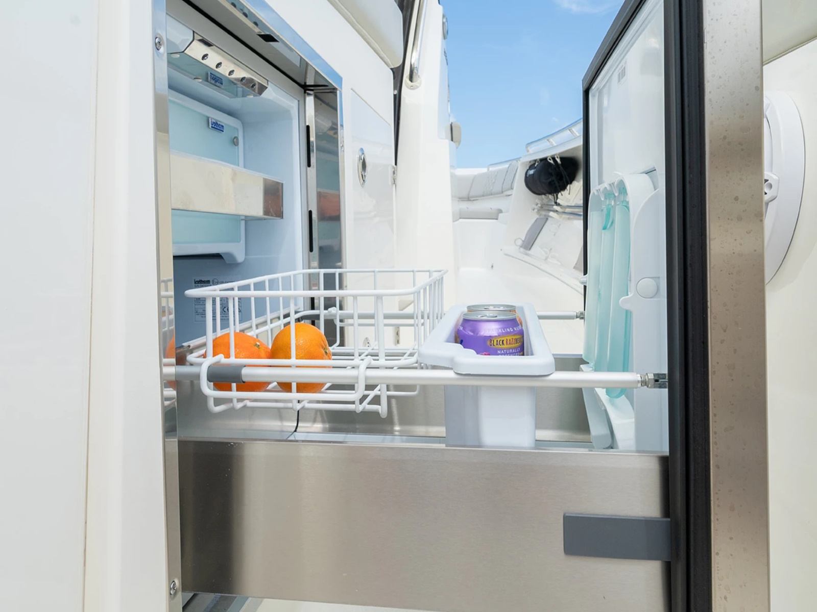 • Cockpit Entertainment Center: Sink with Removable Cutting Board & Fold-Down Faucet, Insulated Cooler Box, 120V Grill, 120V GFI Protected Outlet, Hinged Fiberglass Lids, 12V (2.3ft3) Pull-Out Style Stainless Steel Refrigerator, Slide-Out Trash Receptacle, and Bottle Opener