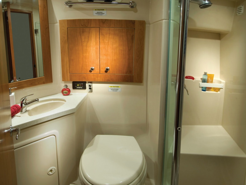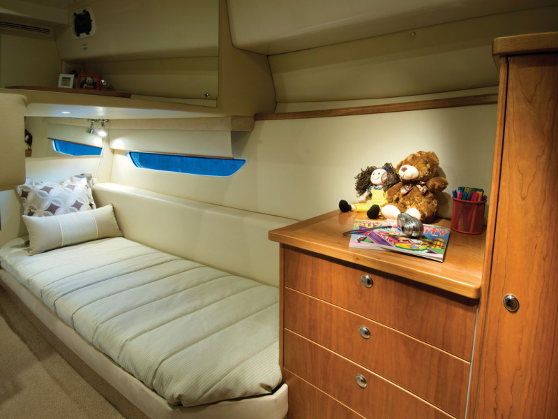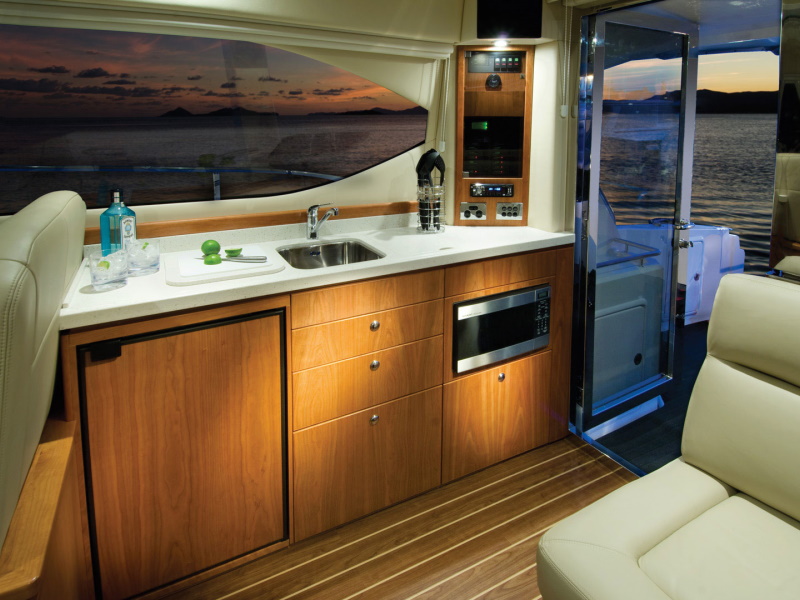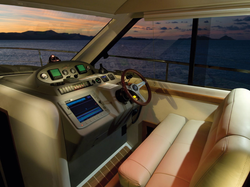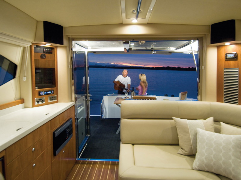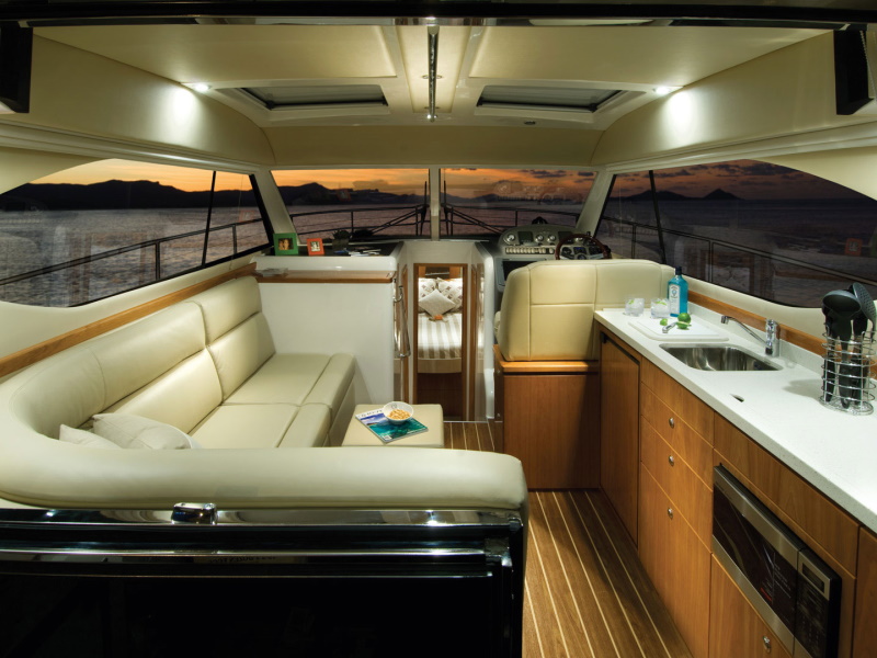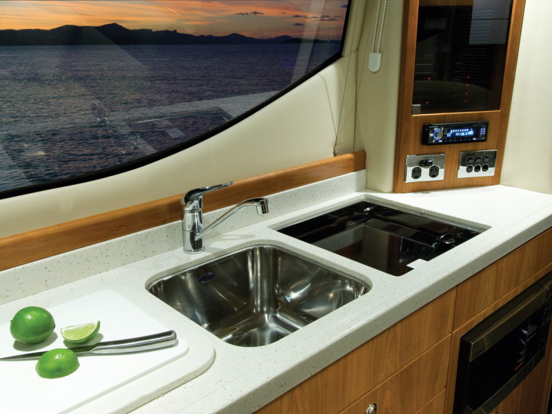 At every turn you will find Riviera ingenuity – such as the flat screen television in the saloon that raises and lowers out of sight at the touch of a button, the way the stainless steel swim ladder folds away, and the discreetly placed drink holders on the foredeck sunpad. As for comfort, the large L-shaped lounge with its soft leather and deep cushions is probably more inviting than the lounge in your living room.