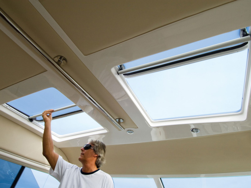 One of the most striking features of the 3600 Sport Yacht is the large rear awning window and door between the cockpit and saloon. Not only is it extremely stylish with tinted glass set in a bold, highly polished stainless steel frame, it opens up to create the ultimate indoor-outdoor feeling. The two areas seamlessly flow into one to produce a unique alfresco experience.