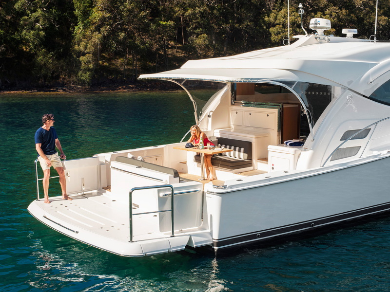 The swim platform, with lift-out stainless steel rails, also has a number of options to suit individual owner requirements, for example: custom rod holders and a bait preparation station can be fitted for the angler, as well as a 400kg hydraulic lift to assist with tender storage.