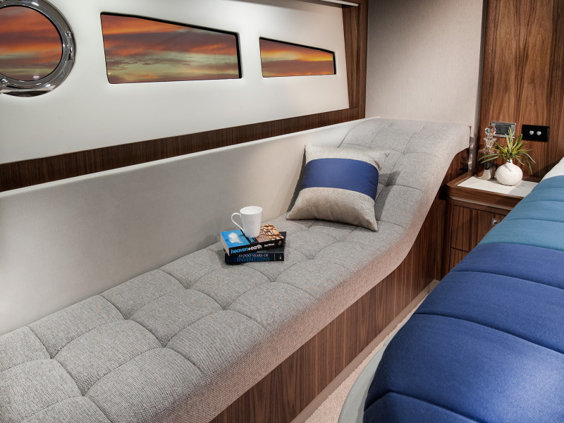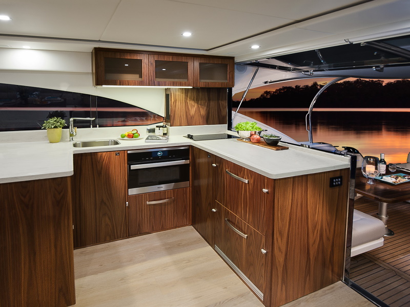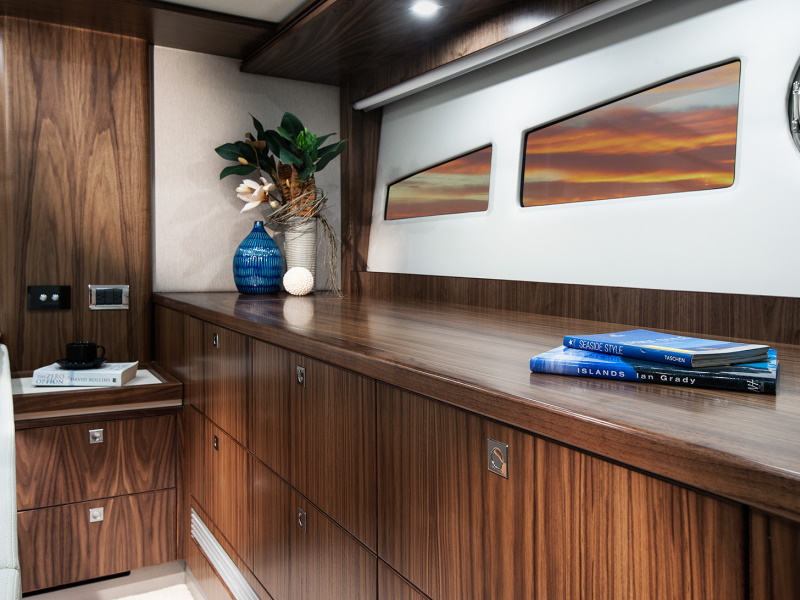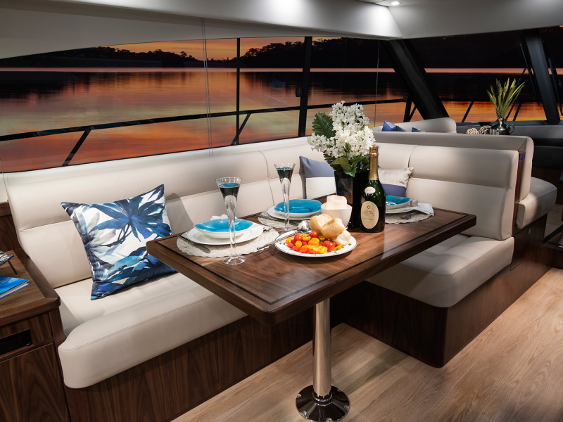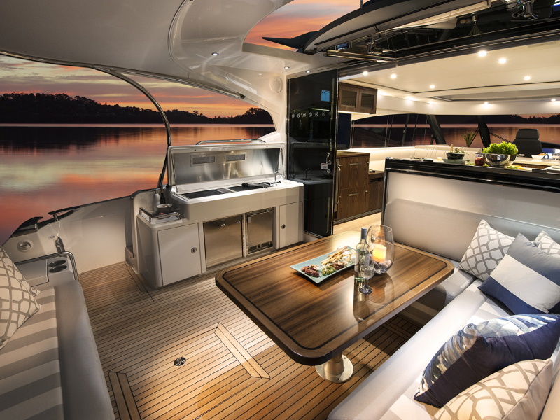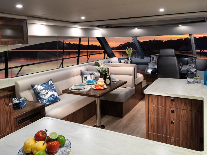 Even before you step aboard, you will notice that our talented Riviera team has created an entirely fresh design with a sleek new profile along with stylish hull windows and portholes, recessed for enhanced protection and aesthetic appeal. You will also notice that key design cues have been taken from the extremely popular 6000 Sport Yacht which has enjoyed considerable international success since her launch.