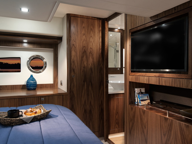 The 5400 Sport Yacht also offers remarkable roominess throughout her massive entertainer’s cockpit, her luxurious saloon and down to the accommodation deck, where a full-beam master stateroom with private ensuite serves as a private retreat for her fortunate owners.