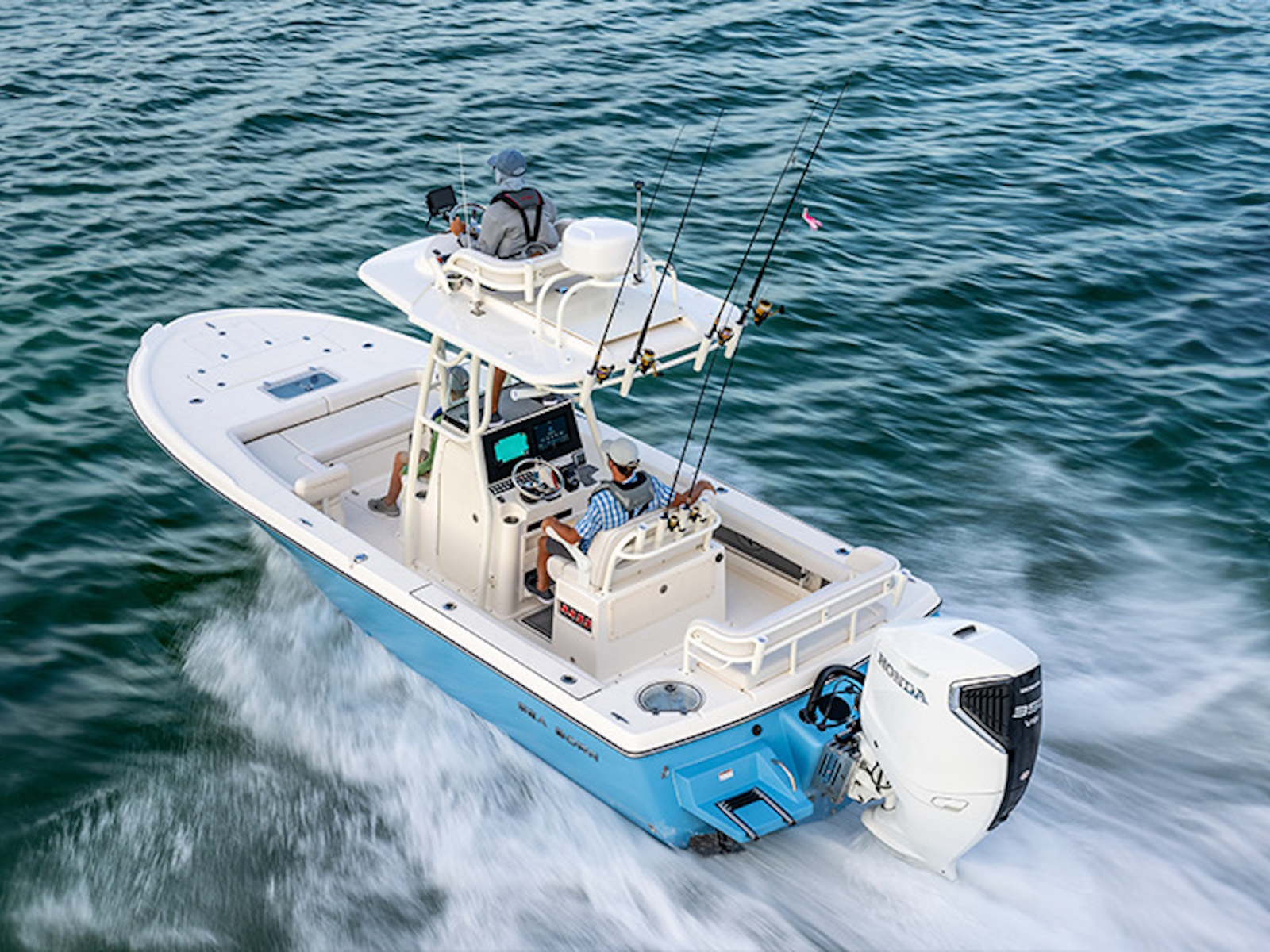 The flagship of the Sea Born bay boat lineup, the FX25 turns heads as one of our most sought-after models for the serious angler. Built on a stable 105″ beam with a single-step hull for improving performance, the FX25’s sportfish-style transom and large forward casting deck make it a true hybrid and dual threat for both inshore or offshore.