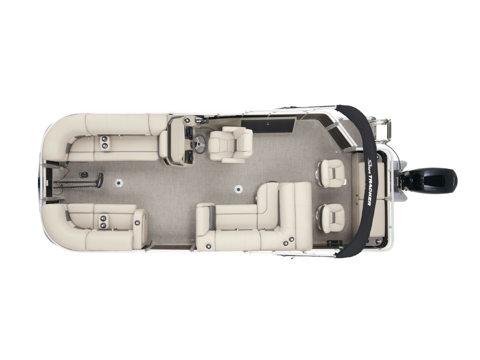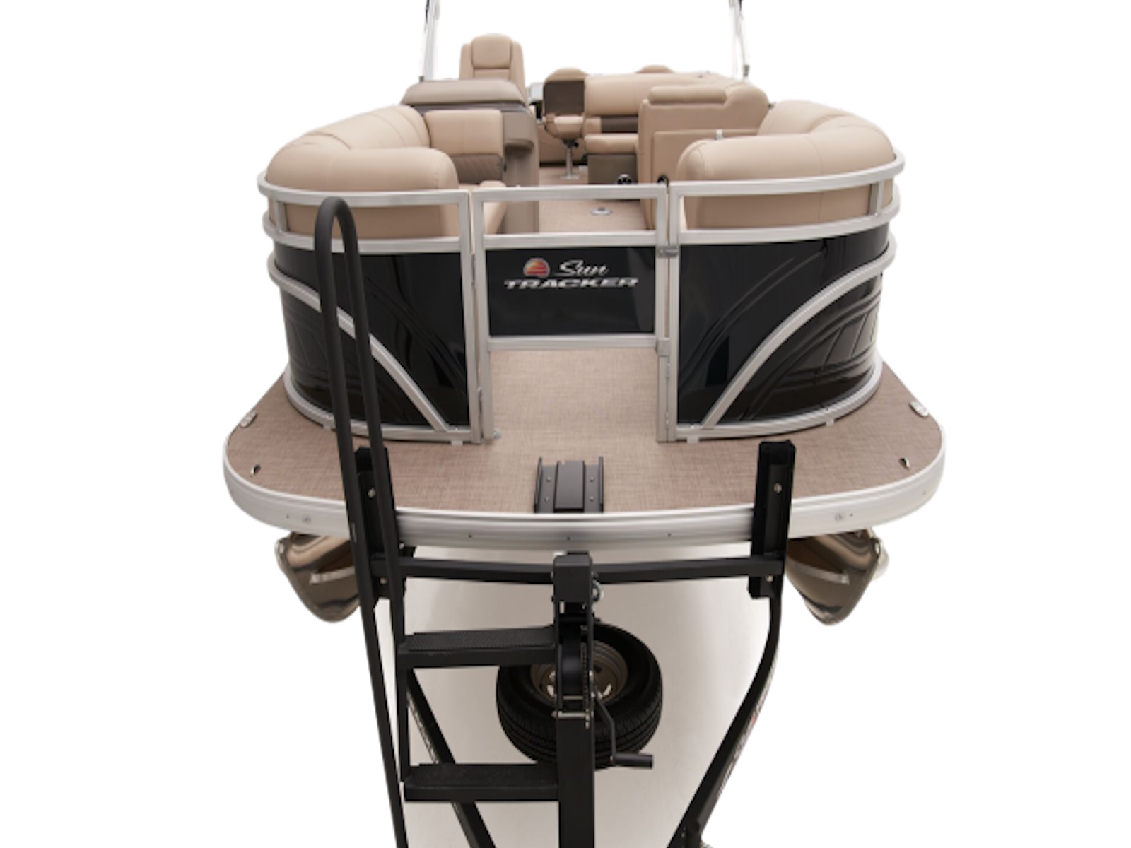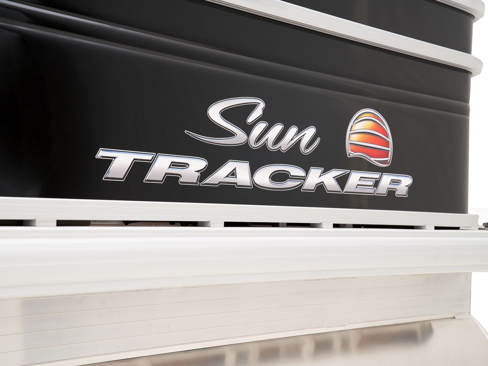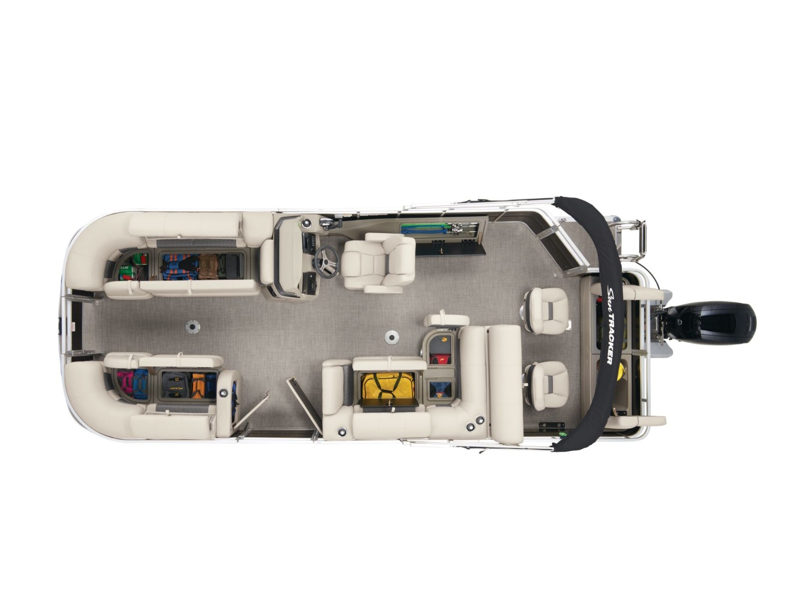 This SUN TRACKER® pontoon boat offers room for up to 10 passengers on its 22' deck. The anglers will love the aft fishing deck with dual swiveling fishing chairs that you can fold and remove, a lockable rod compartment, rail-mounted rod and tool holders, and an aerated livewell under the rear bench. Keep your fishing accessories organized in the tackle-storage station.