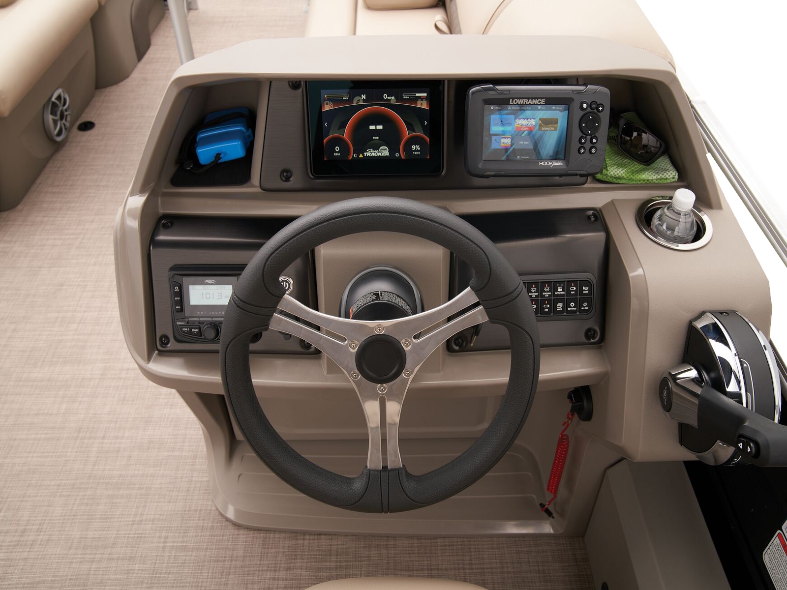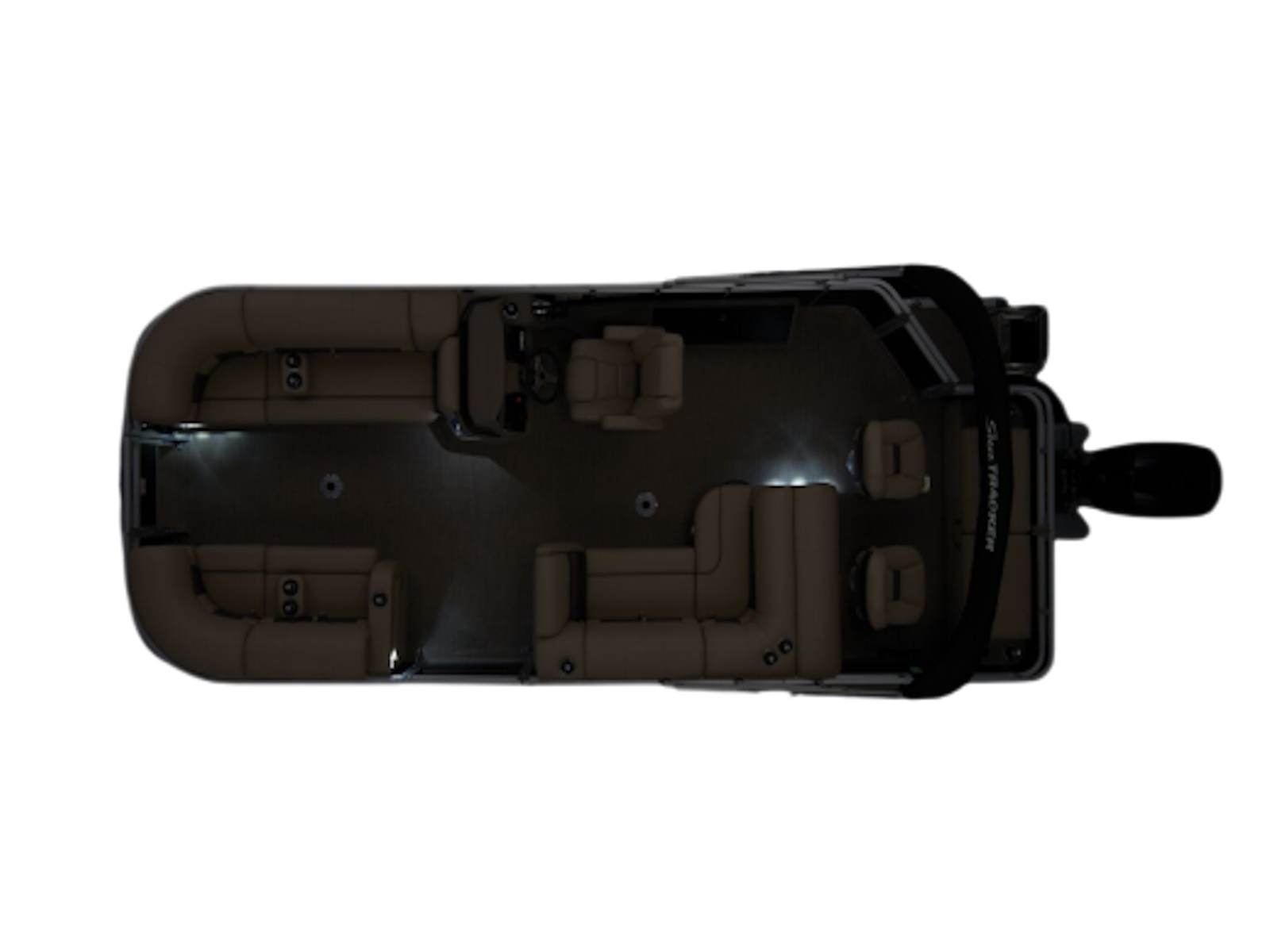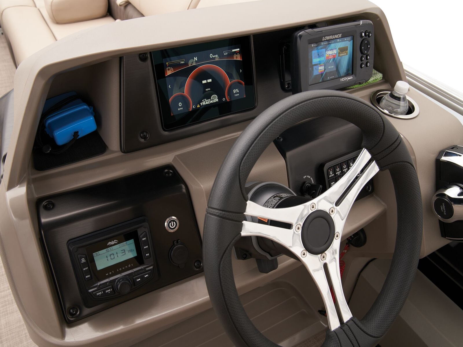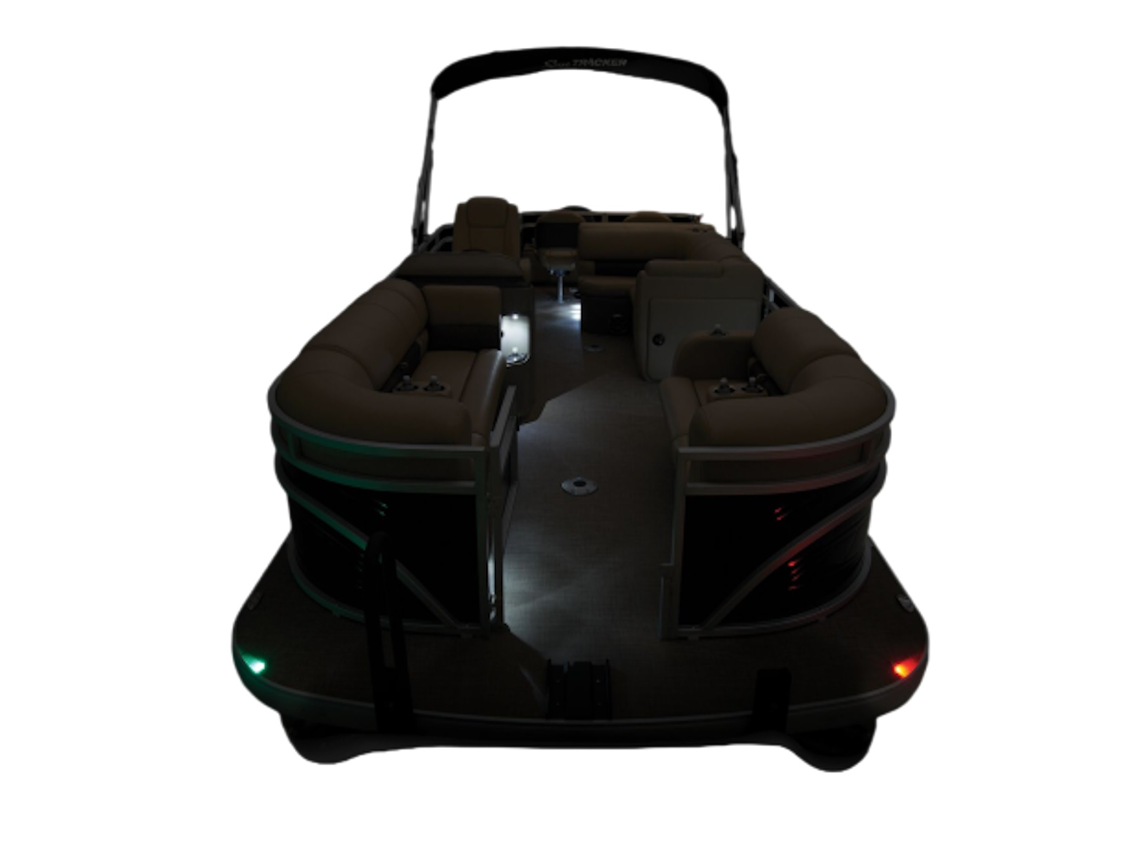 - 10' (3.05 m) SUN TRACKER® QuickLift™ Bimini top w/LED courtesy lights, storage pockets & protective boot (color-coordinated Black w/Black fencing or Sand w/Caribou fencing)