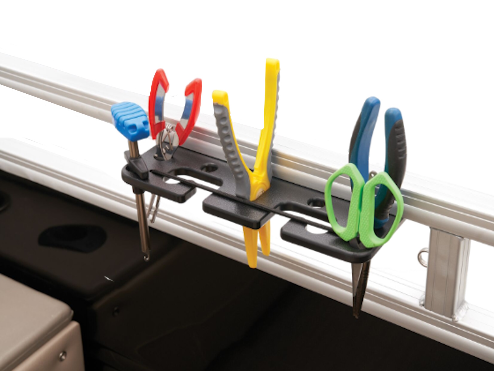 - Aft fishing station w/2 pedestal seat bases; rail-mounted rod & tool holders; STOW MORE™ tackle storage station; & rear-facing tackle storage