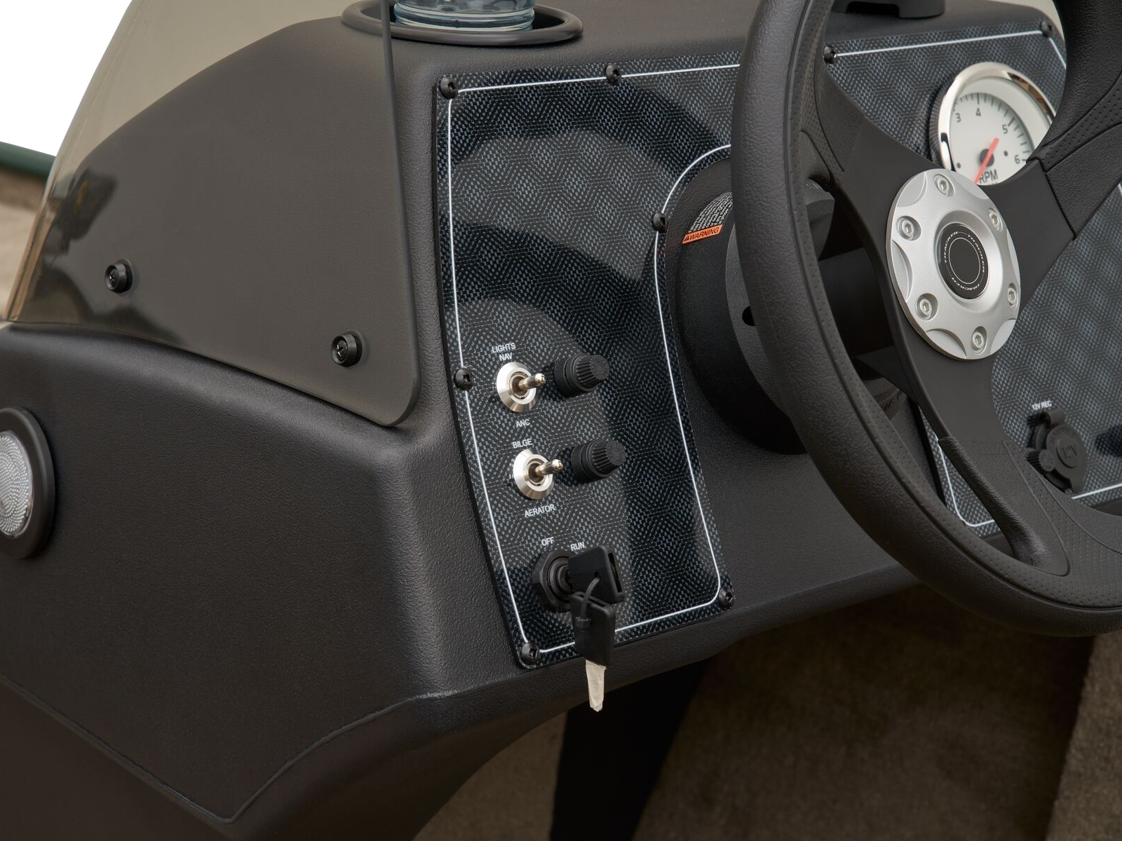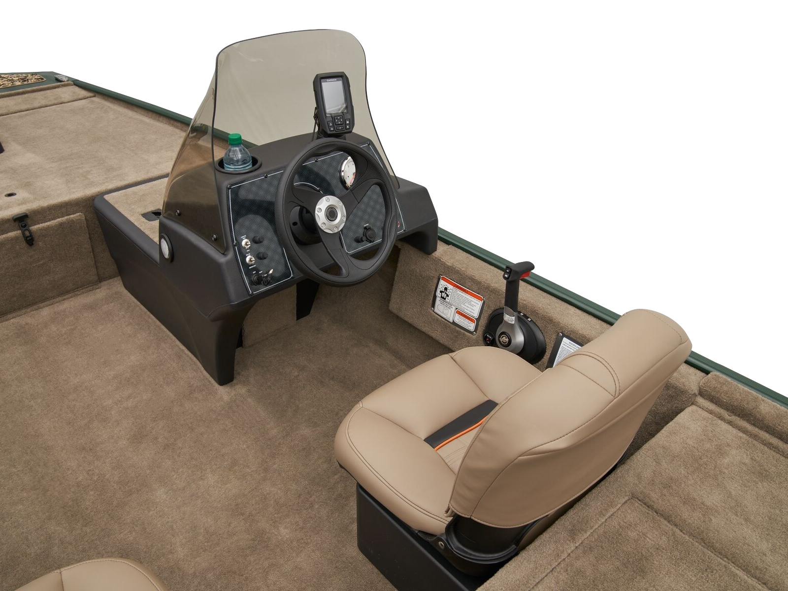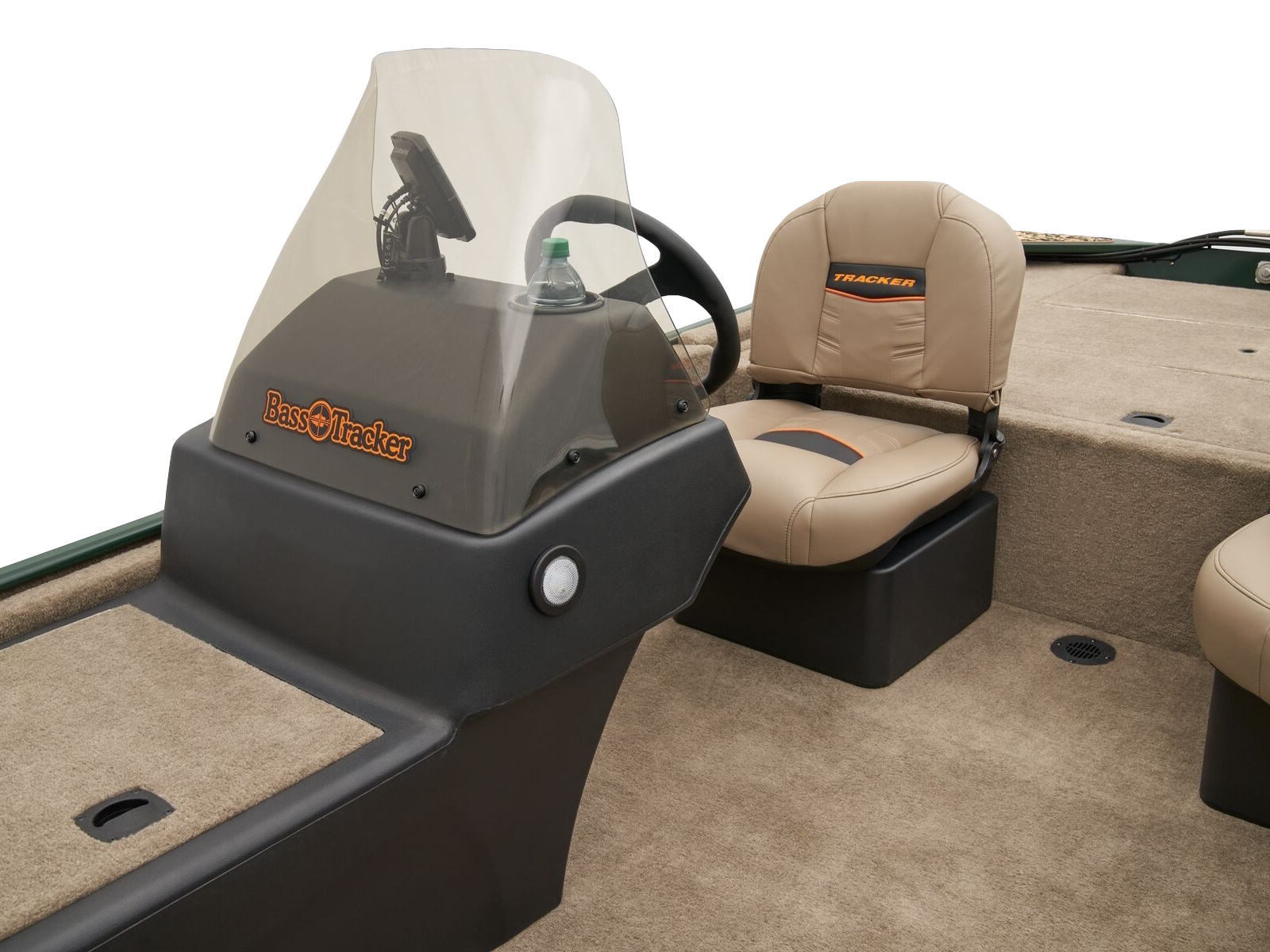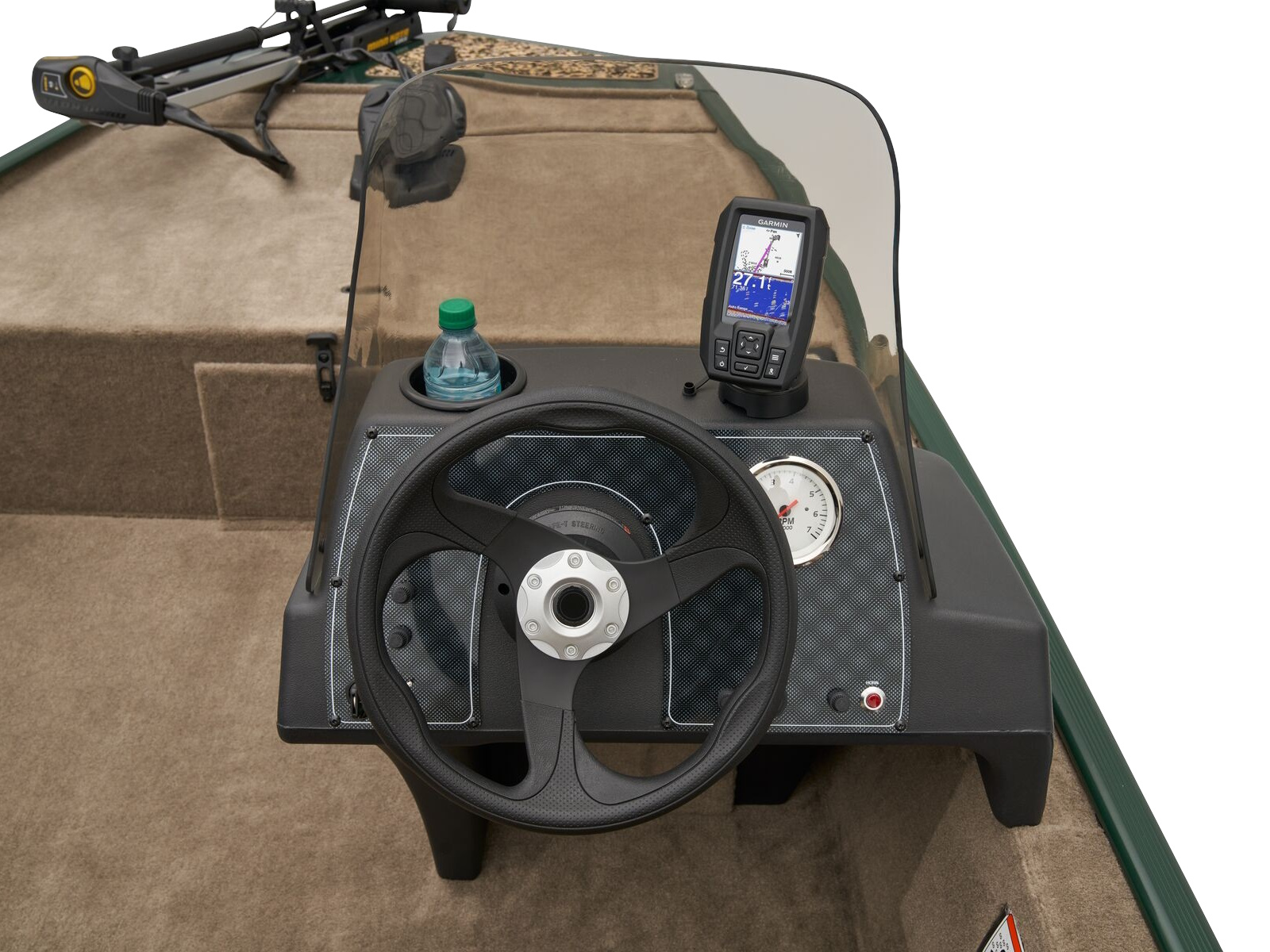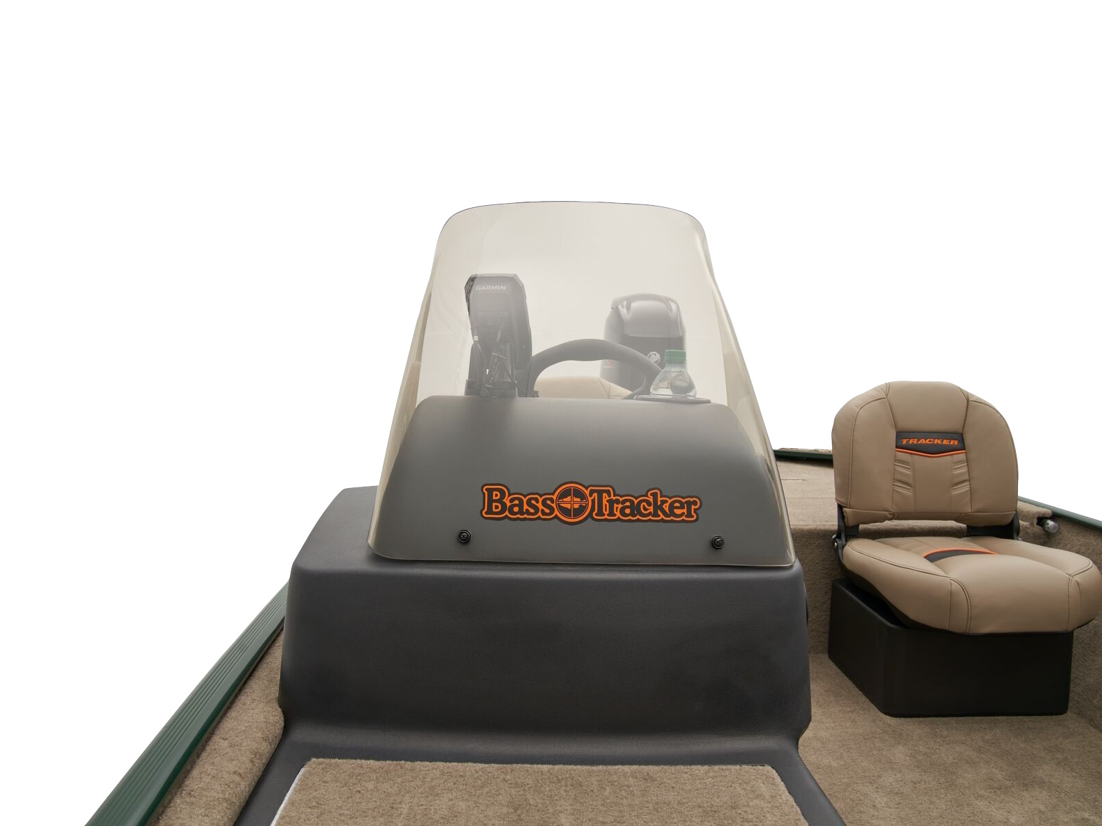 • 1-piece rotomolded console w/tinted windscreen, integrated livewell, drink holder & 12V outlet