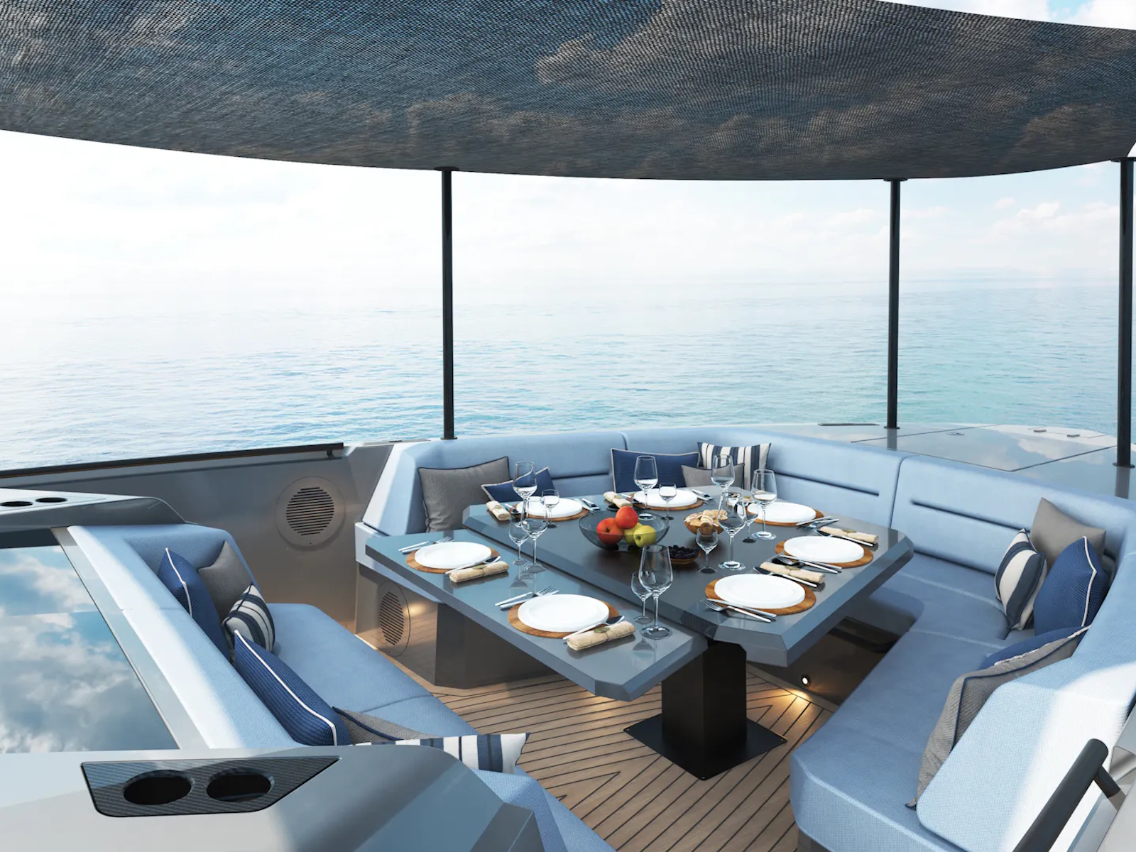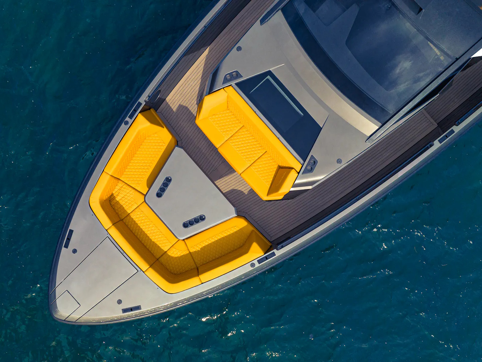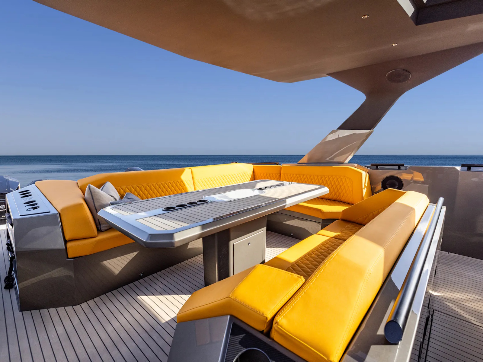 With quint Mercury 600 hp (V12) outboard engines, the speed can reach up to 70 knots. Also available with twin Nanni N16 1200 hp (V8) inboard diesels and waterjets, giving an appropriate top speed of 50 knots. The VQ55 Sports Line is the fastest yacht in its class. To regulate the turbulence in the cockpit at high speed, the sides of the VQ55 are equipped with adjustable air vents.