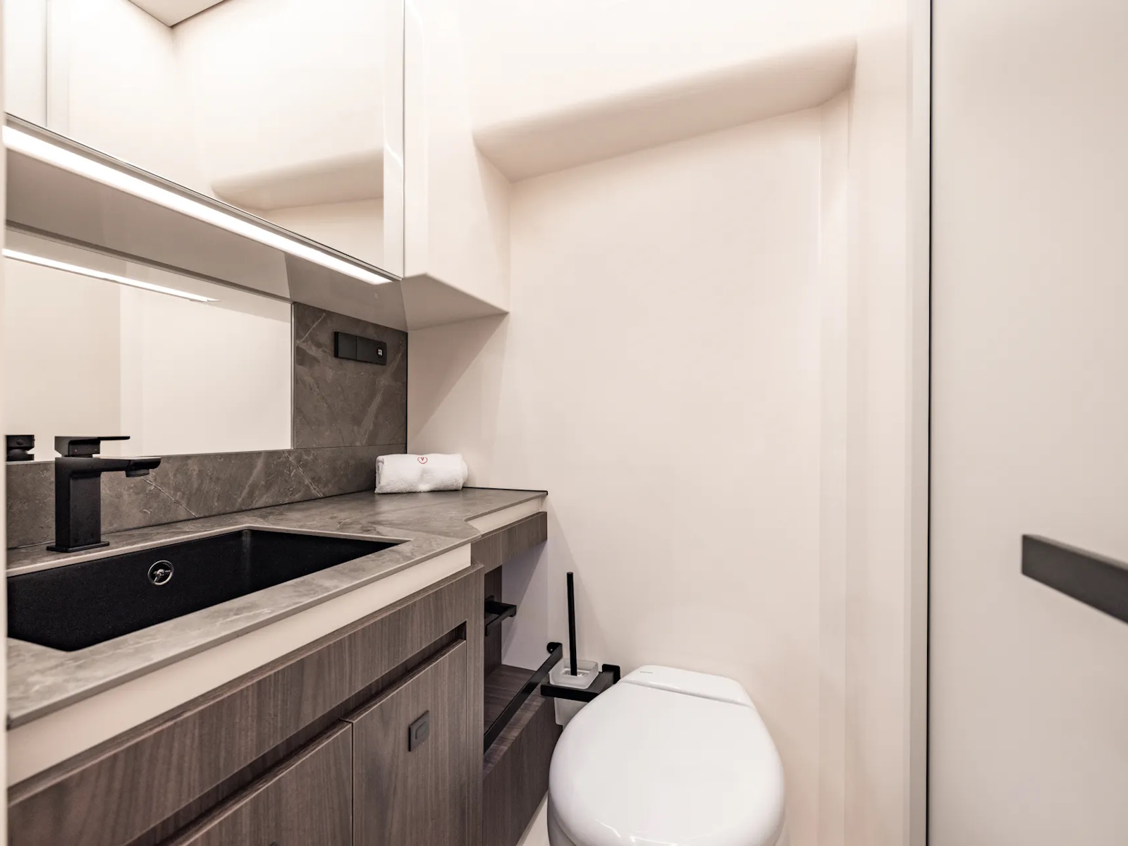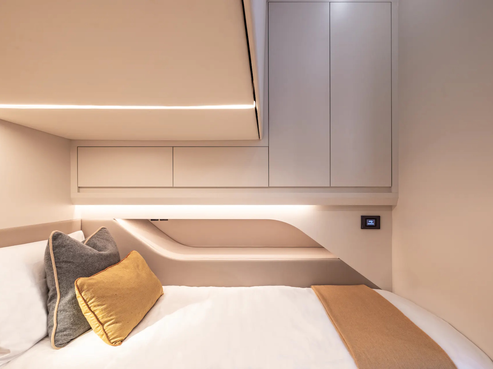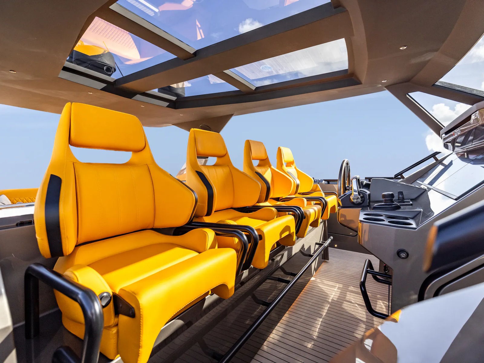 With quint Mercury 600 hp (V12) outboard engines, the speed can reach up to 70 knots. Also available with twin Nanni N16 1200 hp (V8) inboard diesels and waterjets, giving an appropriate top speed of 50 knots. The VQ55 Sports Line is the fastest yacht in its class. To regulate the turbulence in the cockpit at high speed, the sides of the VQ55 are equipped with adjustable air vents.