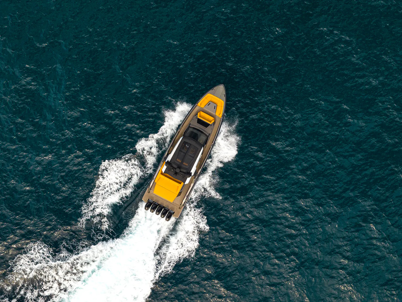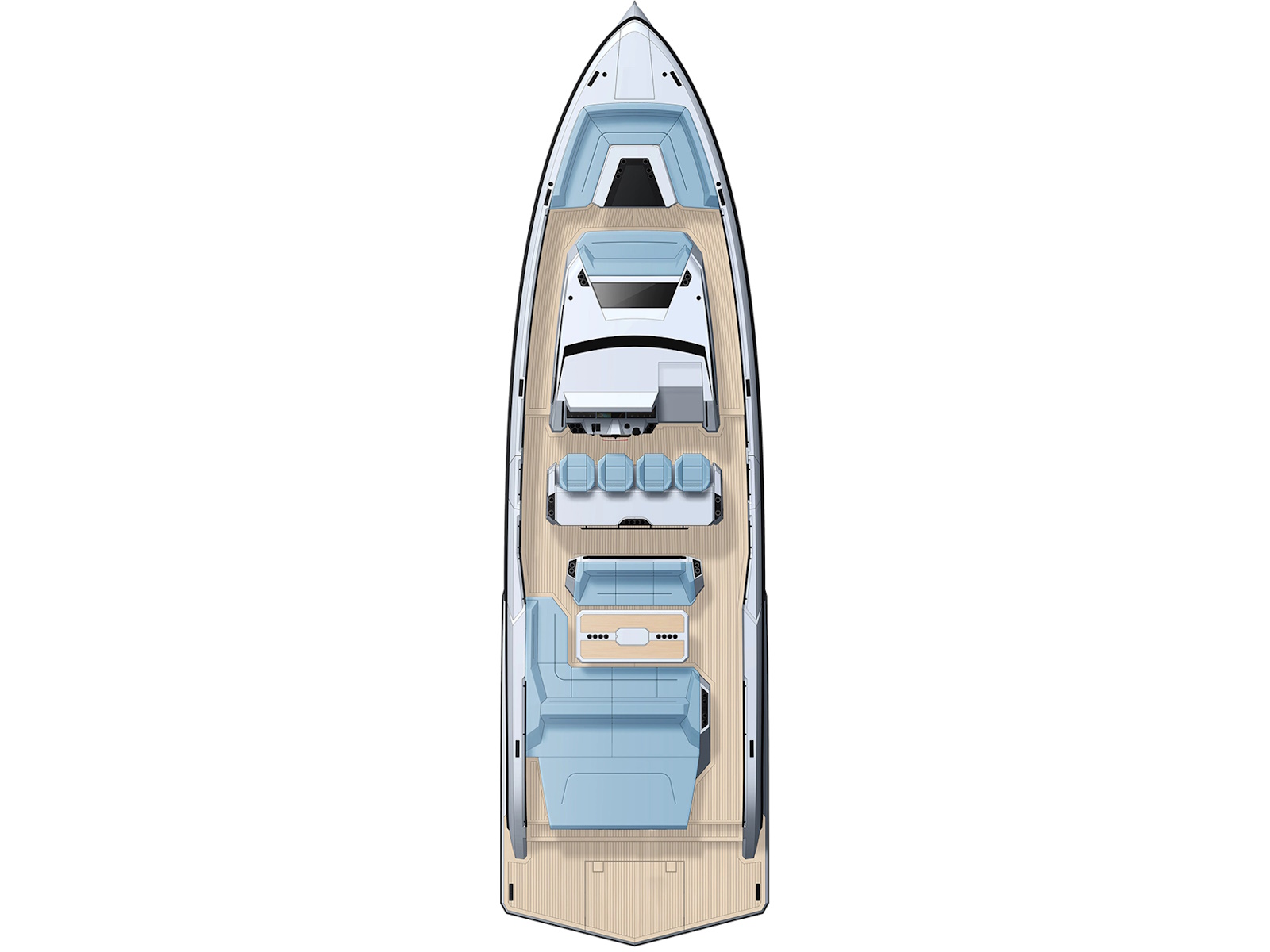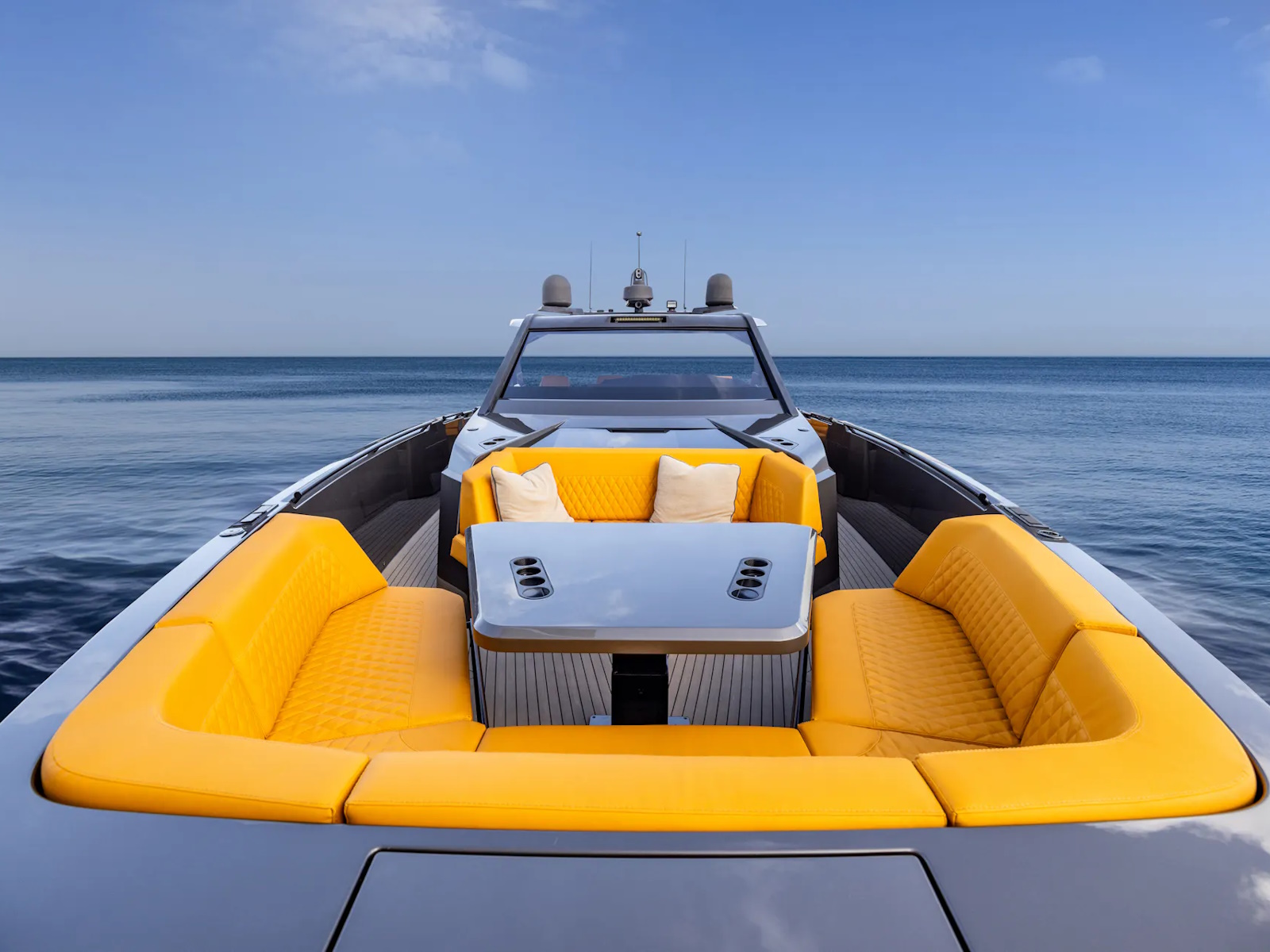 Designer Guido de Groot and our engineers went to work on stretching the VQ40 to a VQ55, devising a sensational centre-console boat. Twin 1200 horsepower diesels with waterjets will have you riding the waves at 50+ knots and you’ll also be able to head into very shallow waters and beach up on the sand. Moreover, waterjets are also known to be the safest propulsion system for swimmers. In addition, the Vanquish developers are creating a stepped hull outboard version which we are developing mainly for the US and Middle East markets. This will open up the potential for a Veloce model and with four or five Mercury V12 600hp outboard engines your speed will be over 70 knots! There’s no other lifestyle sports yacht of this size that is capable of outperforming the VQ55’s speed.