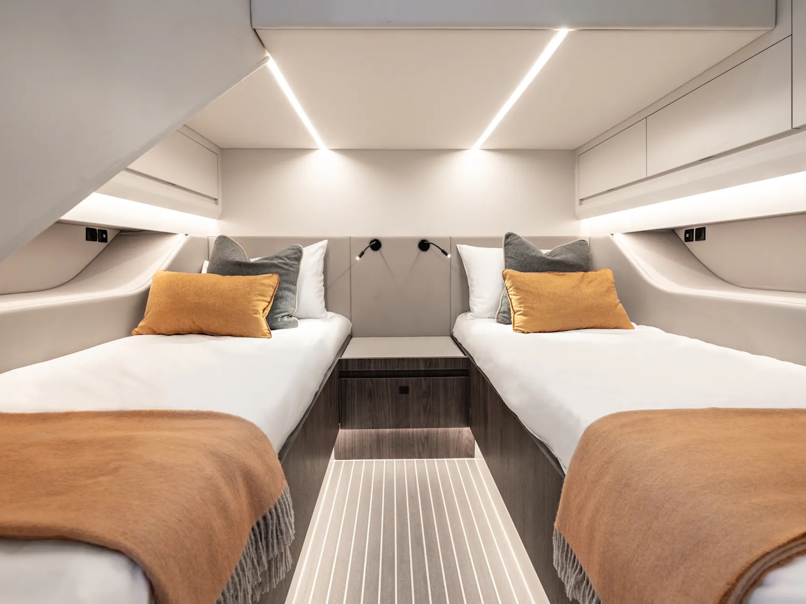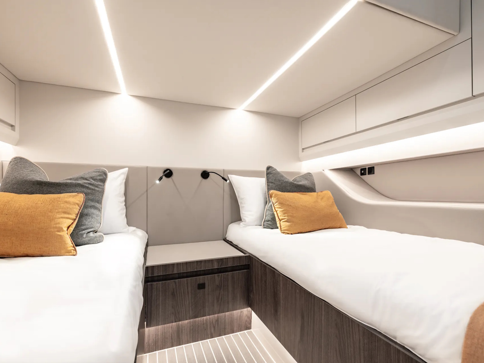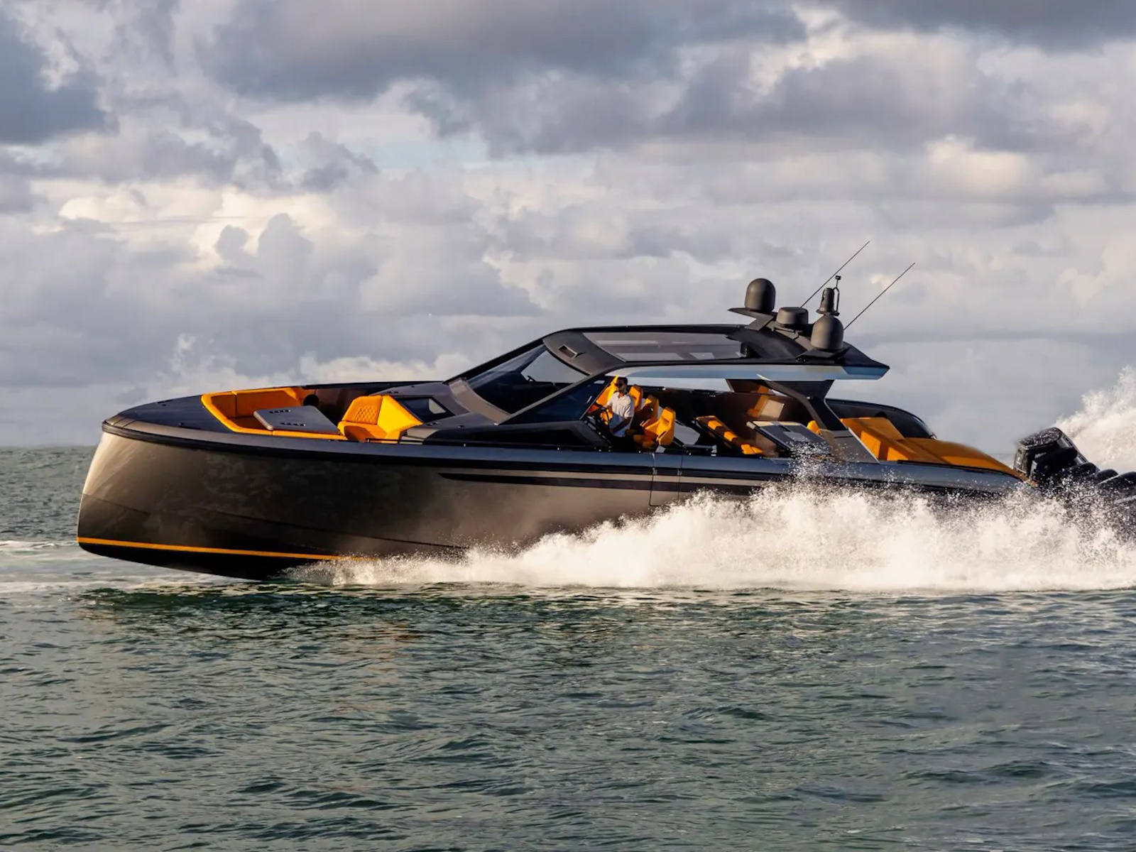 Designer Guido de Groot and our engineers went to work on stretching the VQ40 to a VQ55, devising a sensational centre-console boat. Twin 1200 horsepower diesels with waterjets will have you riding the waves at 50+ knots and you’ll also be able to head into very shallow waters and beach up on the sand. Moreover, waterjets are also known to be the safest propulsion system for swimmers. In addition, the Vanquish developers are creating a stepped hull outboard version which we are developing mainly for the US and Middle East markets. This will open up the potential for a Veloce model and with four or five Mercury V12 600hp outboard engines your speed will be over 70 knots! There’s no other lifestyle sports yacht of this size that is capable of outperforming the VQ55’s speed.