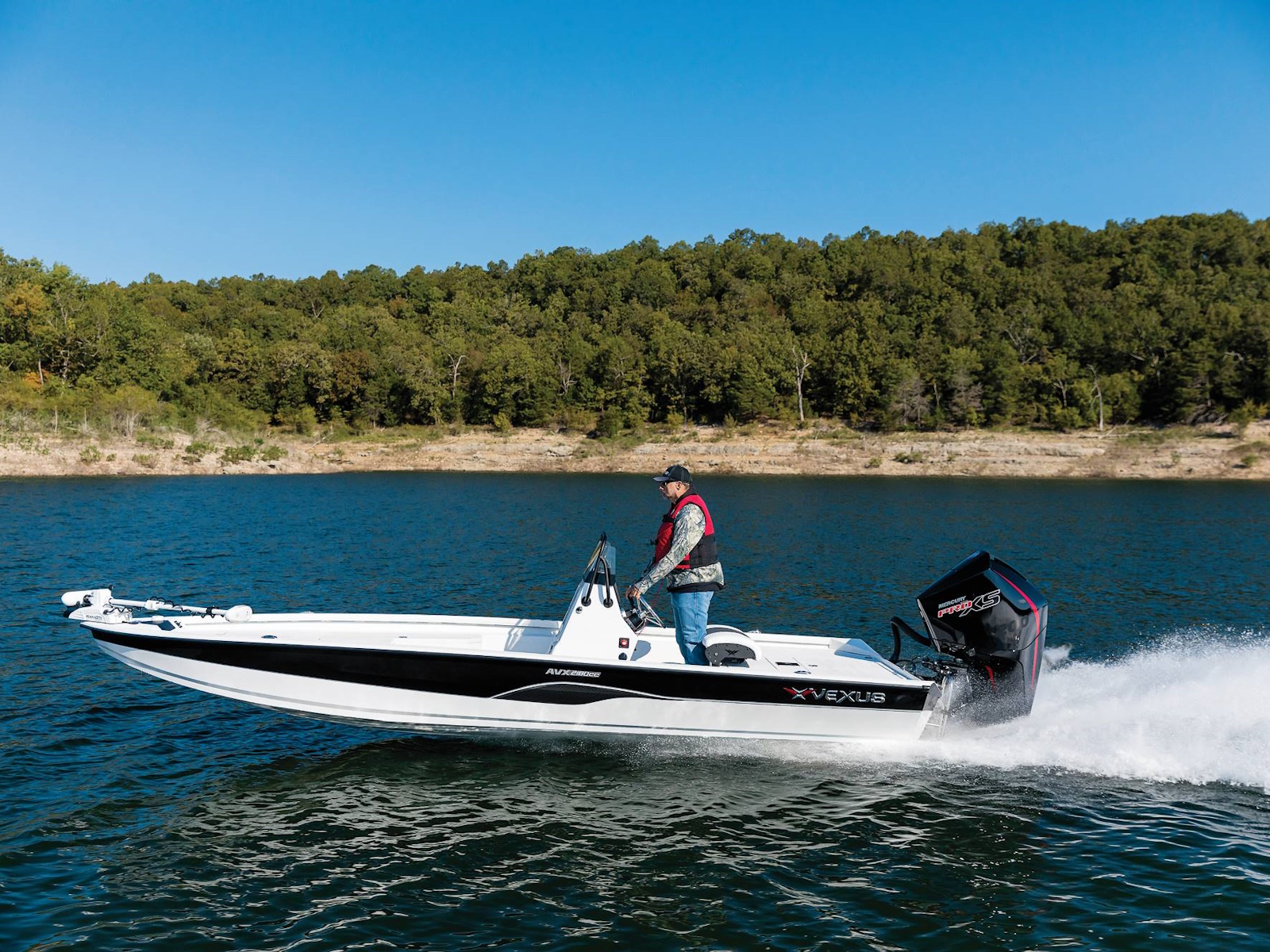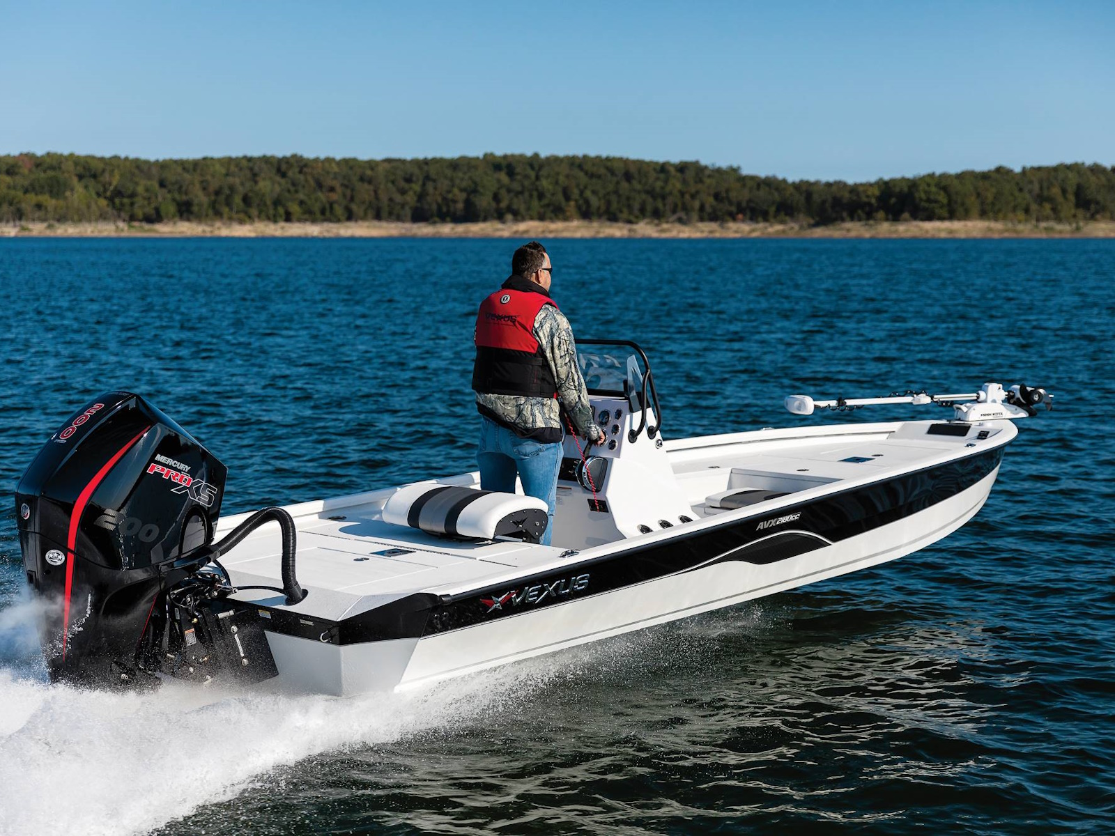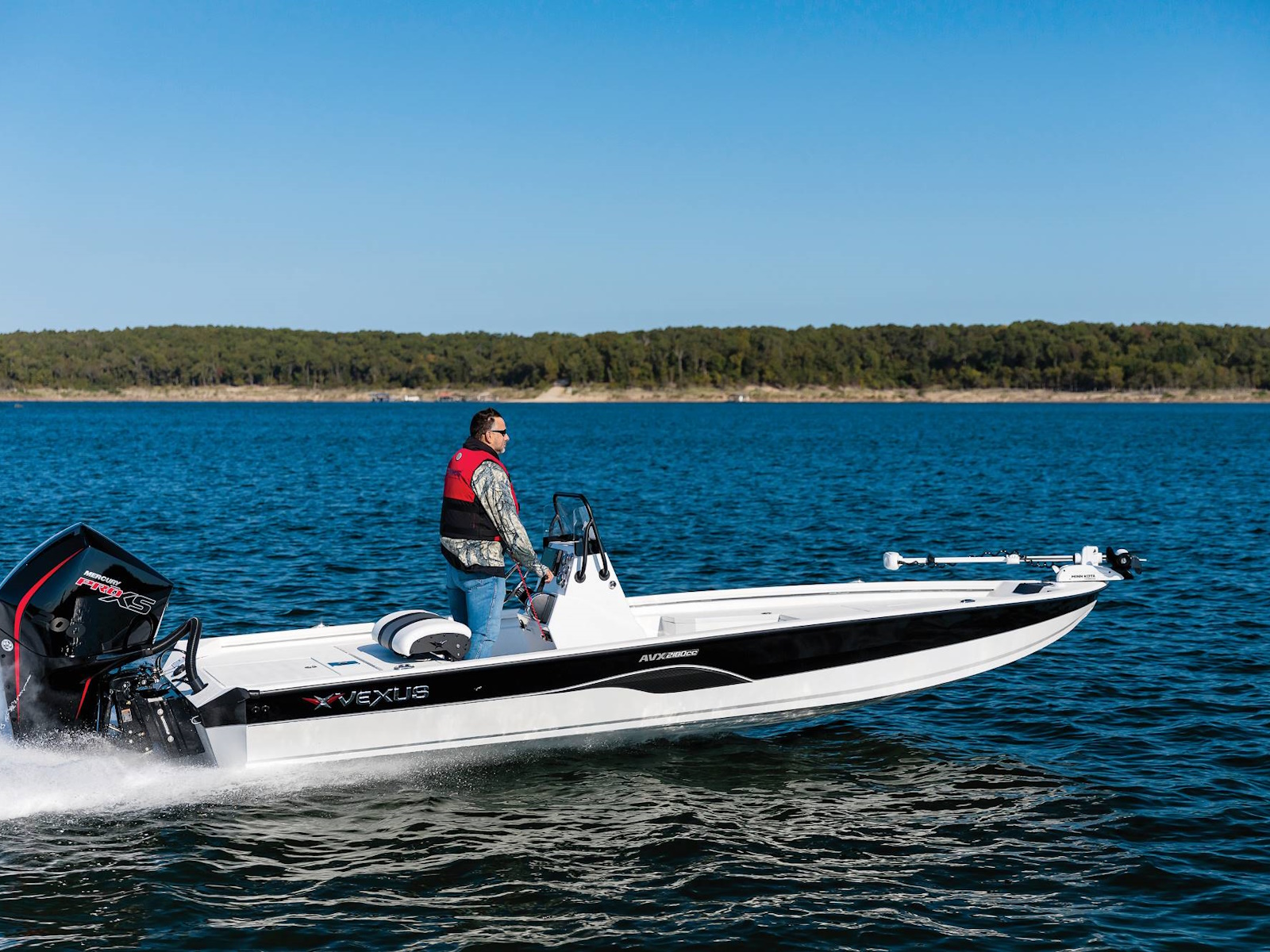 On the rear deck, the huge fiberglass livewell includes recirculating aeration, an anti-splash ring, and pump-out. Looking farther aft, the rear power compartment showcases a neat, clean, and wide-open interior arranged for easy access to pumps and other equipment. The stern of the 2180cc also includes a full transom with no splash well. It’s a custom-engineered feature creating even more space on the rear deck while delivering the ultimate platform to work fish side to side and bow to stern. Coupled with our exclusive Tru-Trek™ skid resistant floor surface as well as fold-down jump seats, multi-position leaning post, on-board battery charger, upright, level foam flotation, an All-Welded, Dense Base™ superstructure, tandem axle aluminum trailer built in our own plant, and available shallow water anchors (single or dual), this is the ultra-nimble AVX2180cc.
