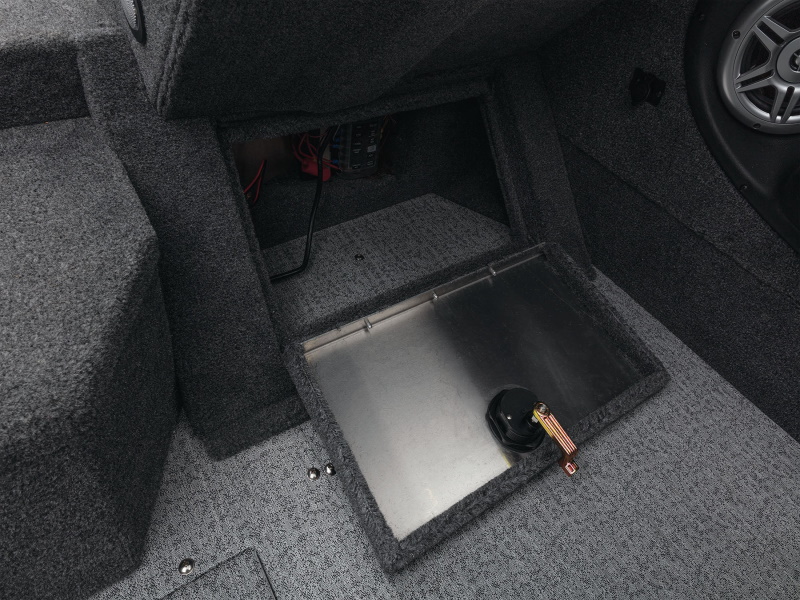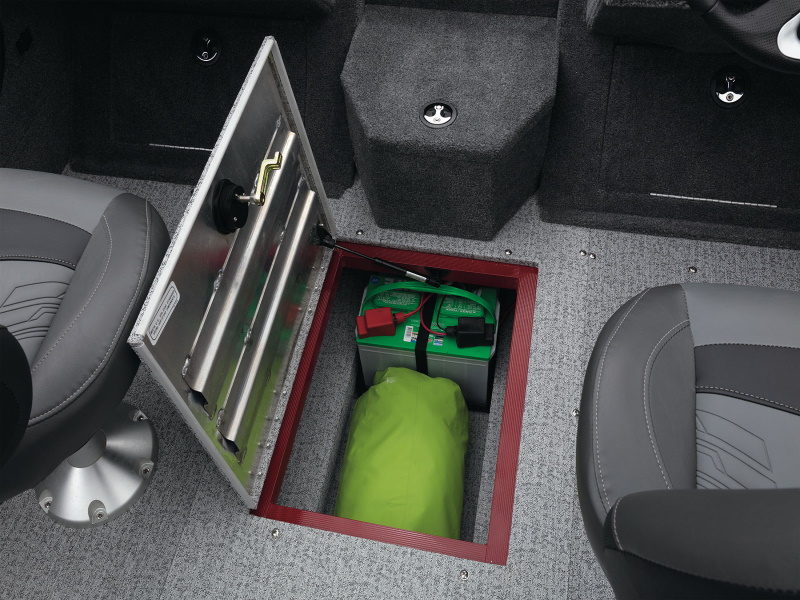 - In-floor center trolling battery storage compartment for up to 3 batteries